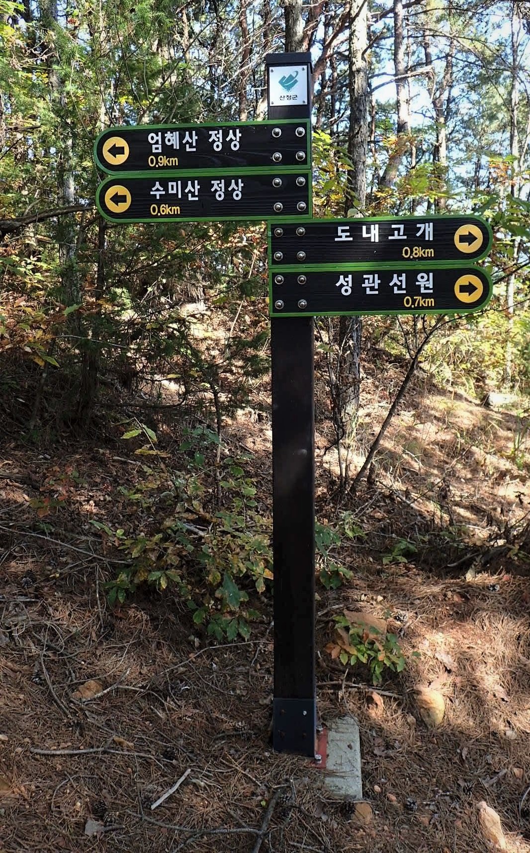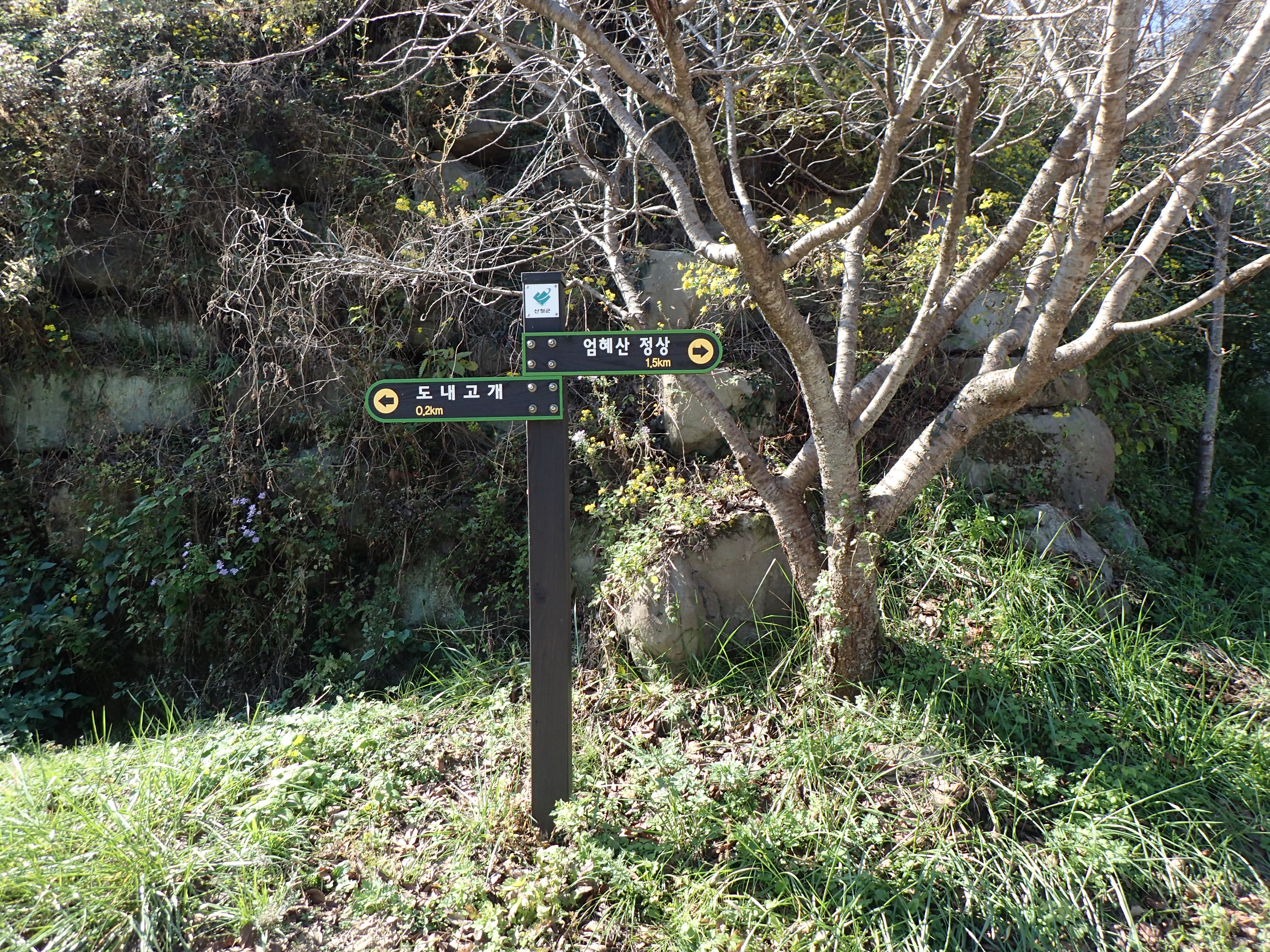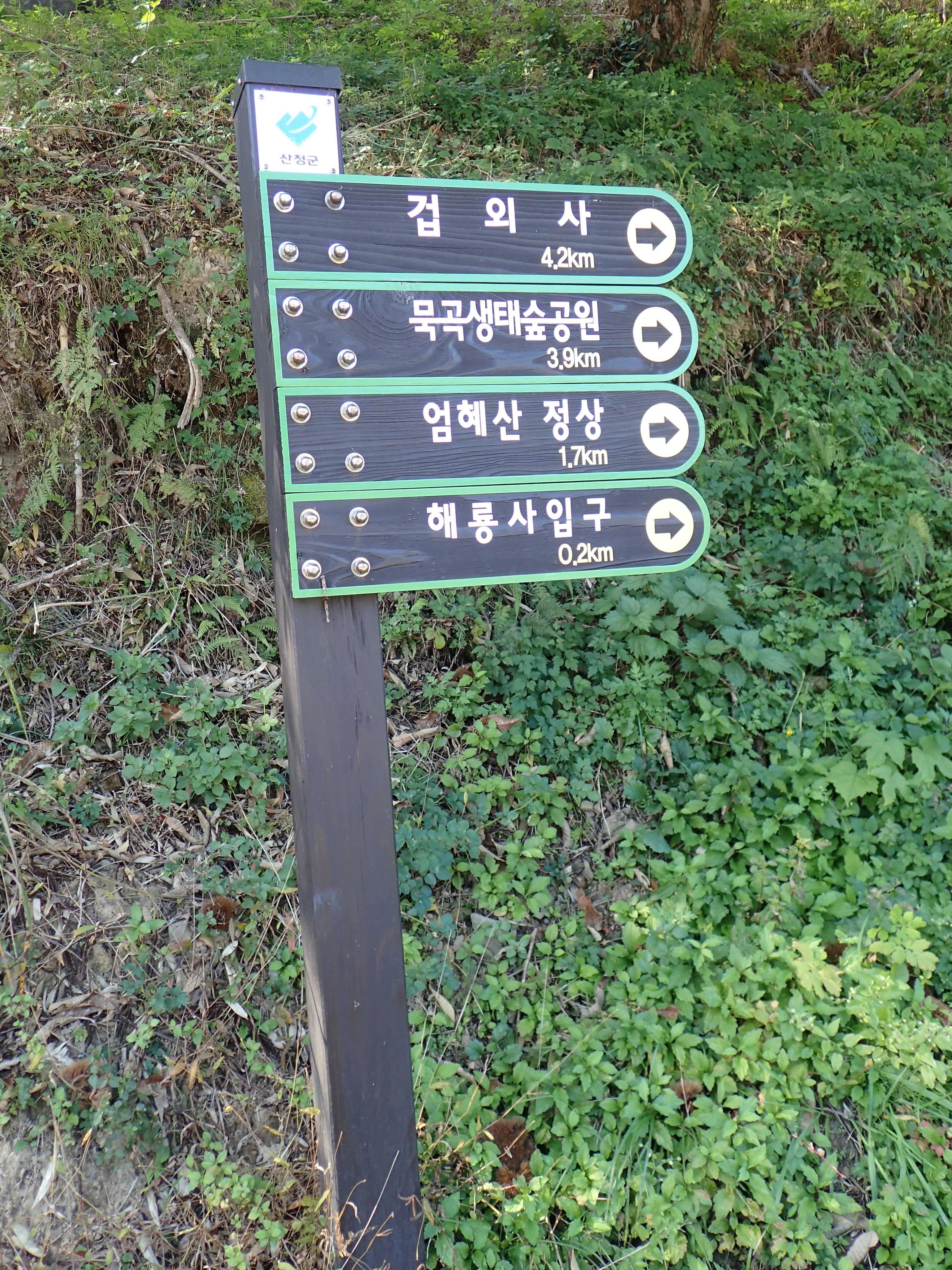 엄혜산 정상 1.1km·도내고개 2.8km·겁외사 3.6km·묵곡생태숲공원 3.3km를 가리키는데,
