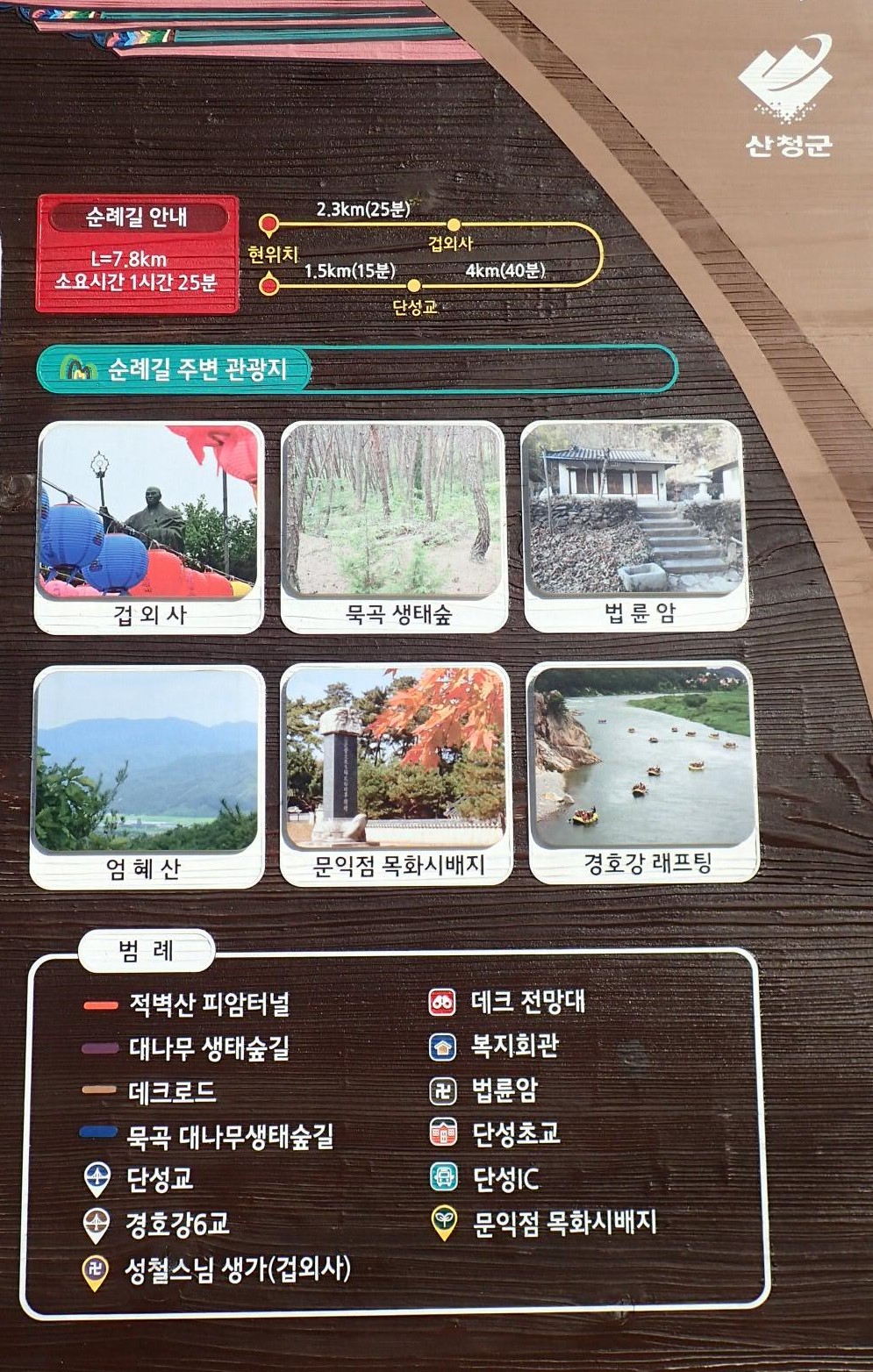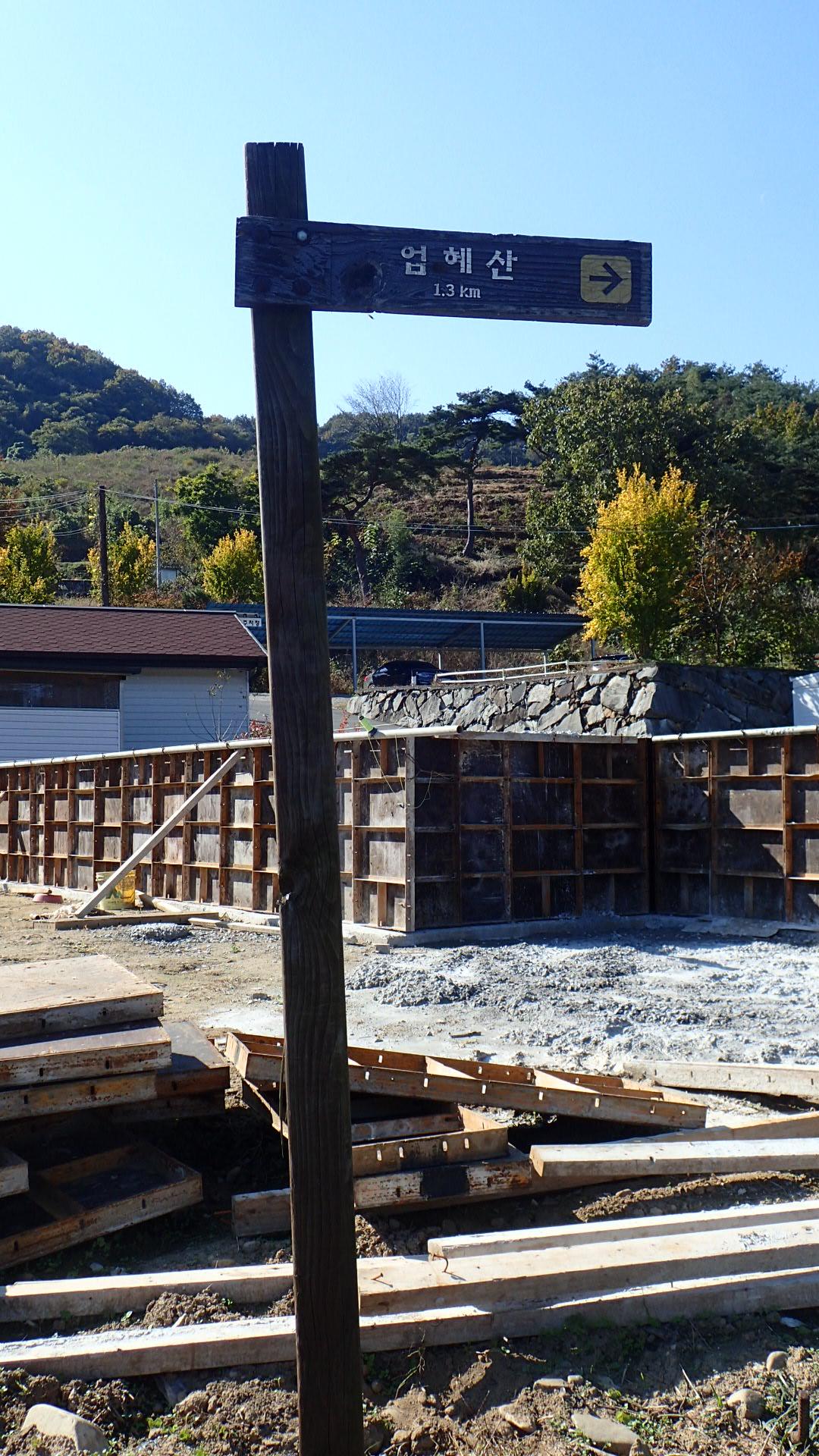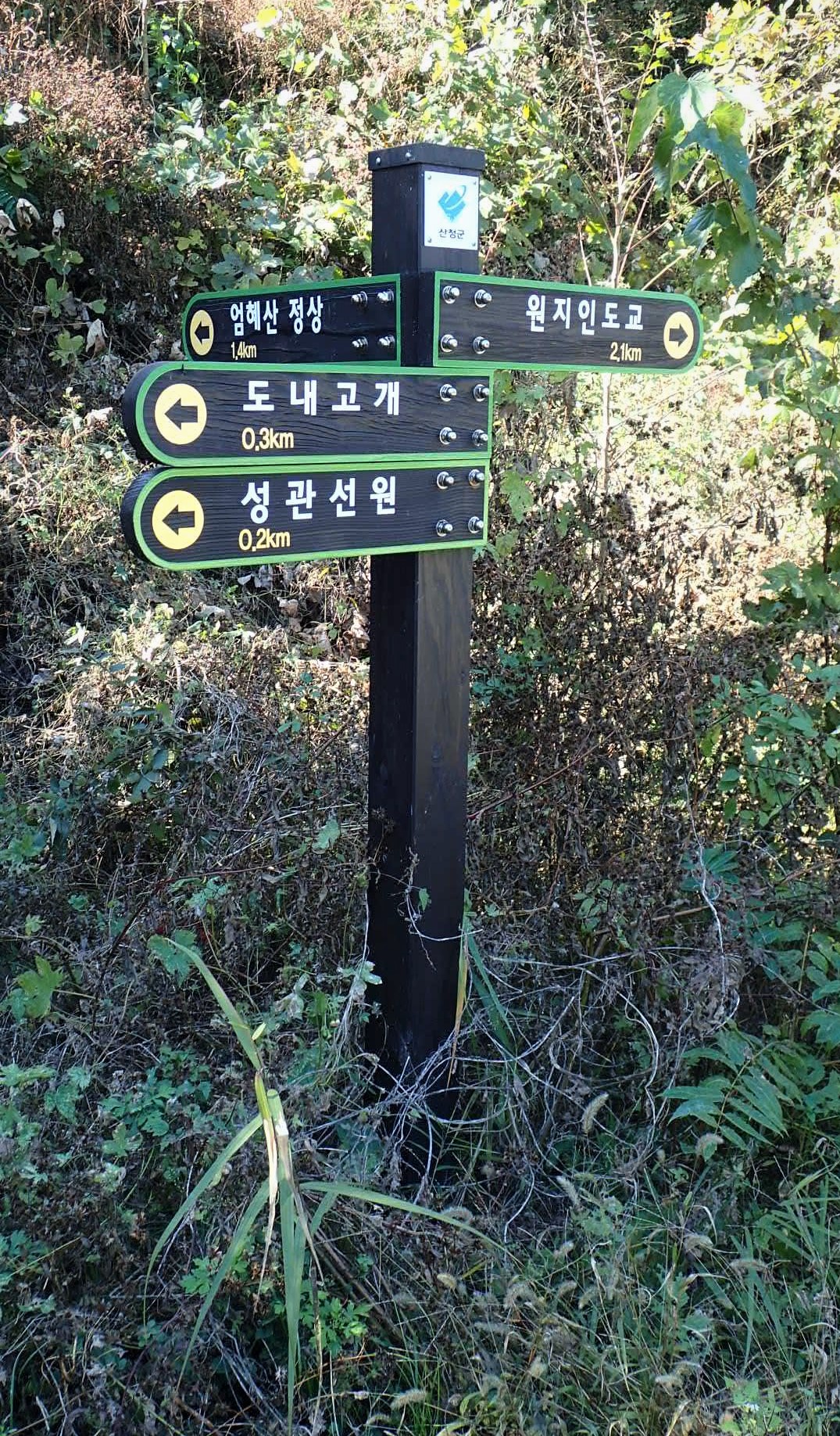 엄혜산 정상 1.1km·도내고개 2.8km·겁외사 3.6km·묵곡생태숲공원 3.3km를 가리키는데,