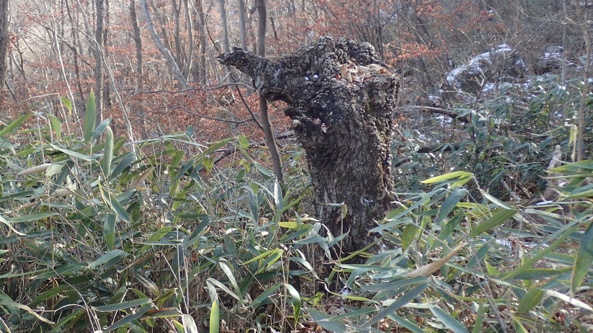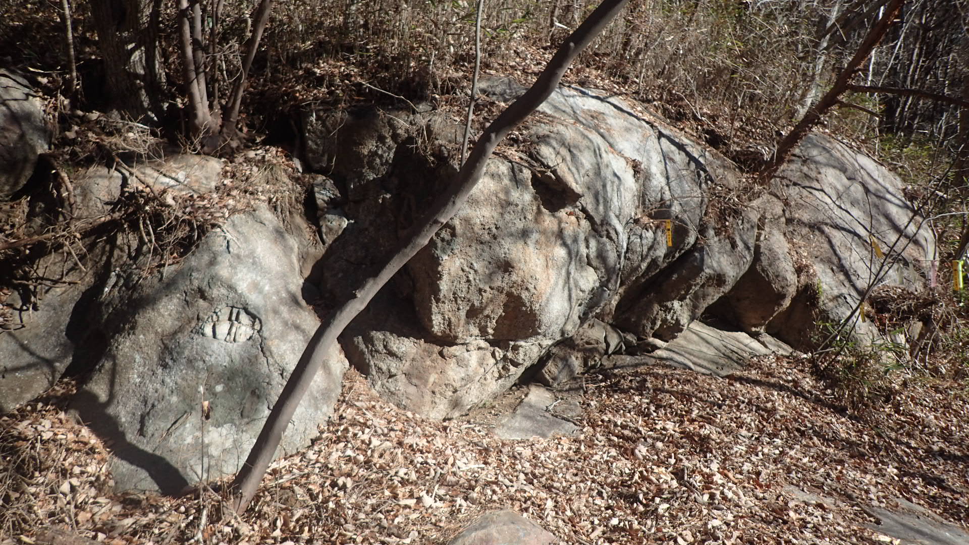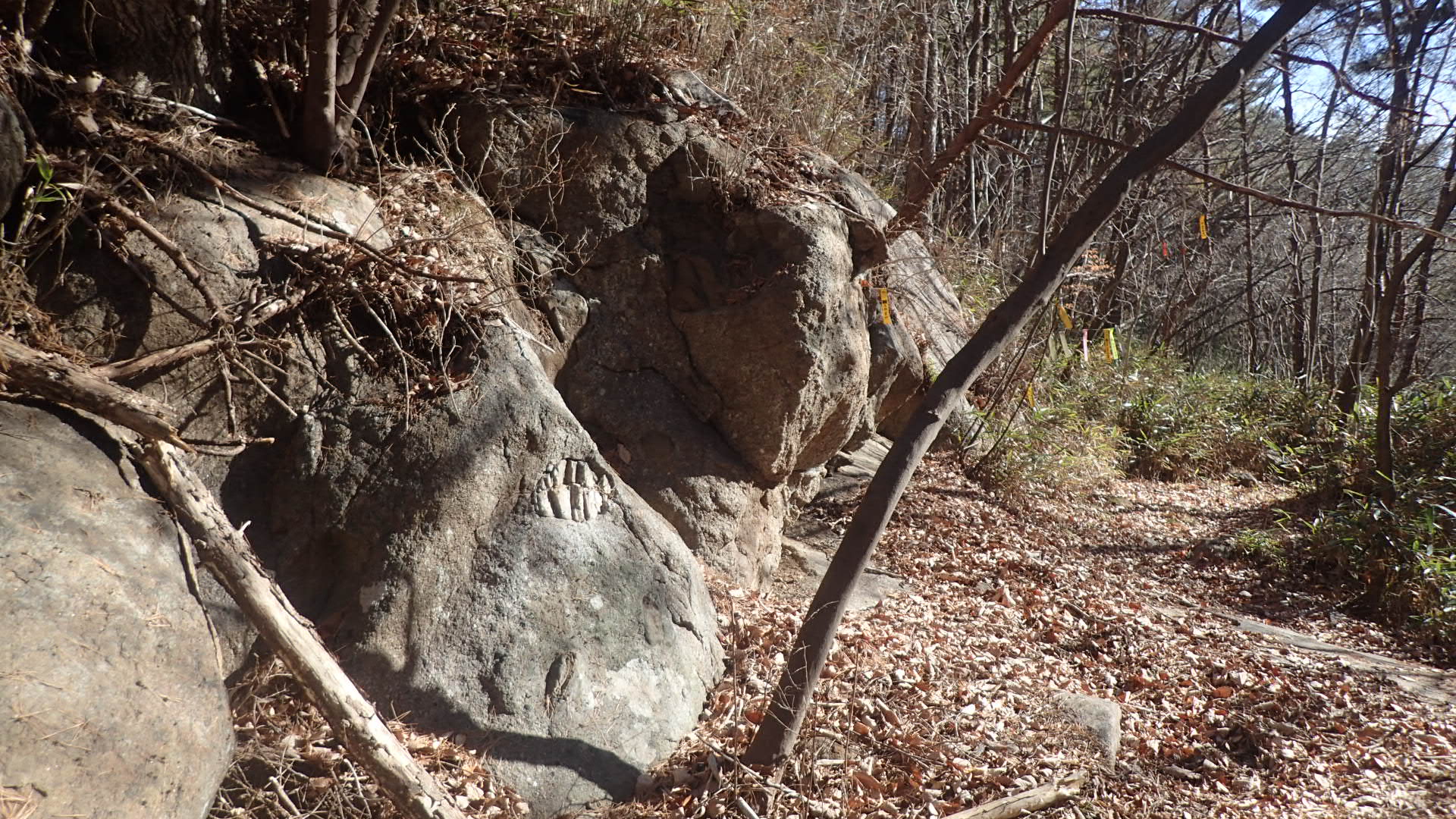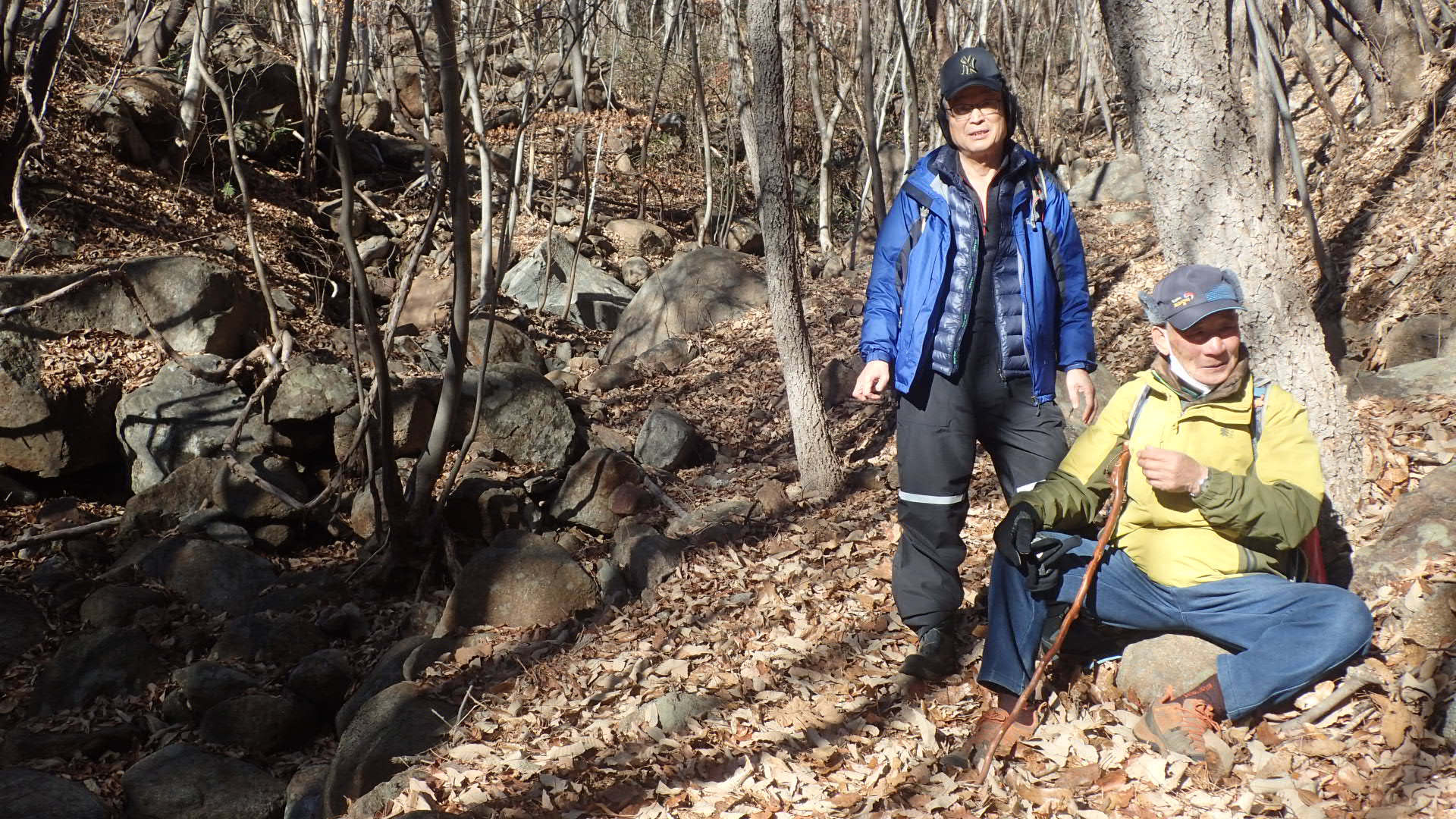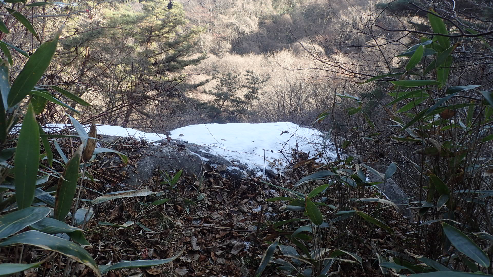 맨 아래 낙엽이 흩어져 있는 비교적 평탄한 바위의 왼쪽 끄트머리 부분,
