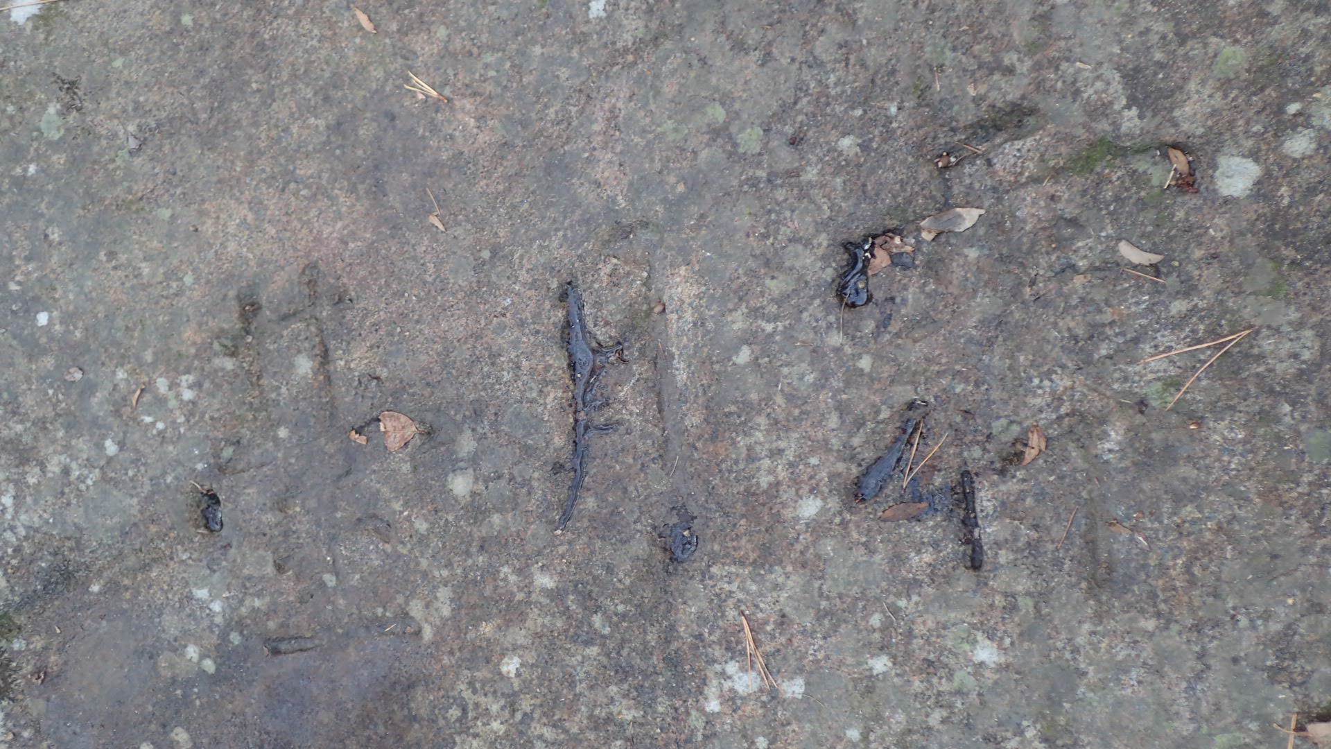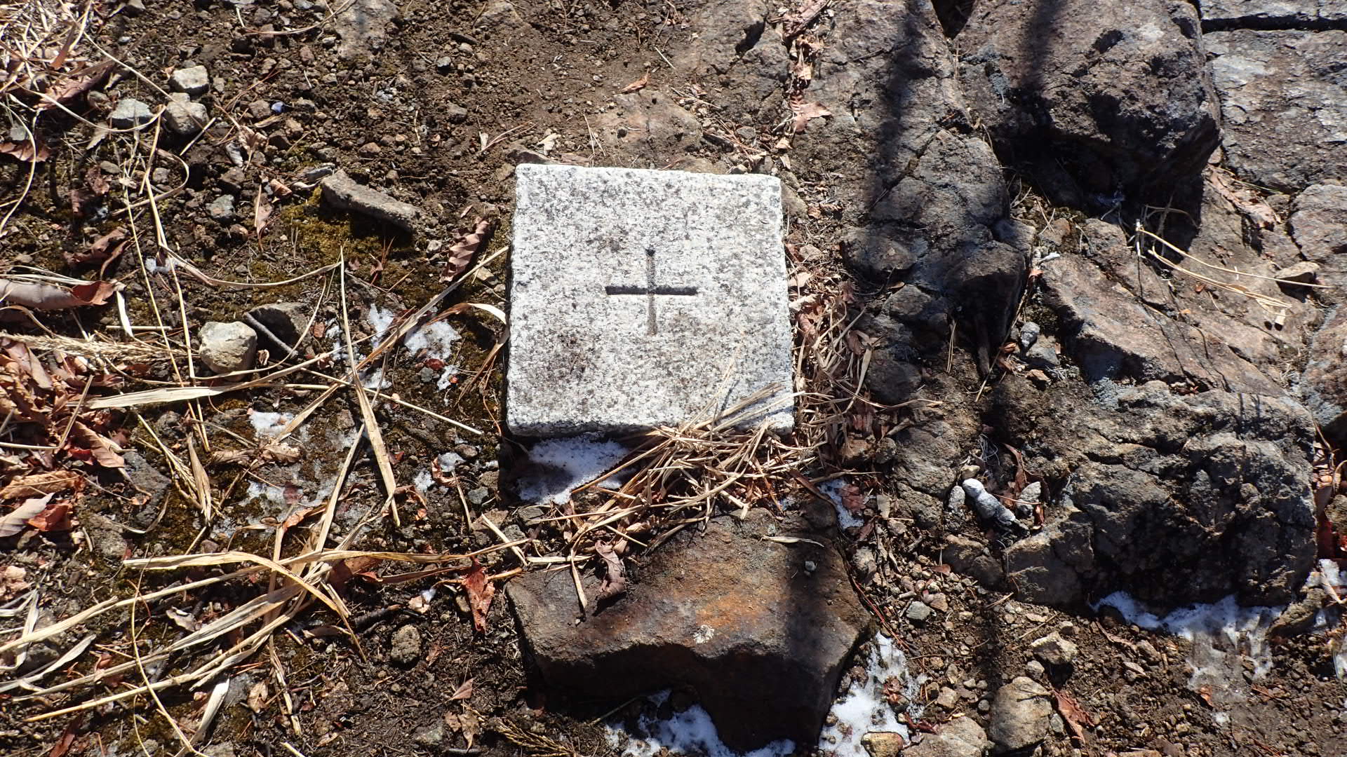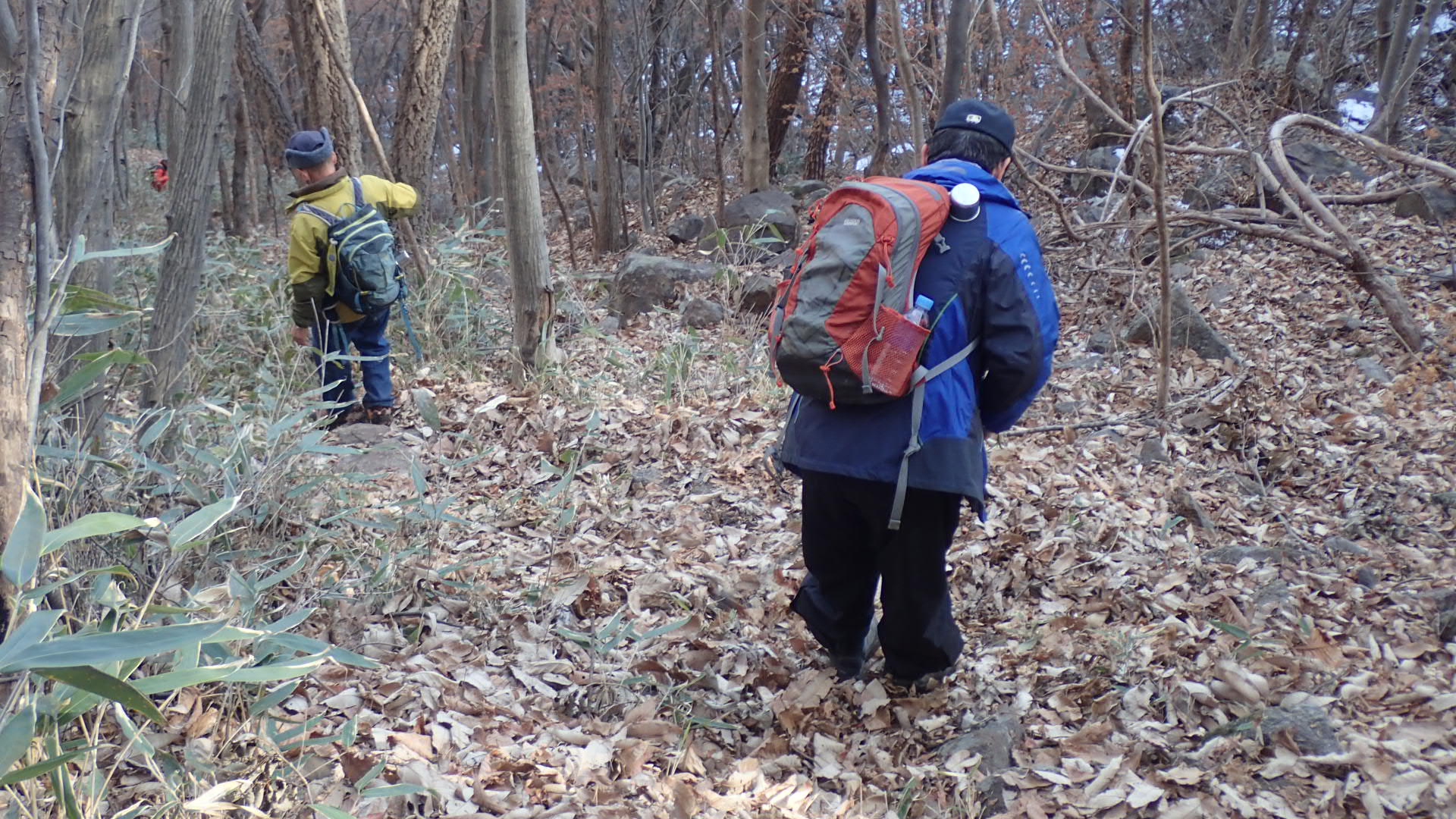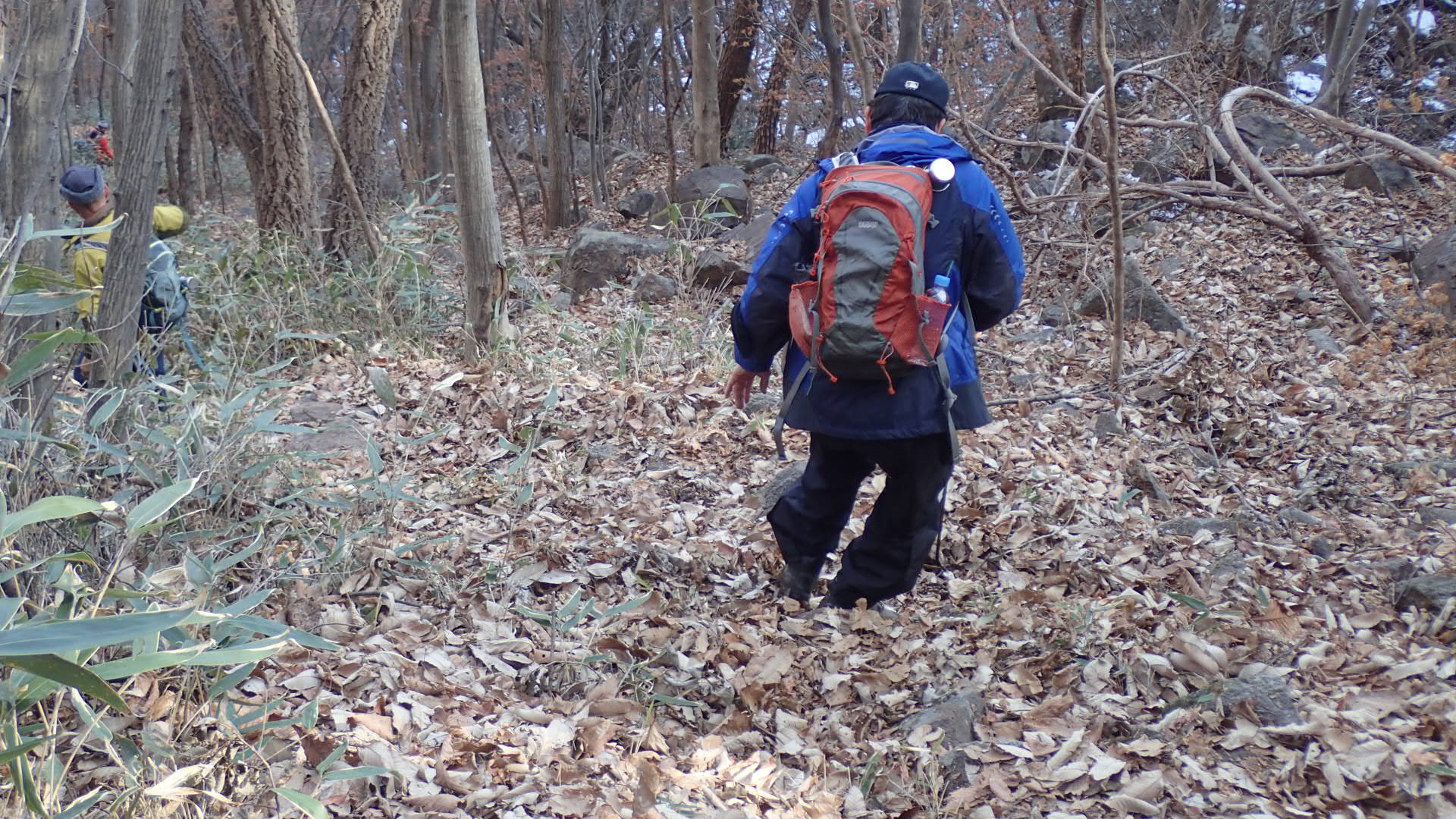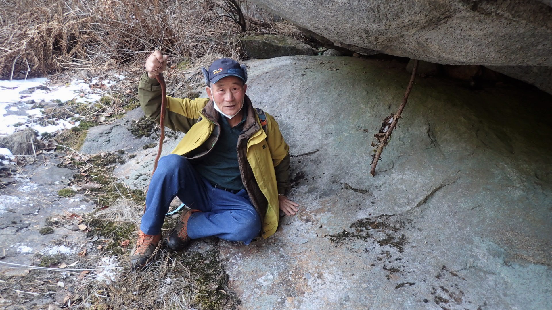 맨 아래 낙엽이 흩어져 있는 비교적 평탄한 바위의 왼쪽 끄트머리 부분,