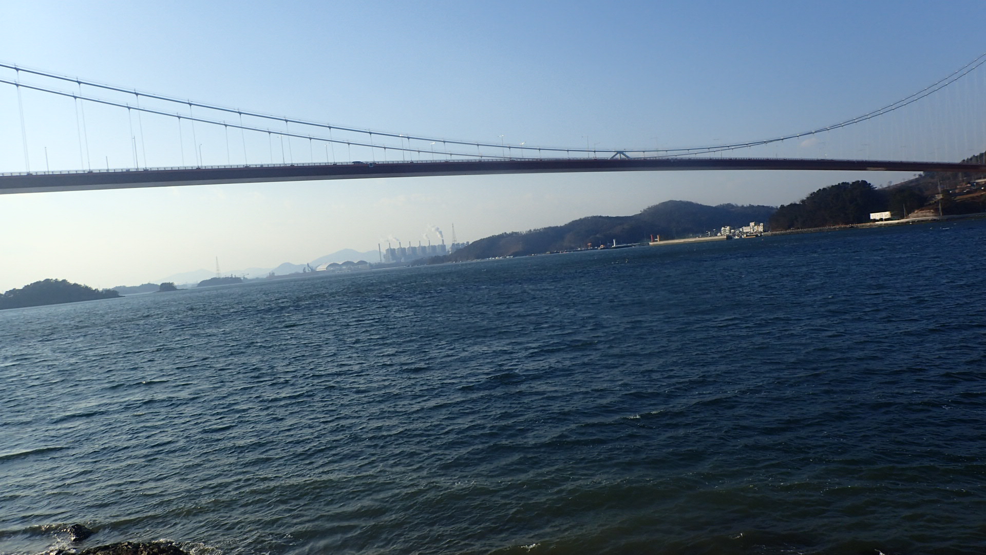 국내에서 가장 긴 3경간(徑間) 2힌지(hinge경첩) 보강형 현수교(懸垂橋)이다.