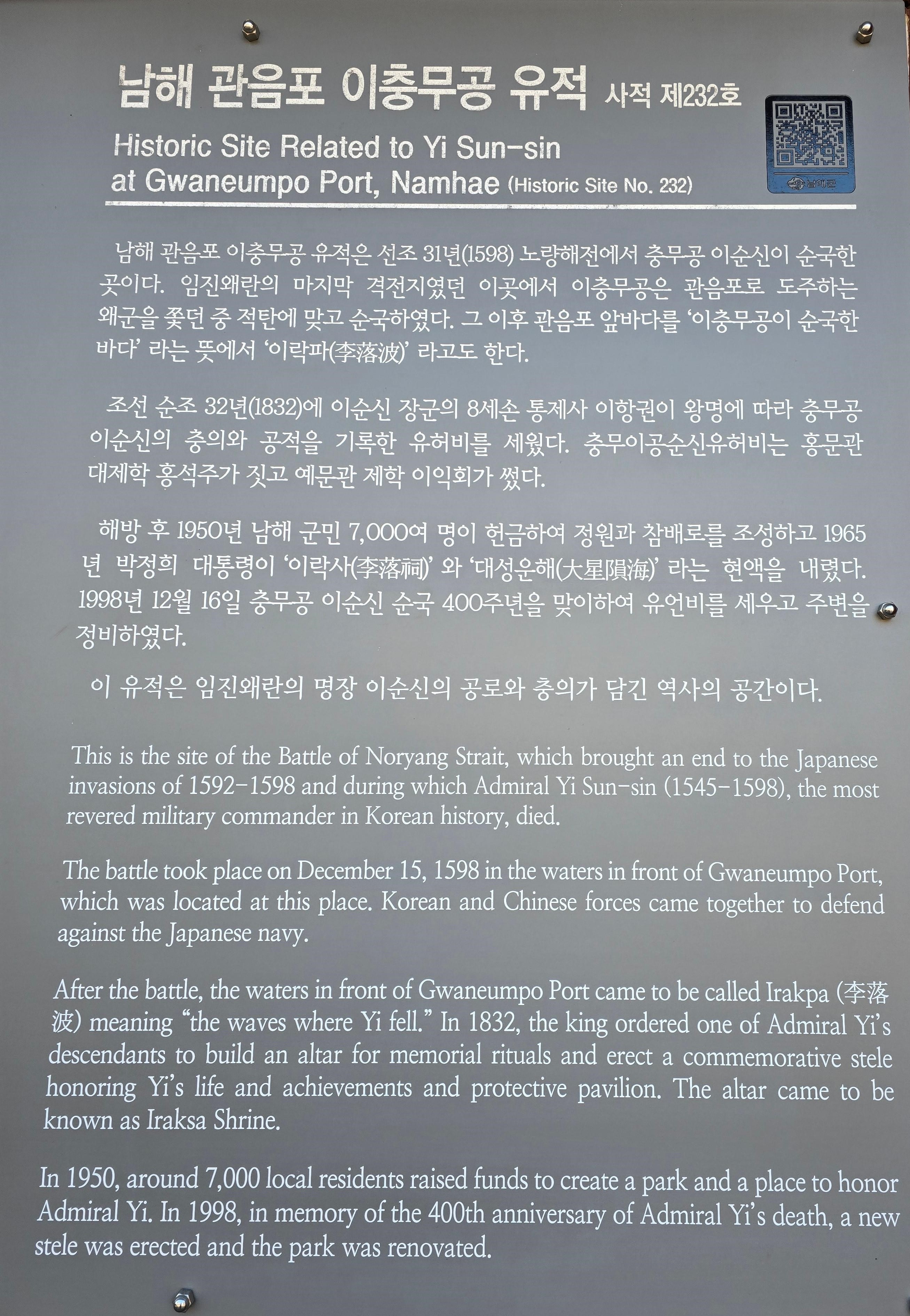 임진왜란 당시 노량해전이 일어났던 장소로,