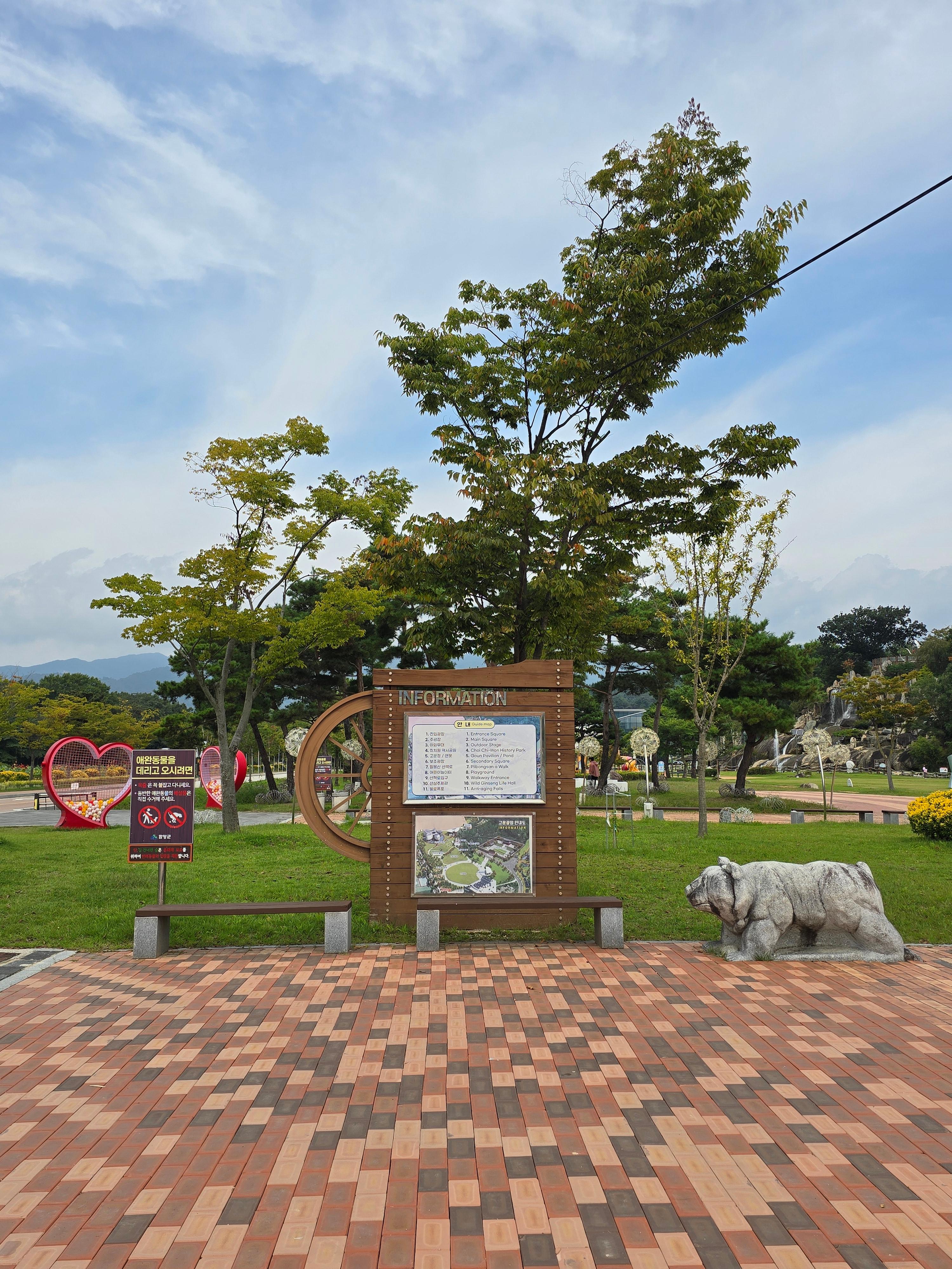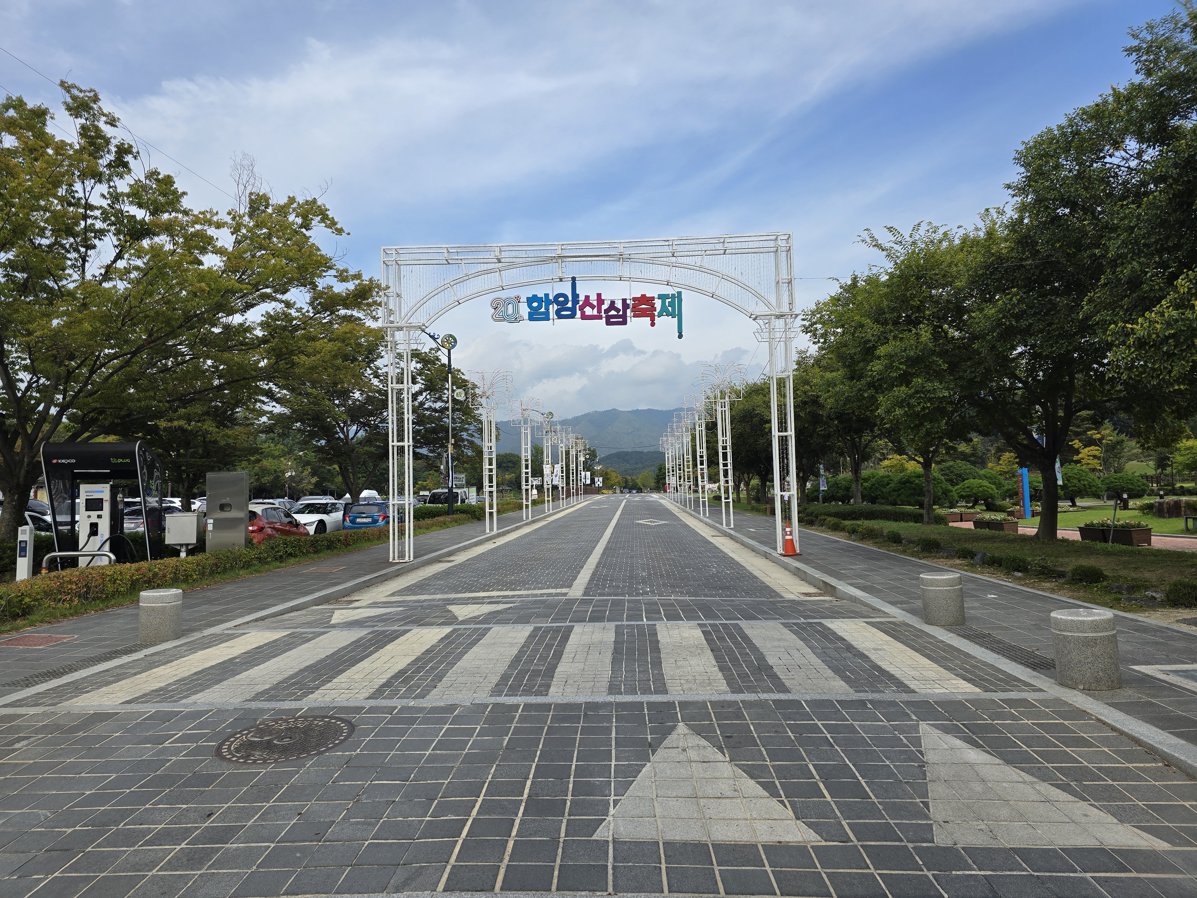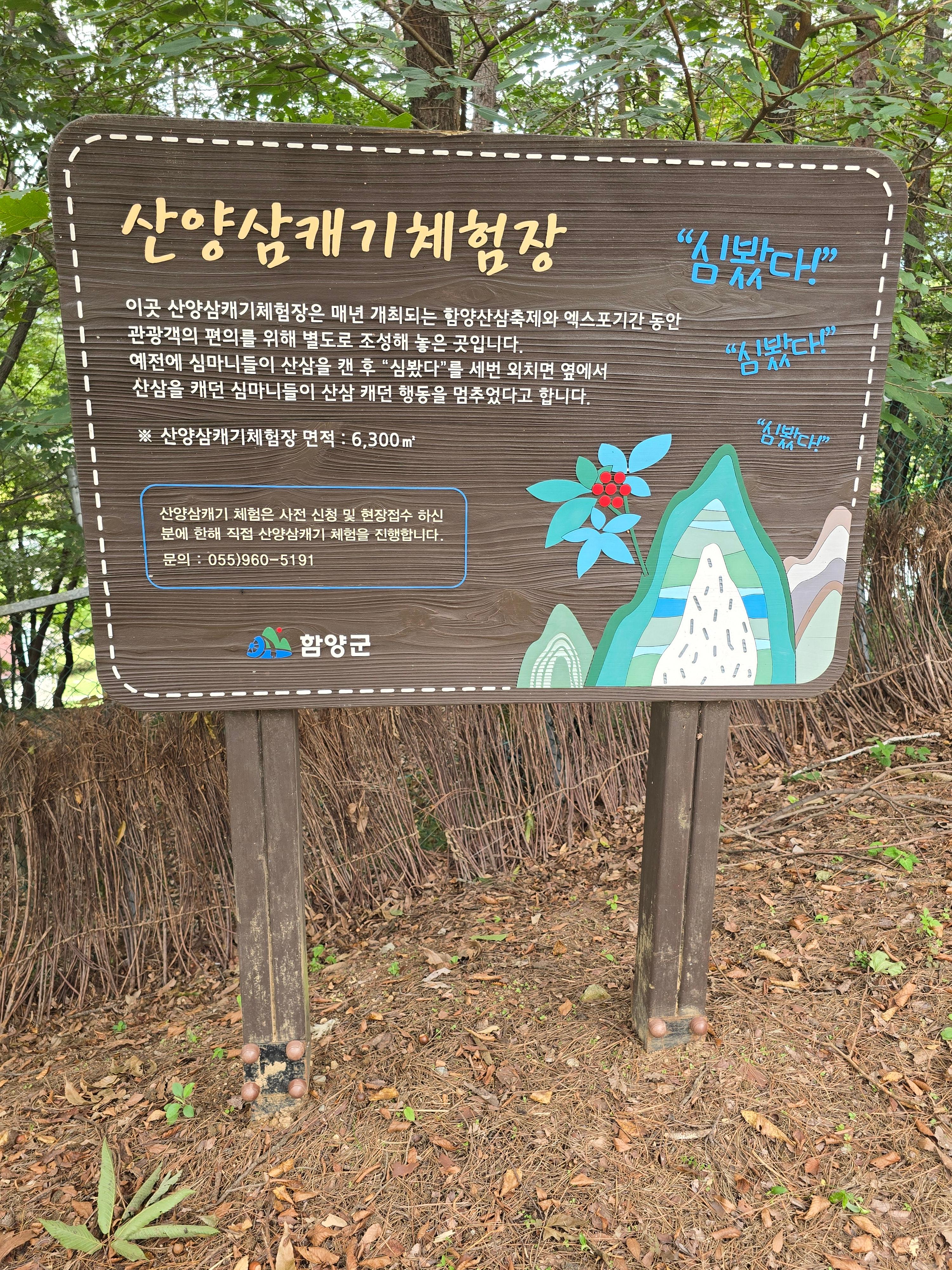 상림공원주차장에서 함양 캐릭터 물레동자와 산삼을 든