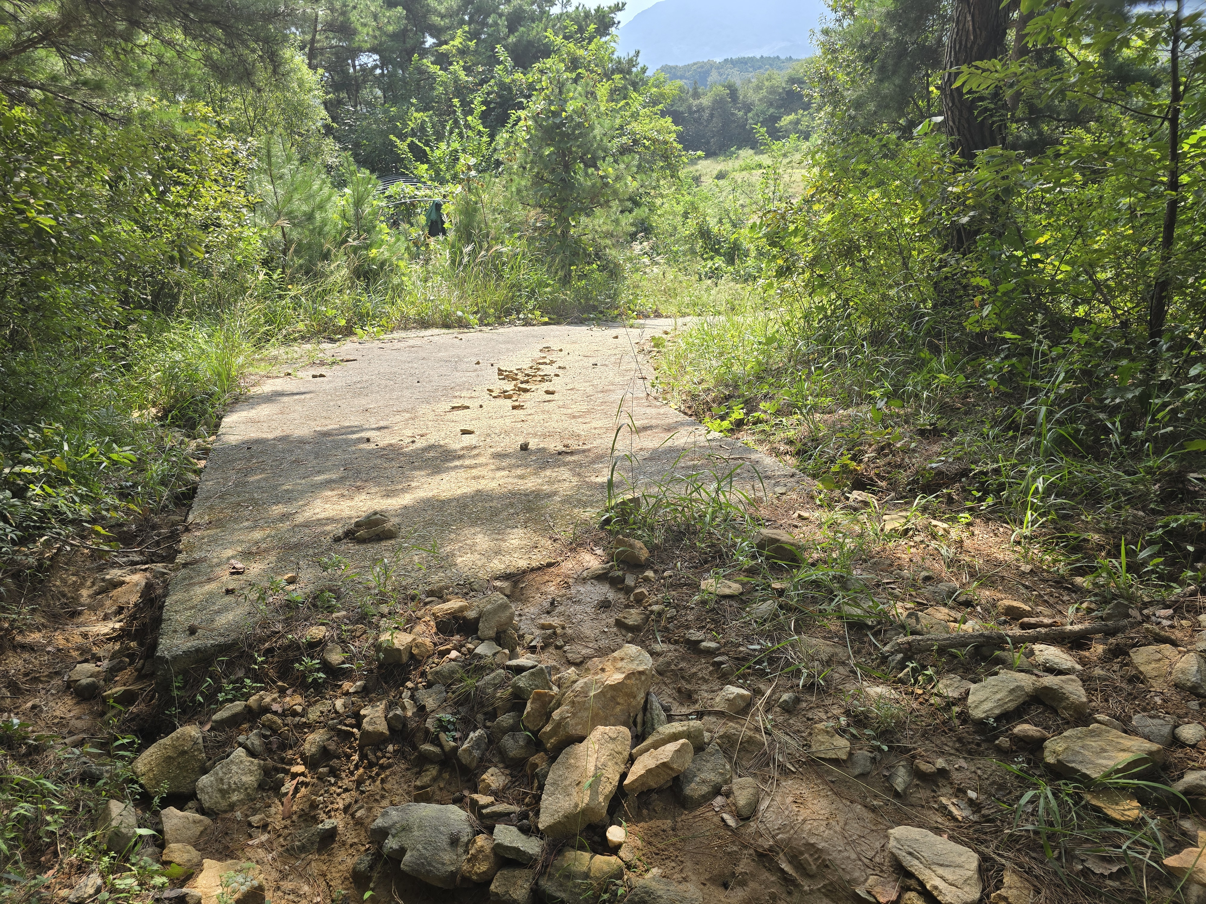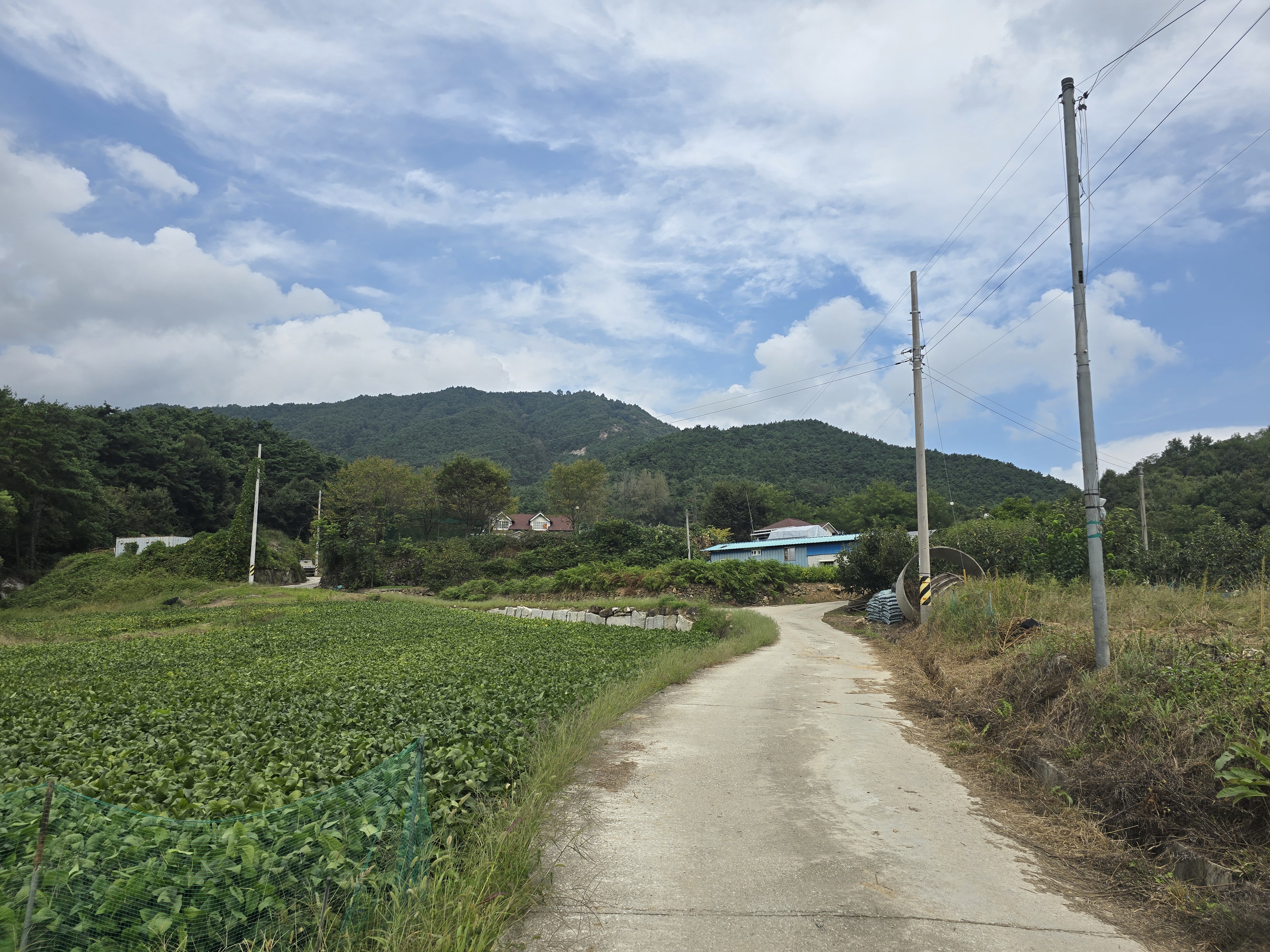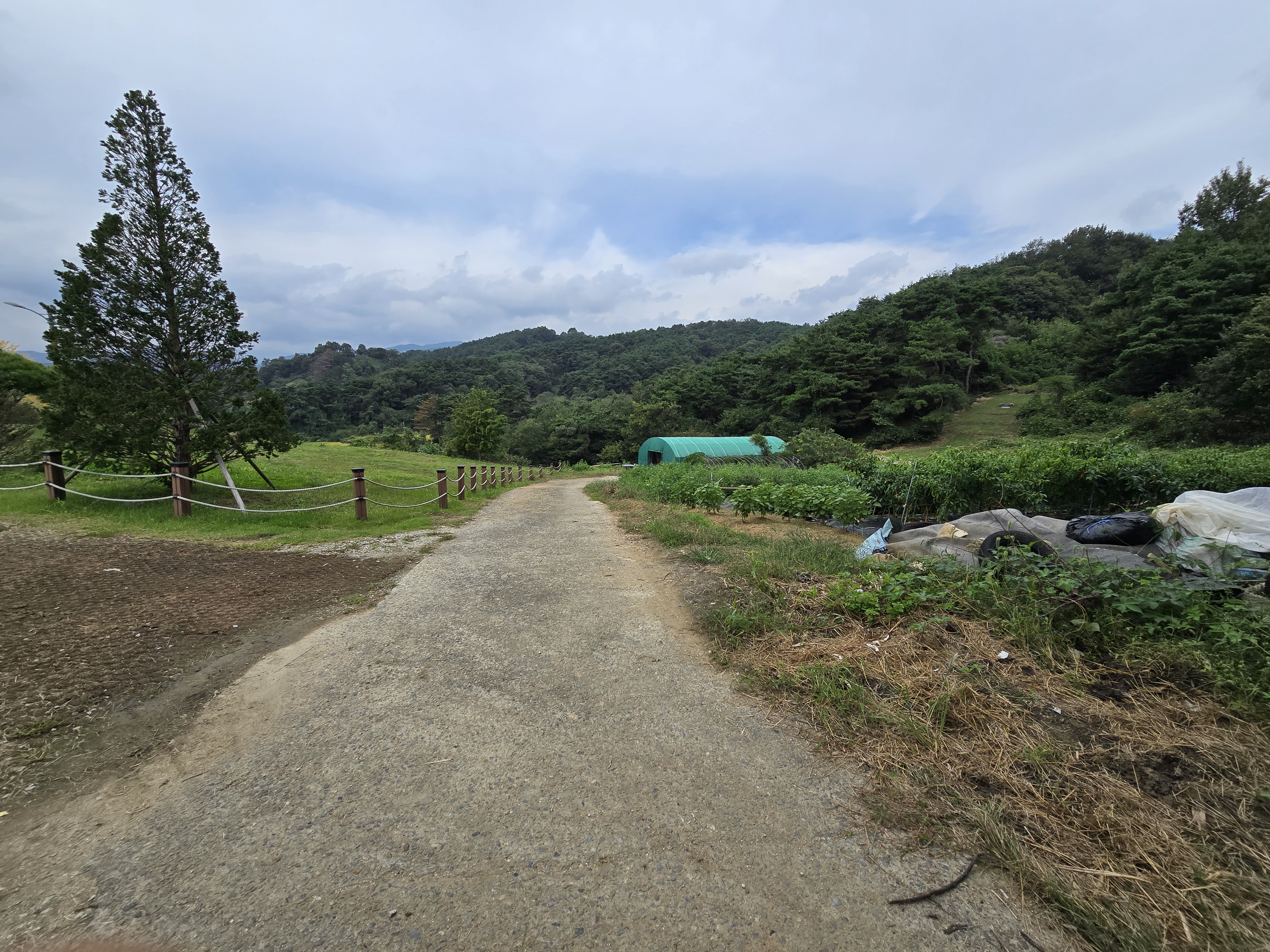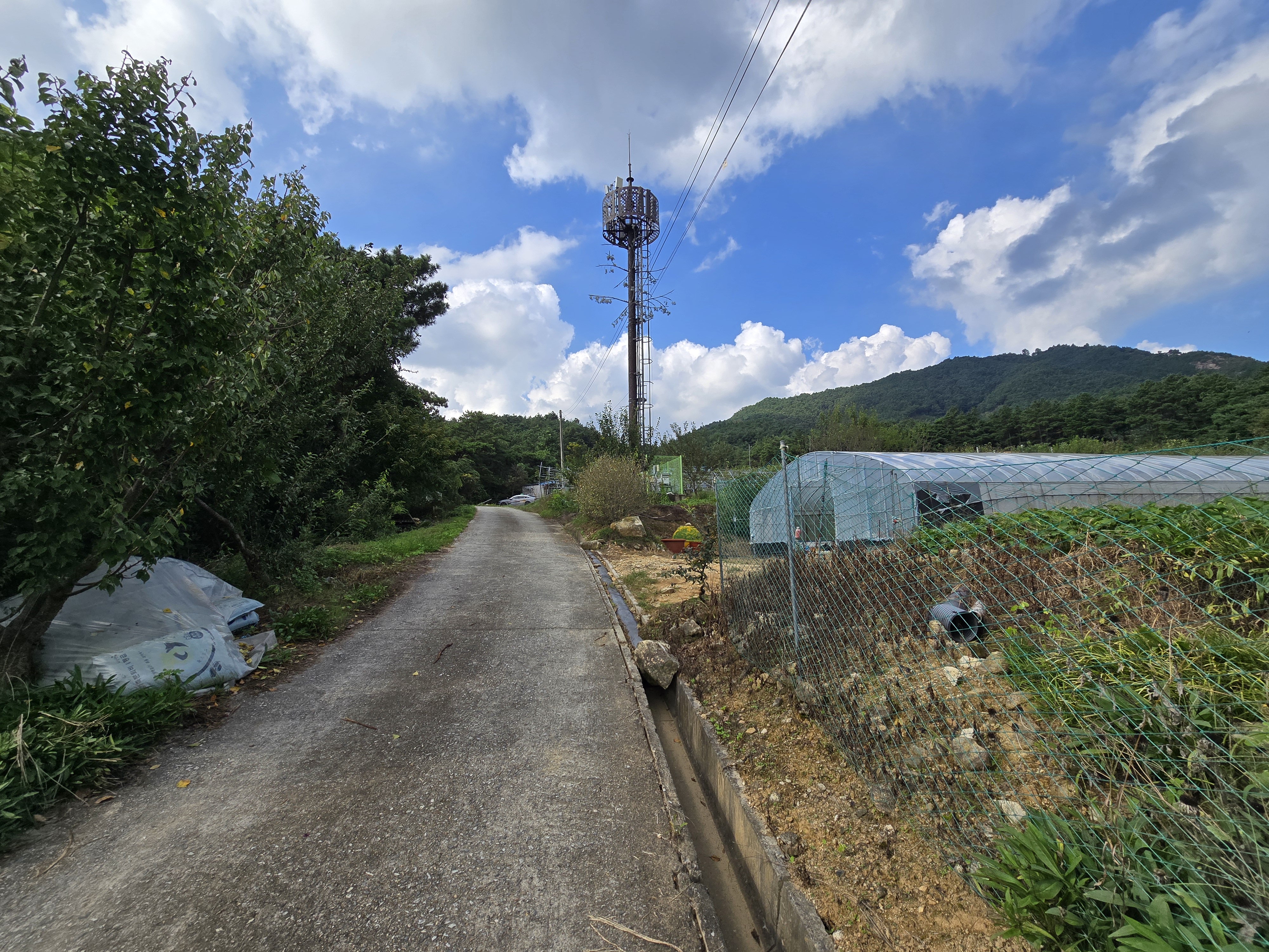축사를 지나 삼거리에서 작은 개울을 건너는 오른쪽 길을 택하여
