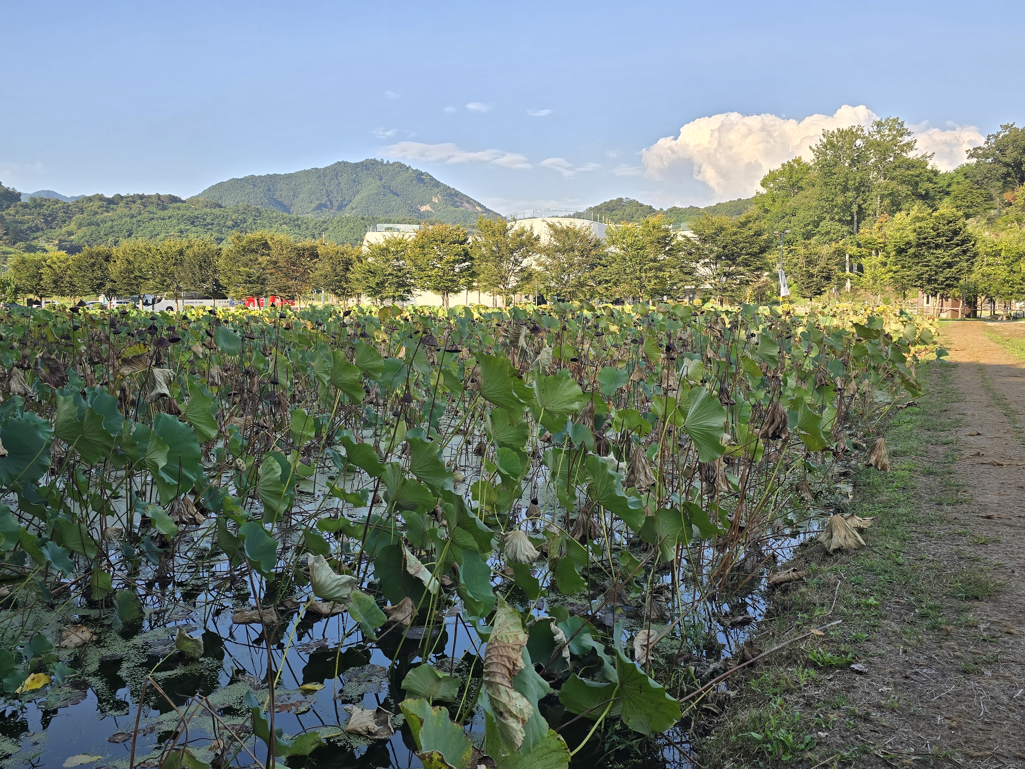 상림숲이 시작된다. 상림 왼쪽은 연밭, 연꽃이 한창이다.
