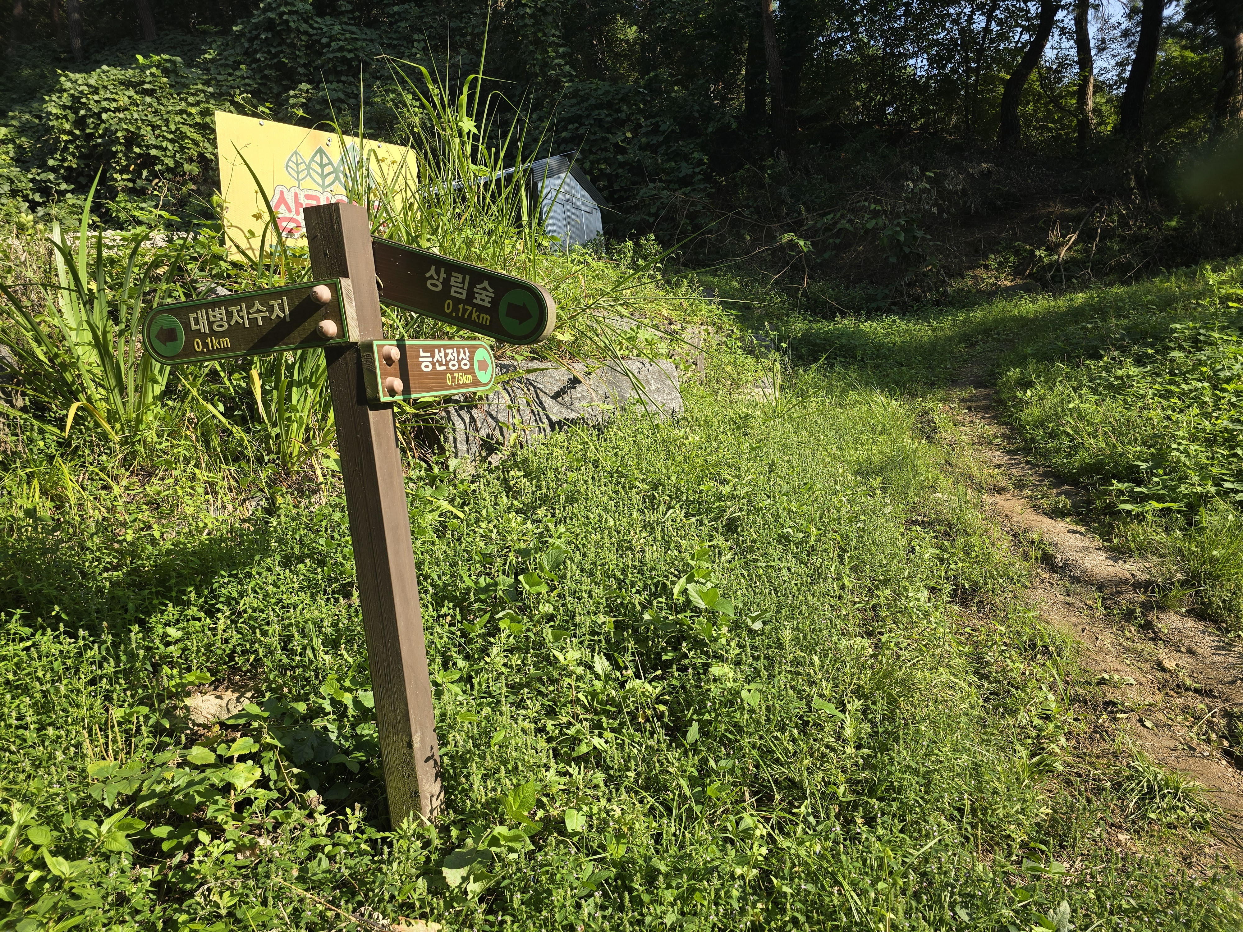 대병저수지 0.1km · 상림숲 0.17km · 능선 정상 0.75km를 가리키는데,