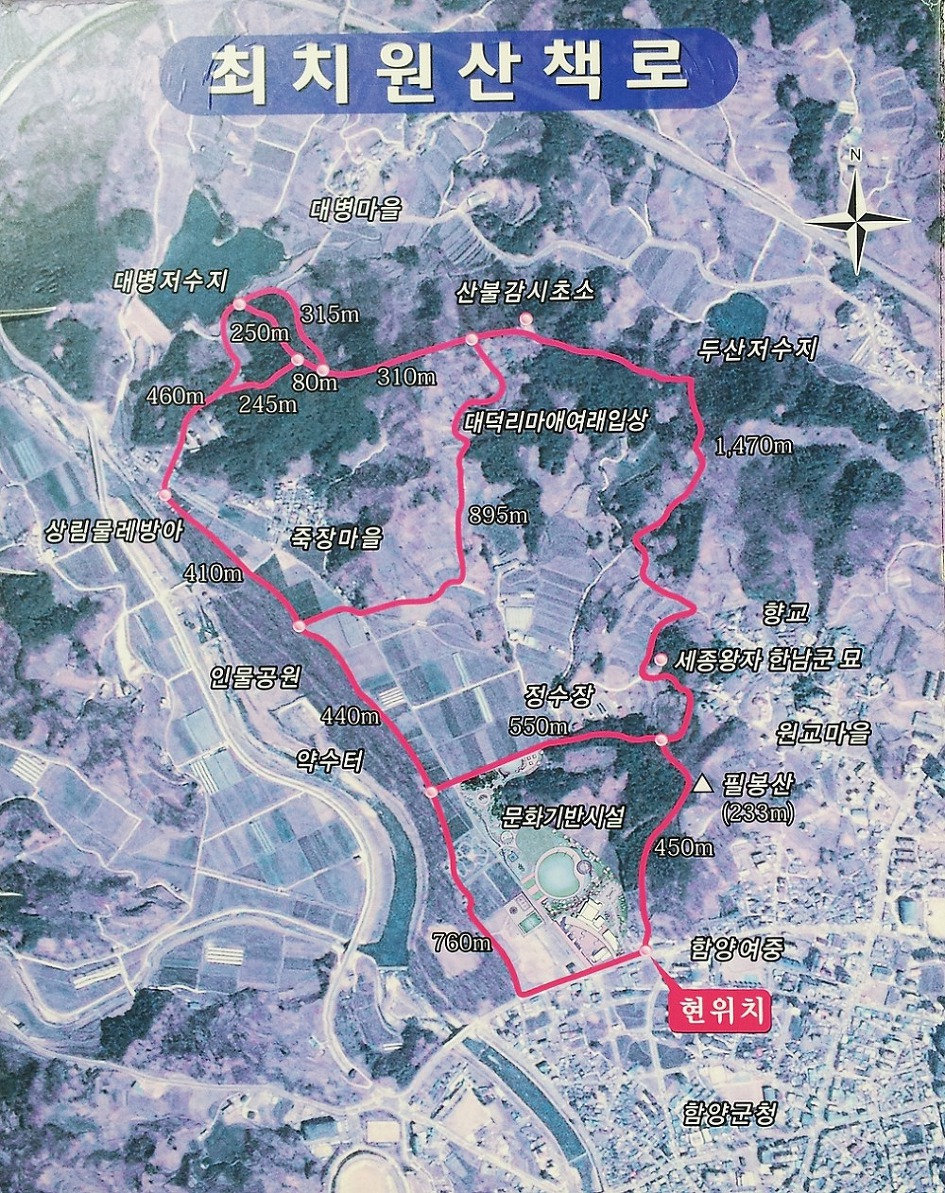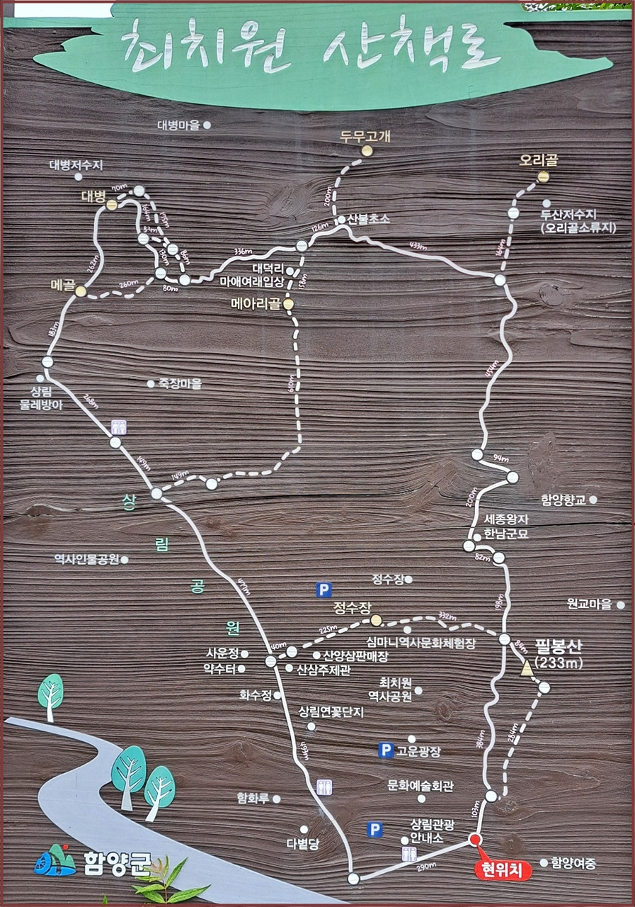 최근에 조성한 필봉산 가족숲길과 기존의 최치원 산책로를 곁들이니