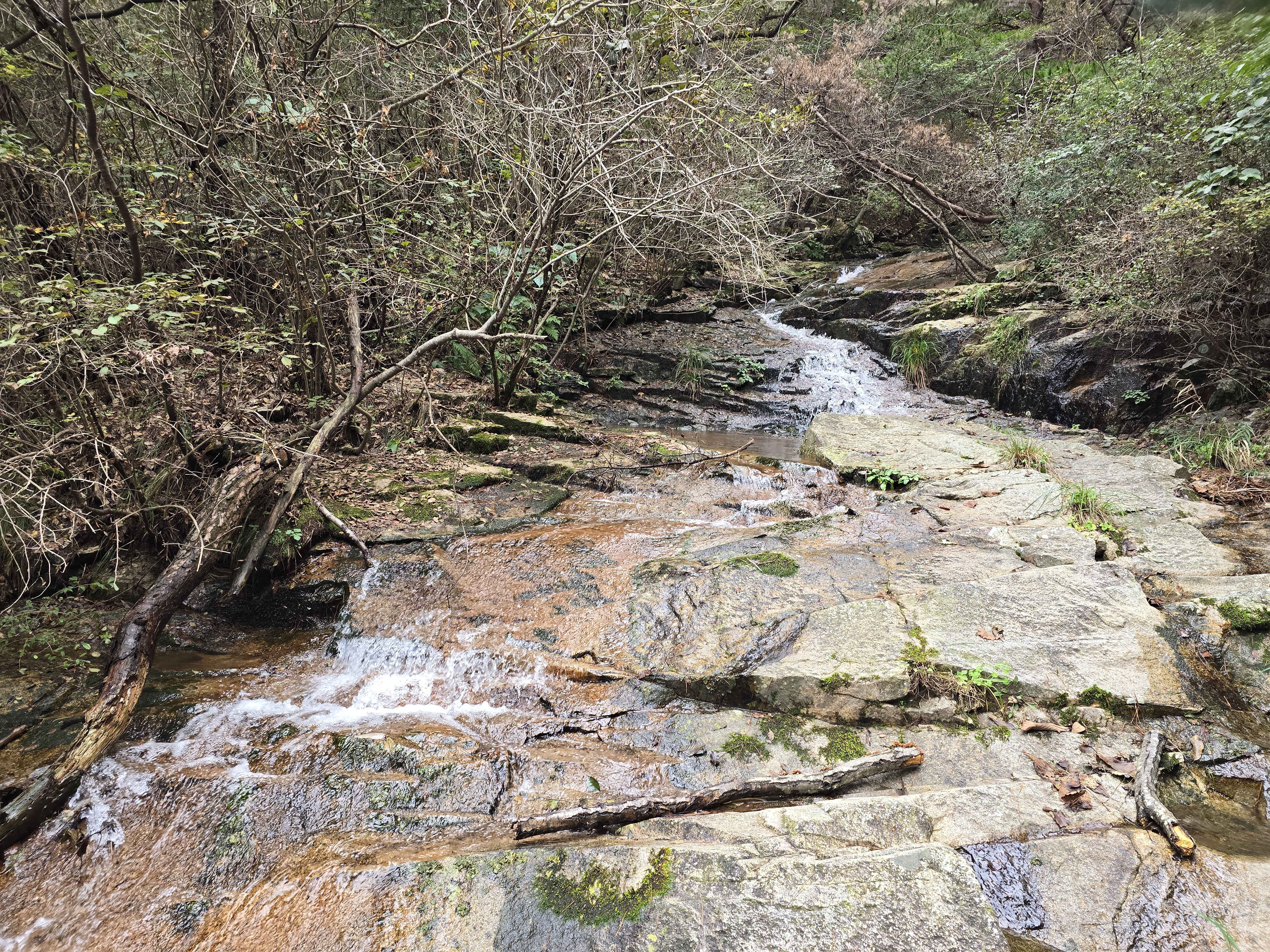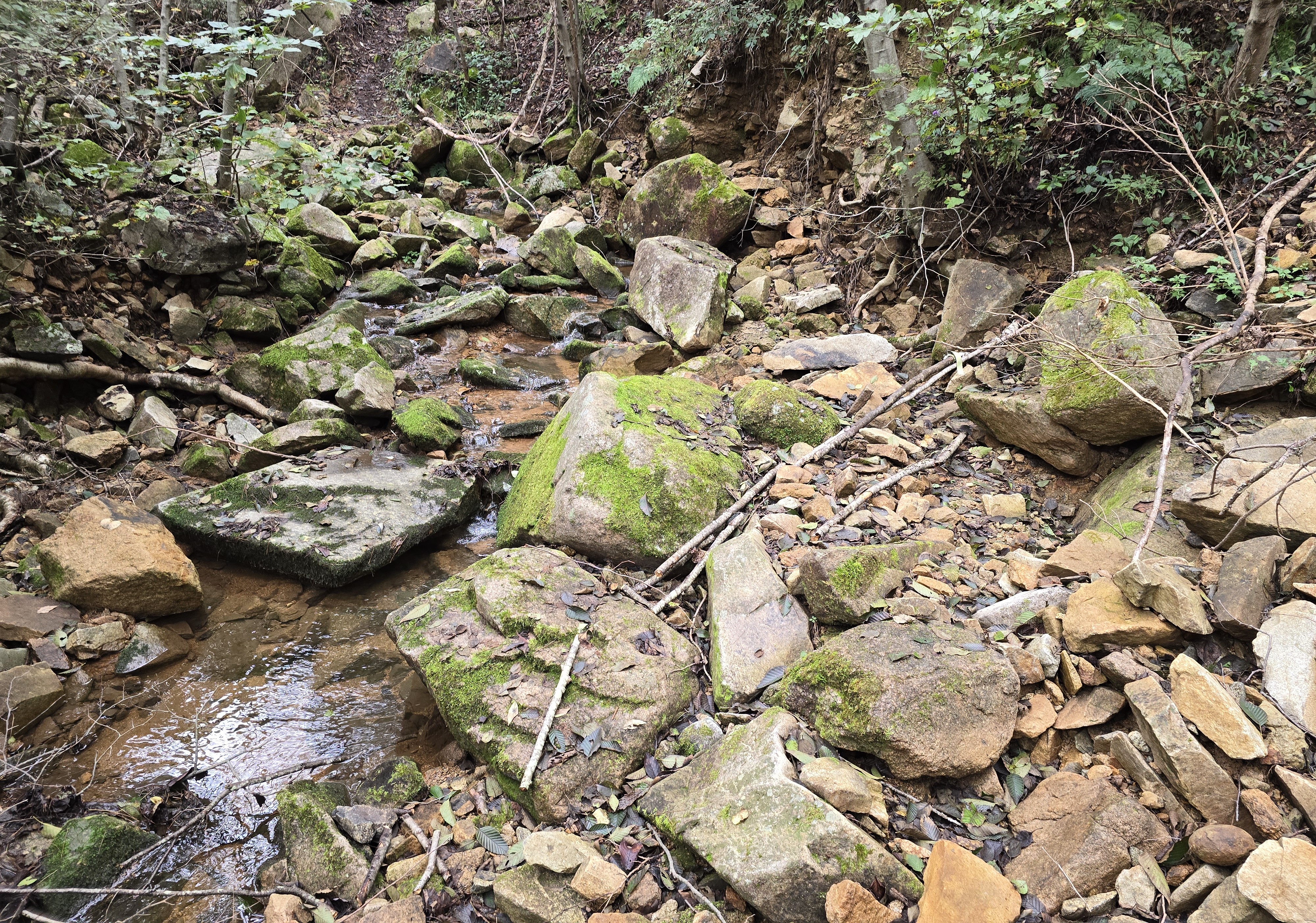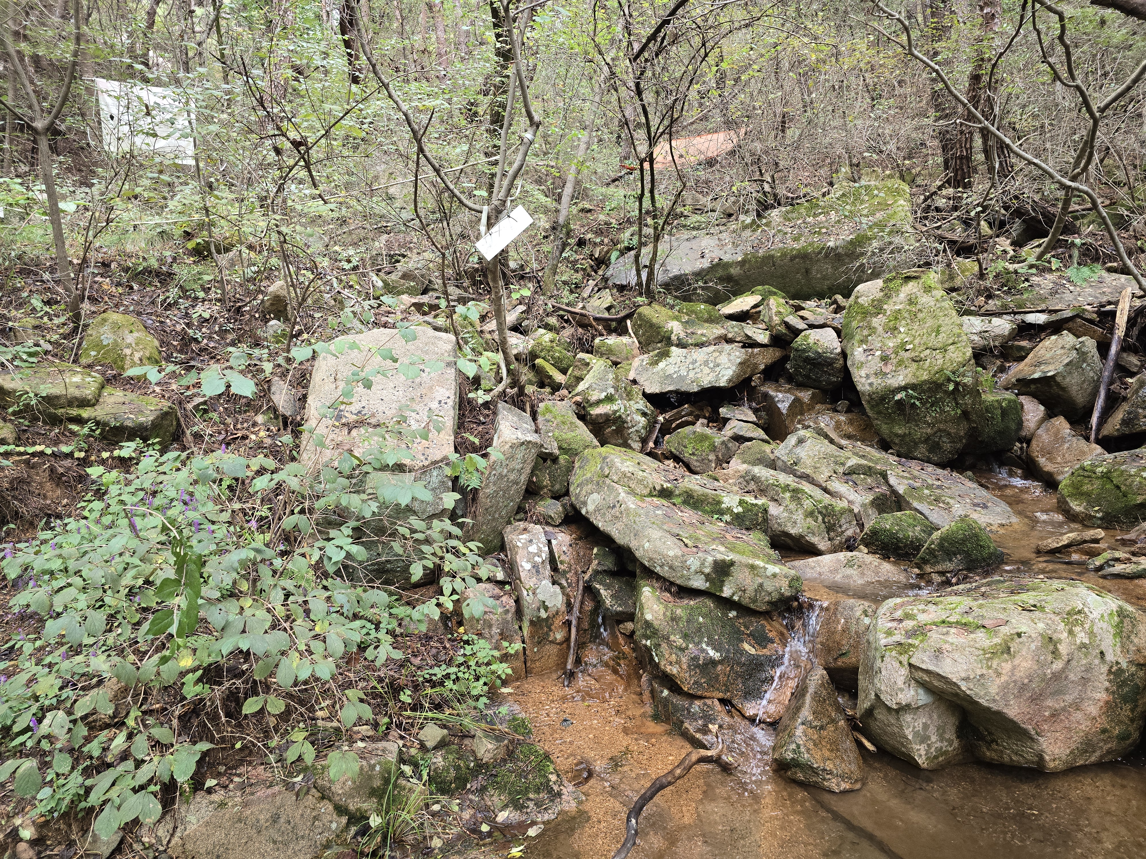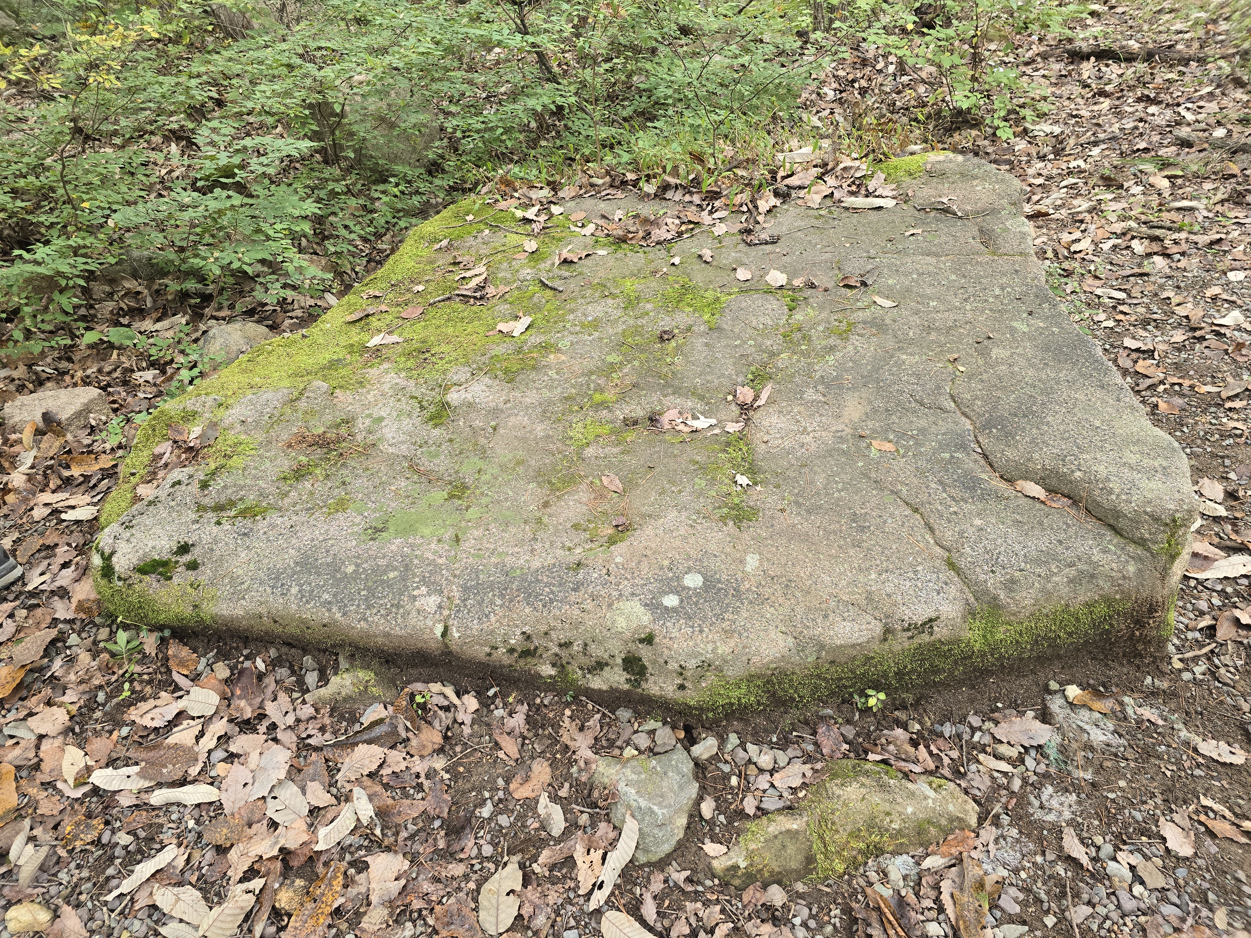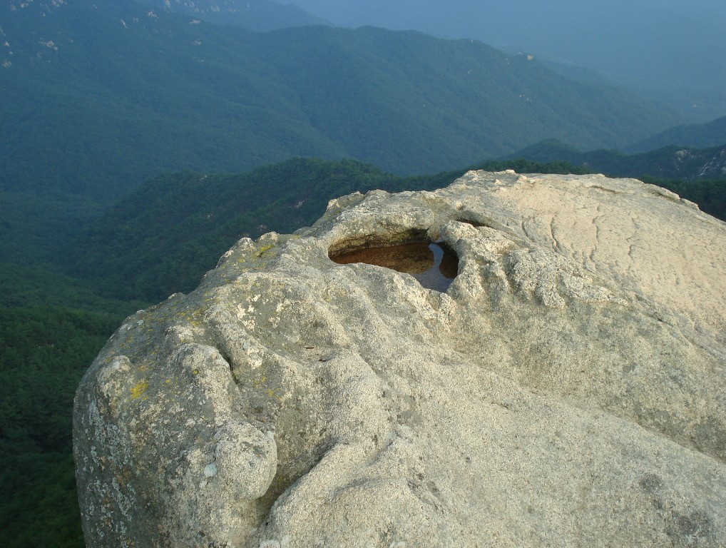 이 바위는 계곡에 반듯하게 누워 머리를 풀고