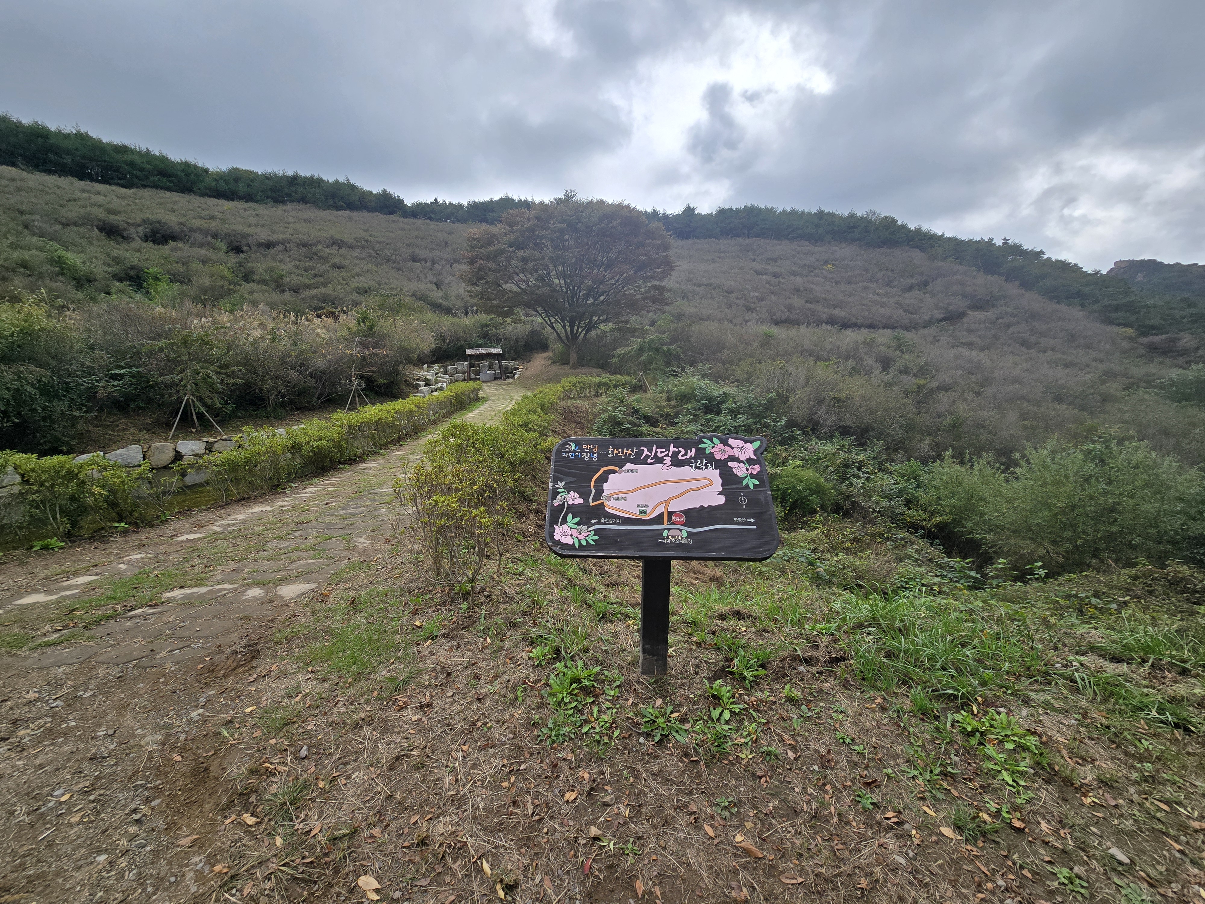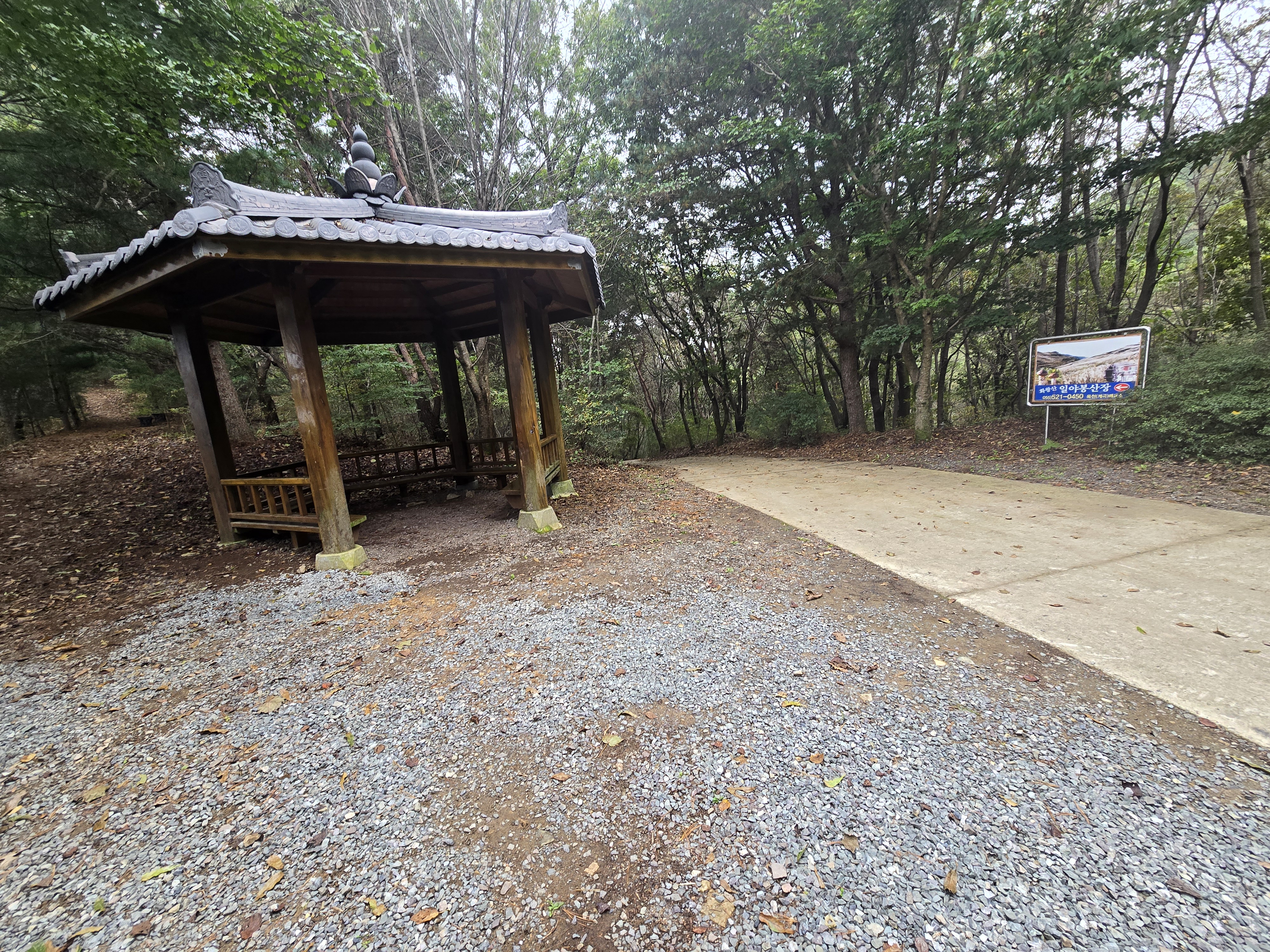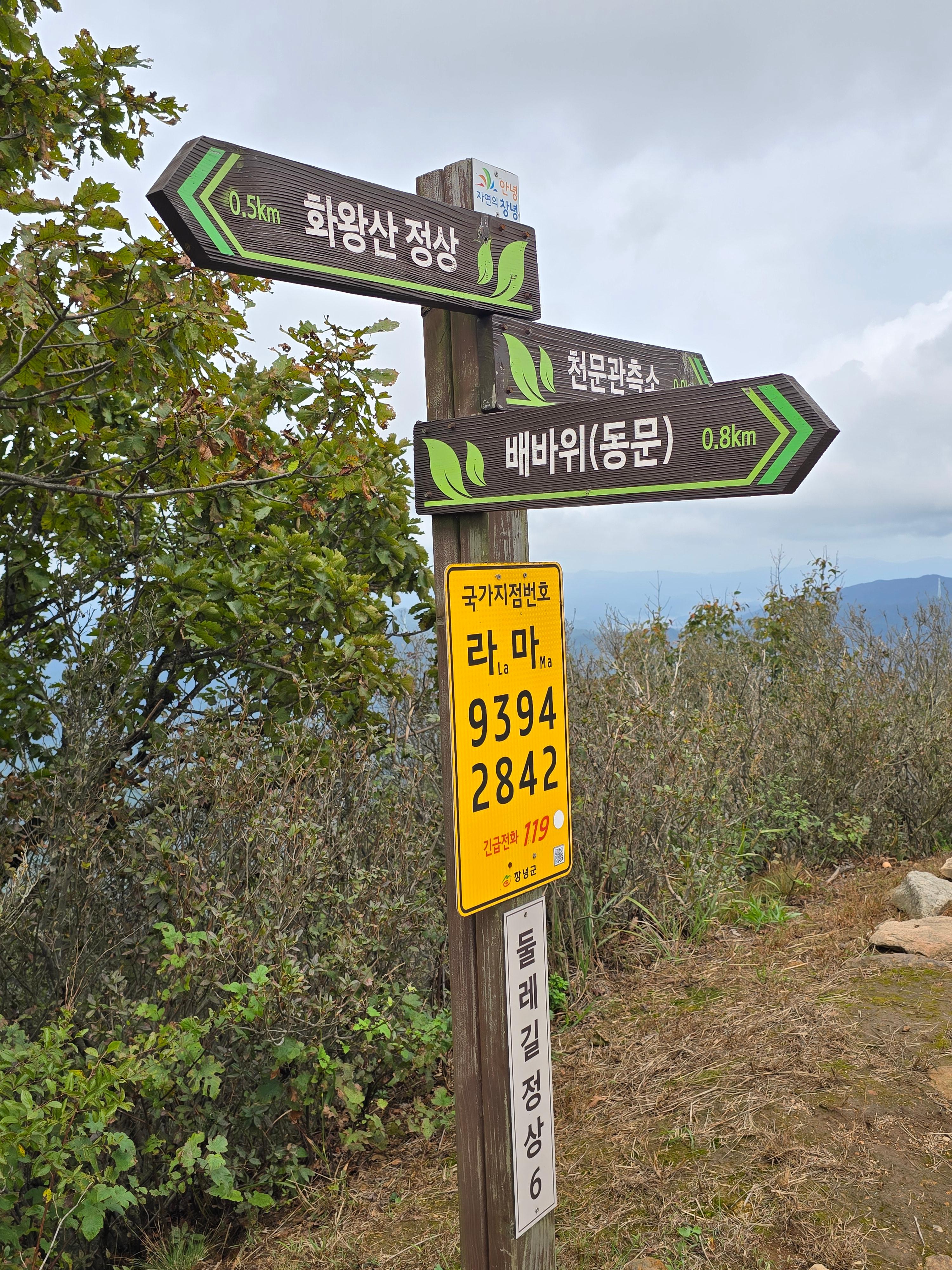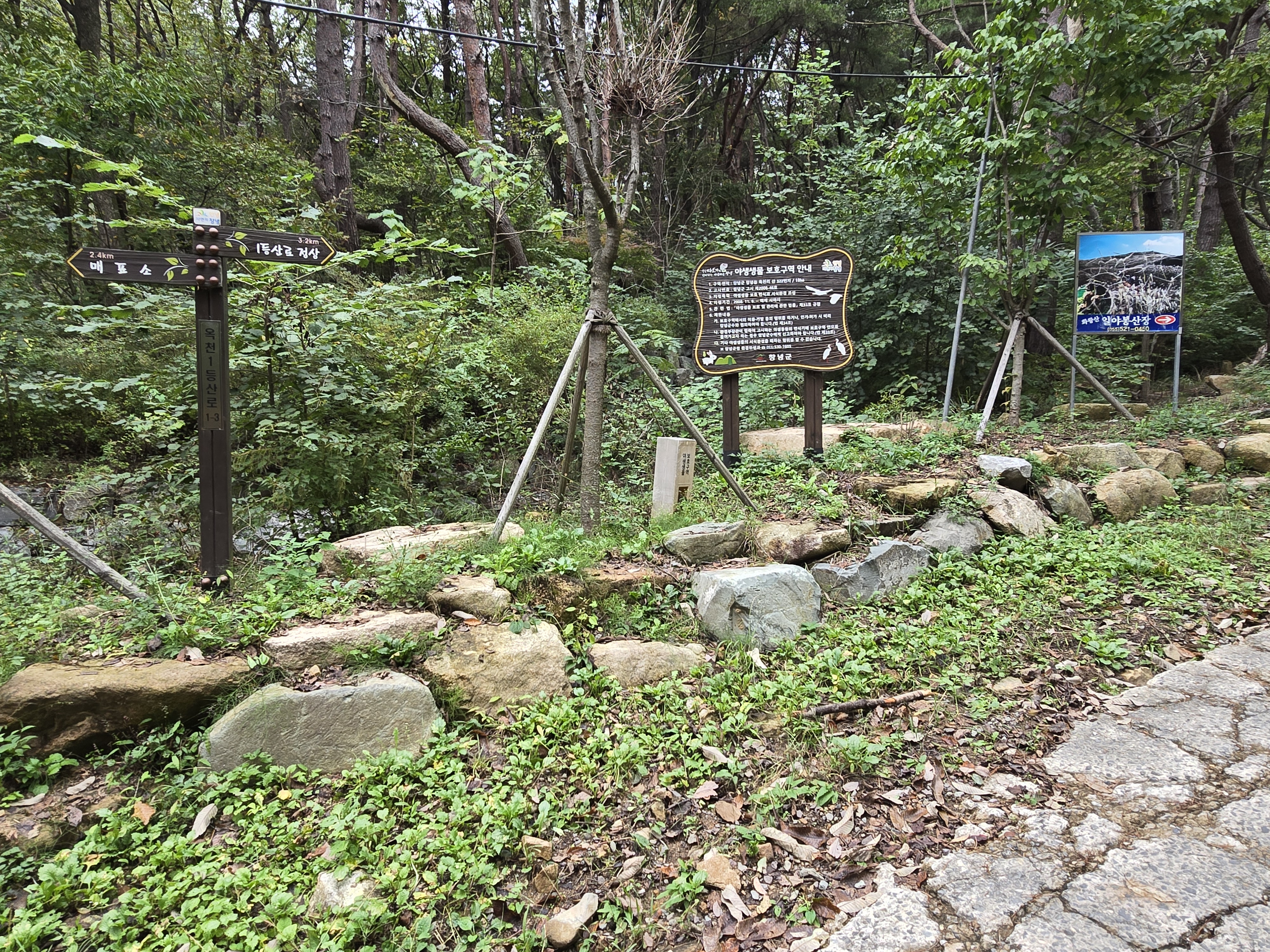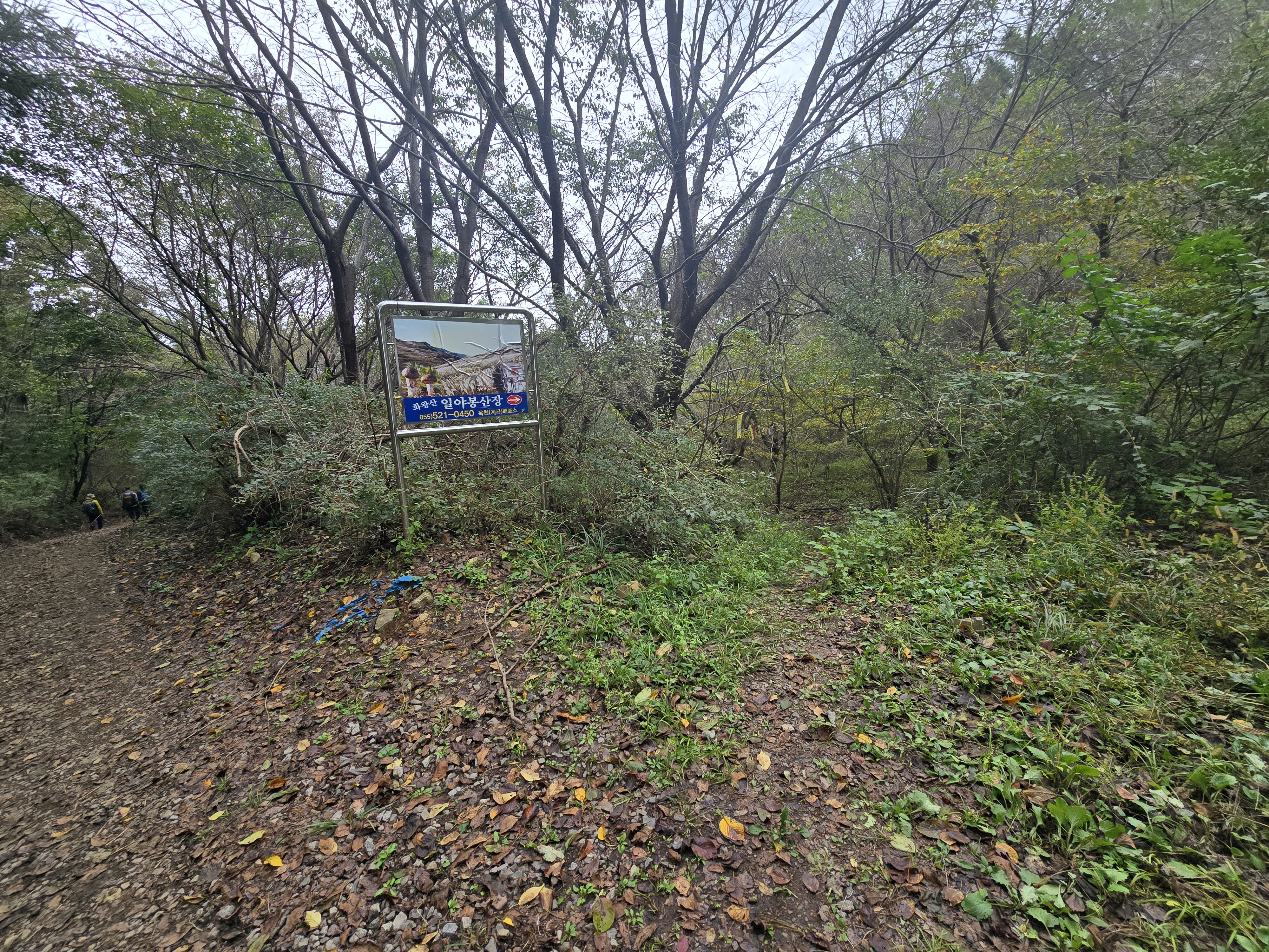 이정표 바로 위 화왕산 일야봉산장 입간판 뒤로 남문으로 이어지는 등산로가 열리며,