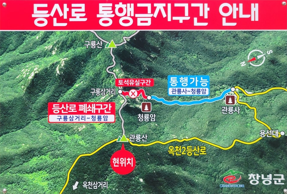 배바위-화왕산 정상-동문-옥천삼거리(청간재)-관룡산-용선대를 거쳐,