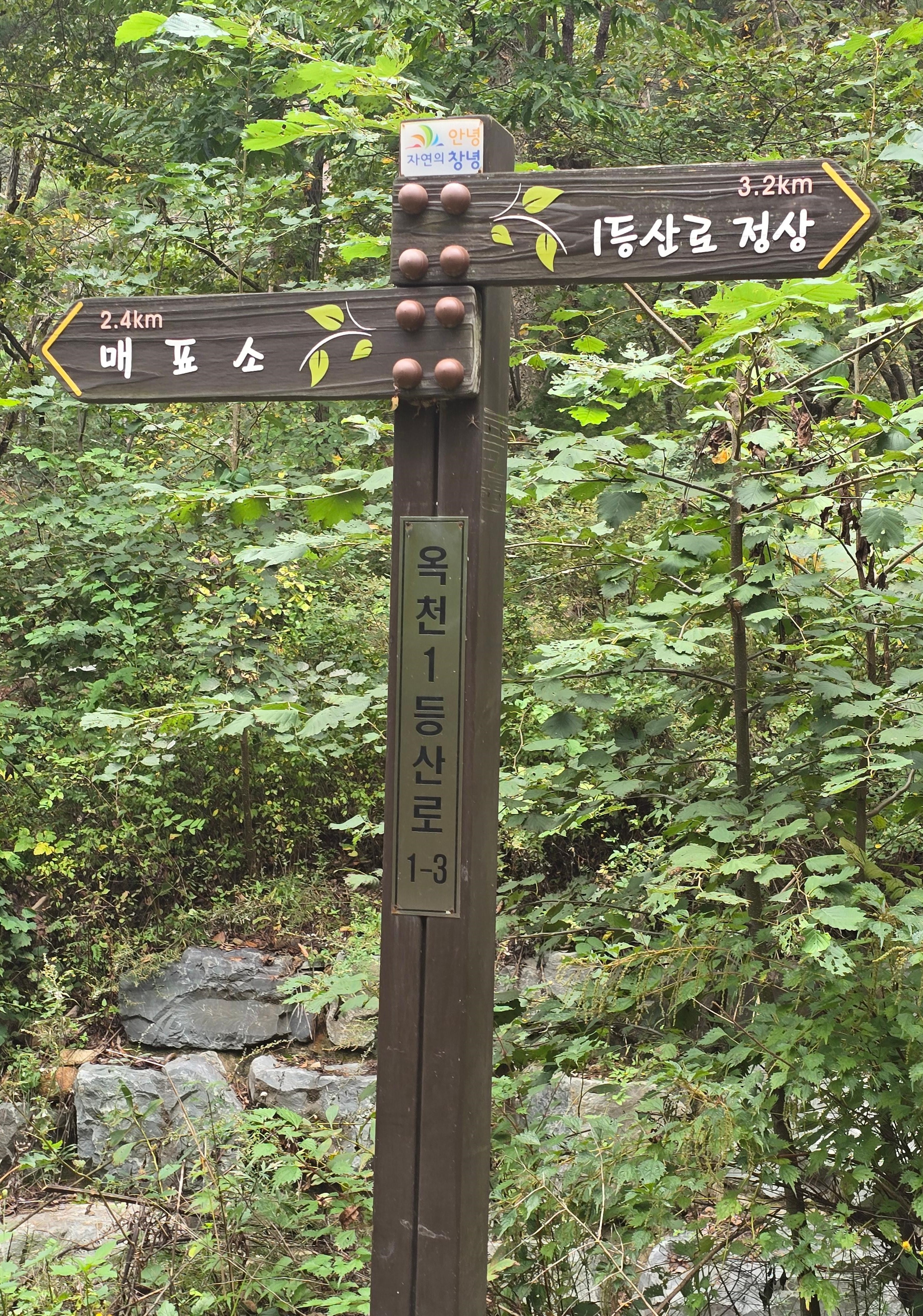 옥천매표소 2.4km · 1등산로 정상 3.2km를 가리키는데,