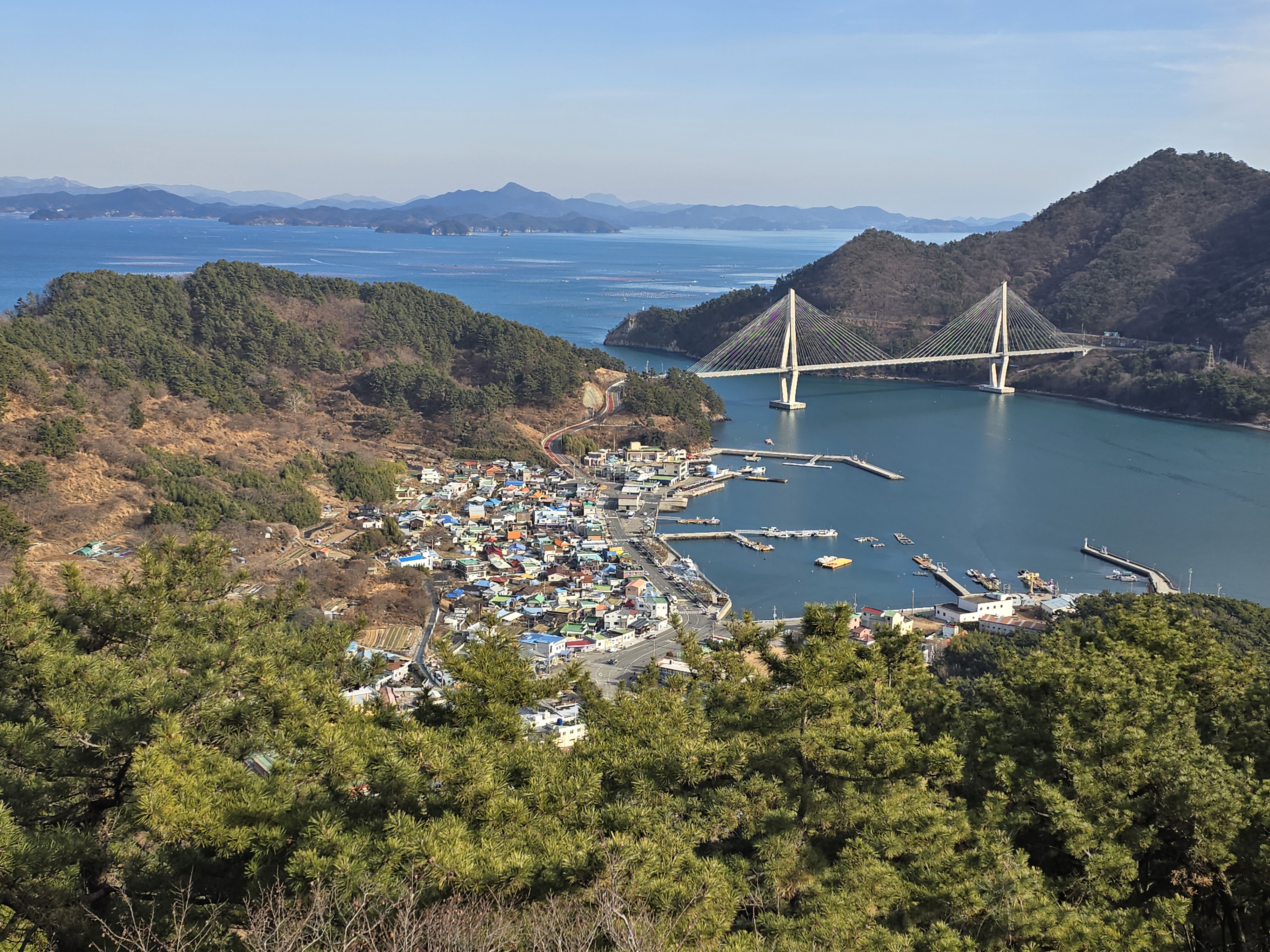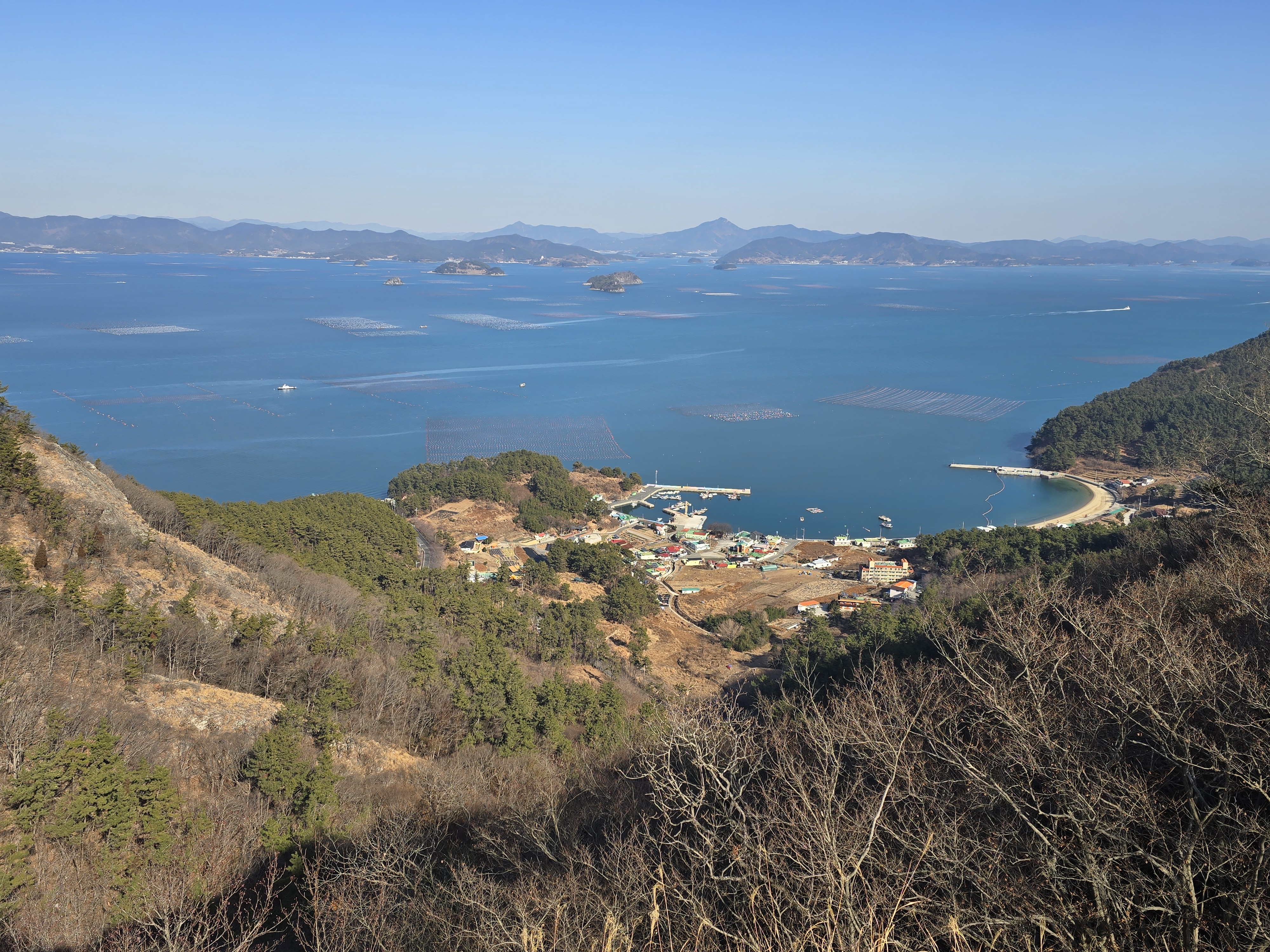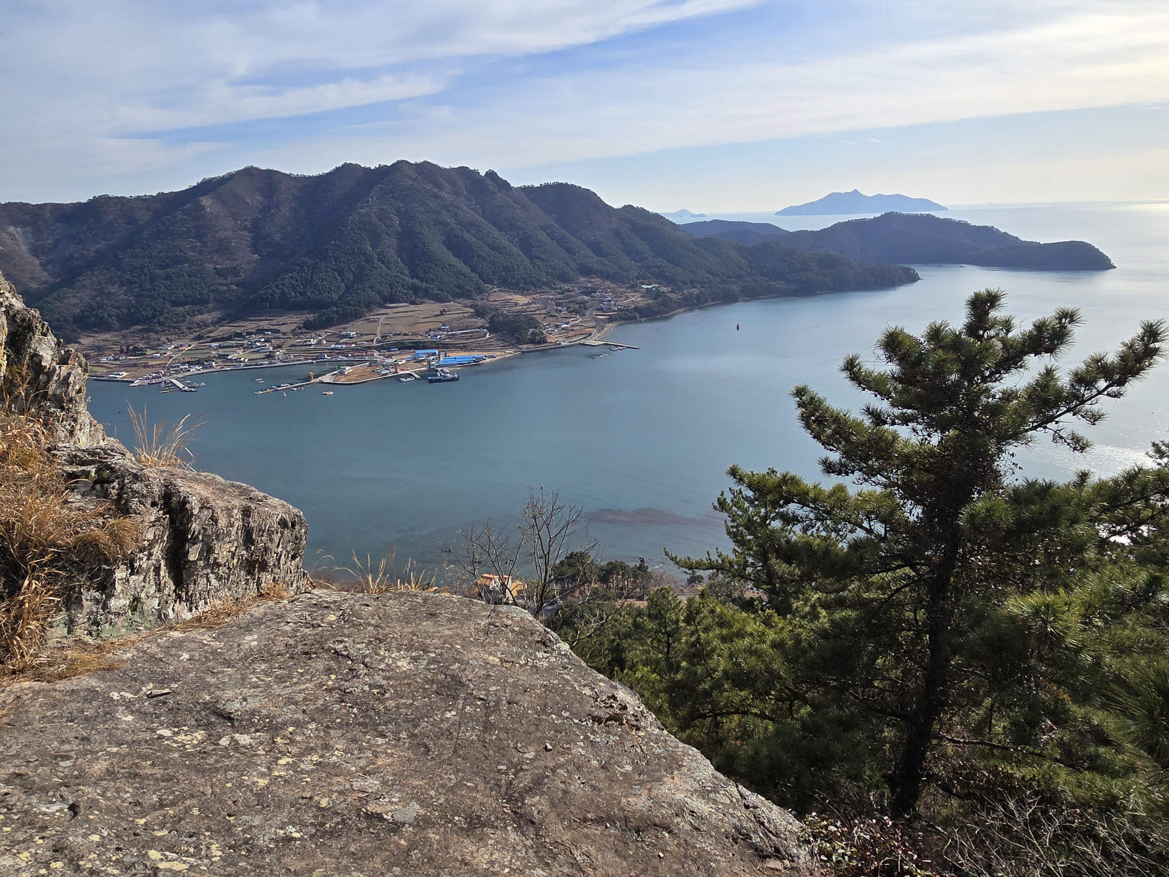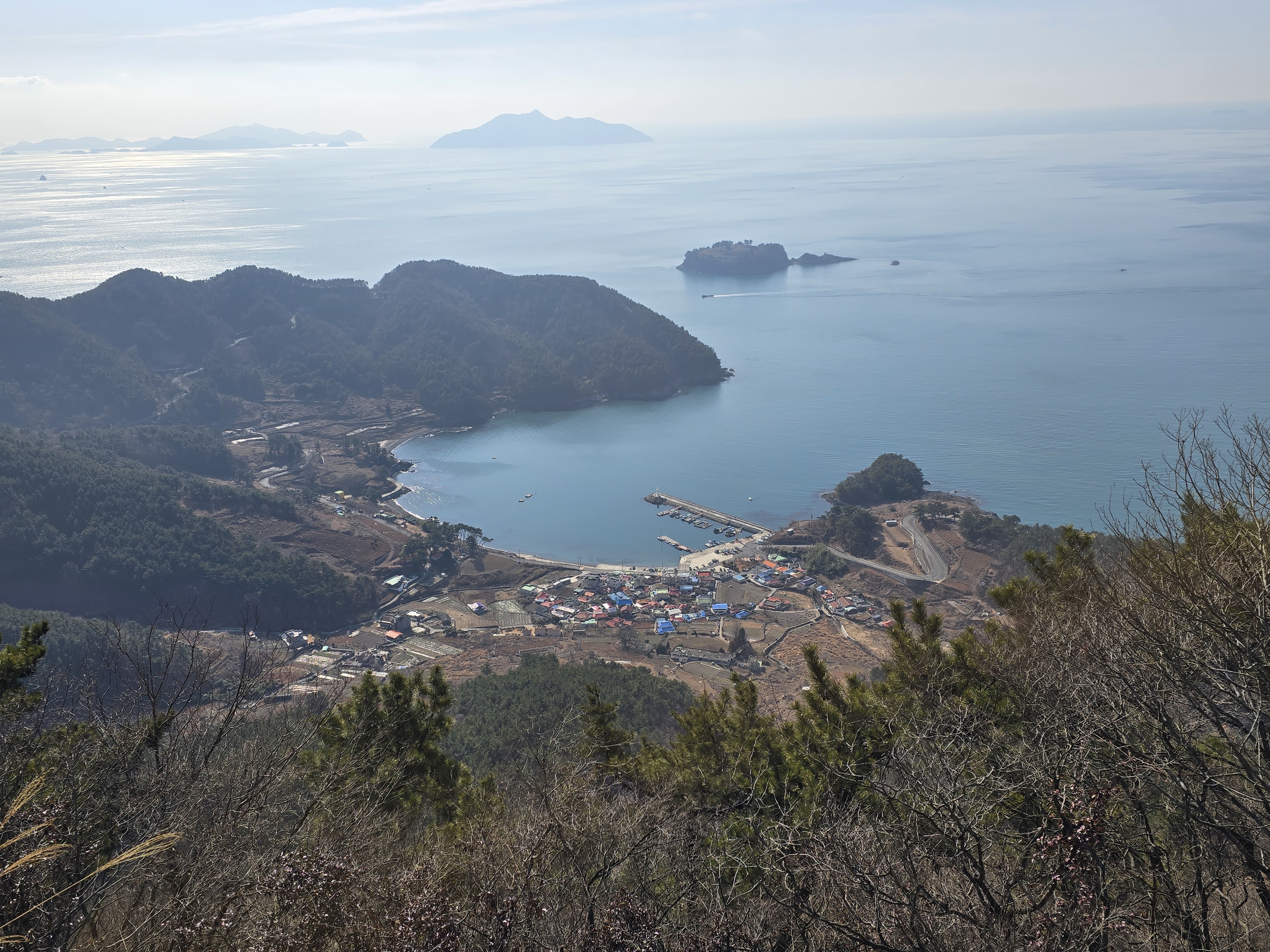 오른쪽 발아래 해안선이 U자로 쑥 들어간 포구와 이를 감싼 돈지마을이 보인다.