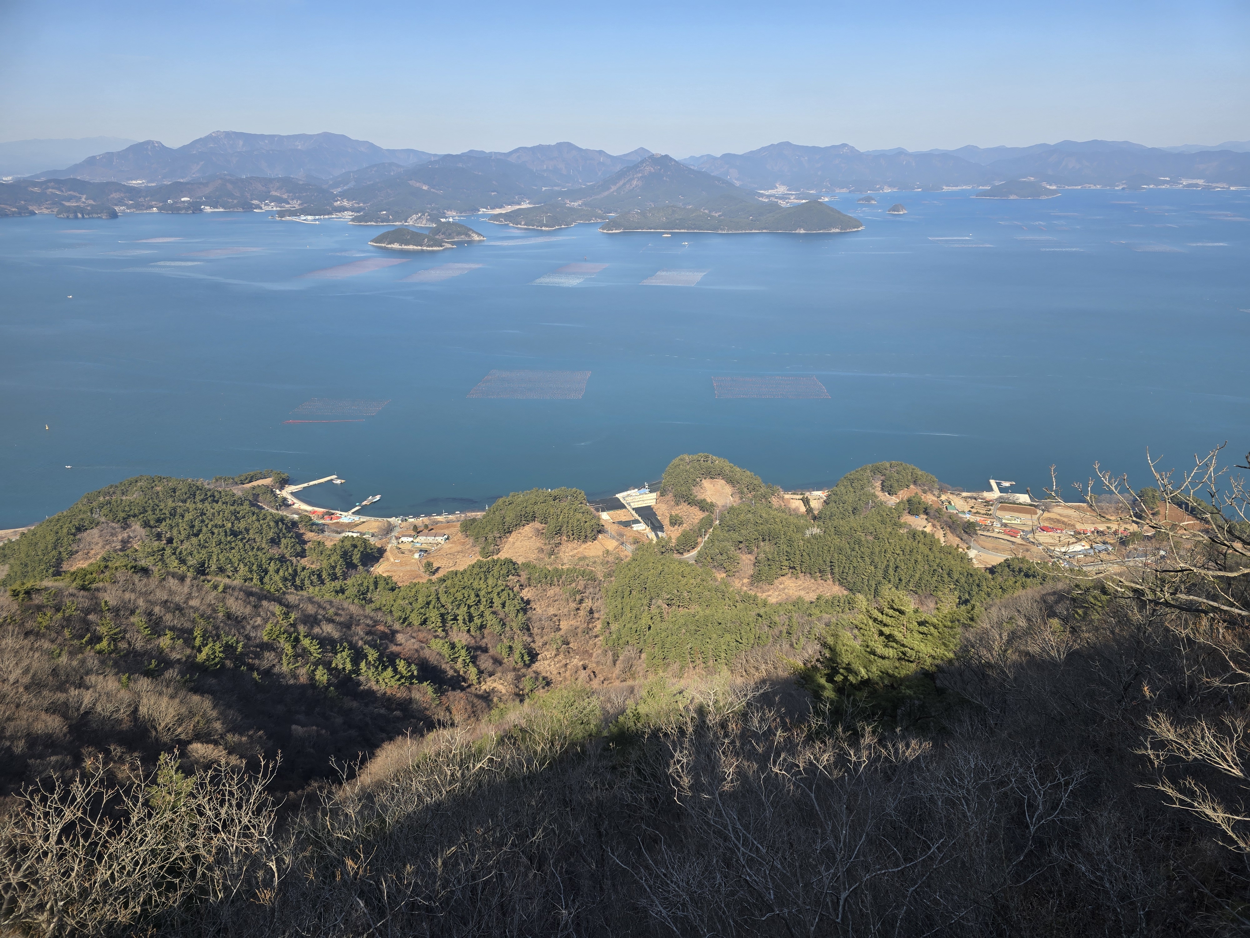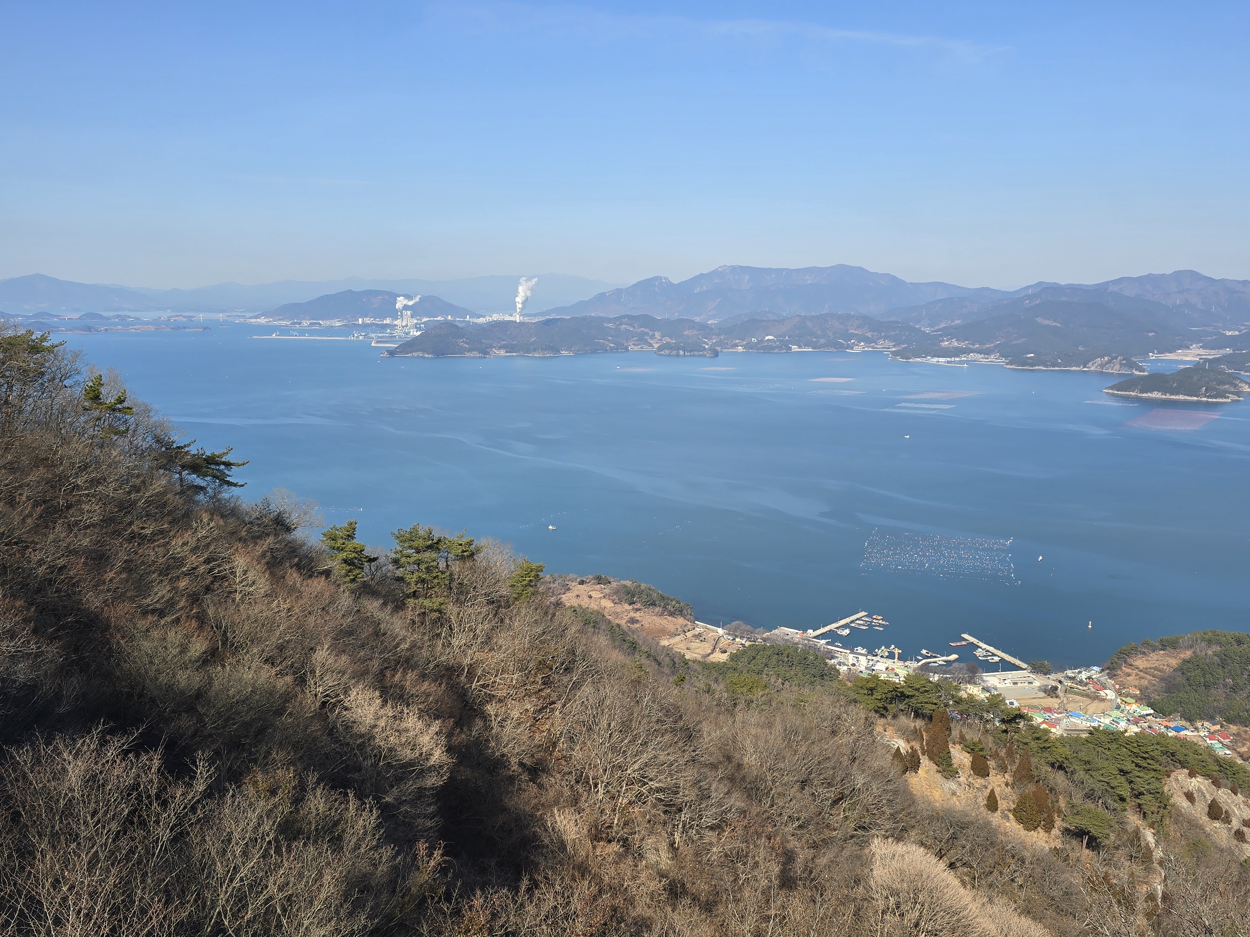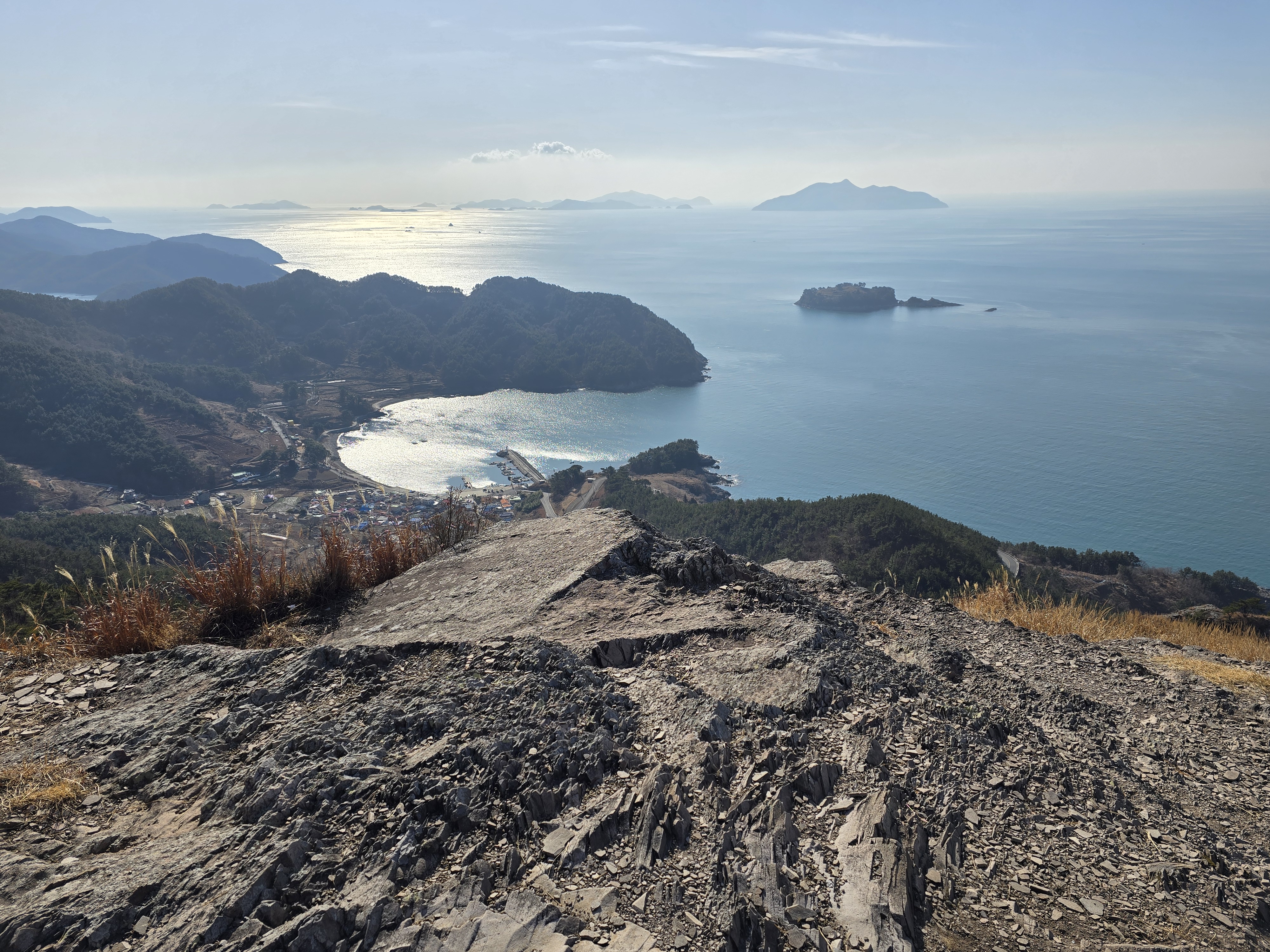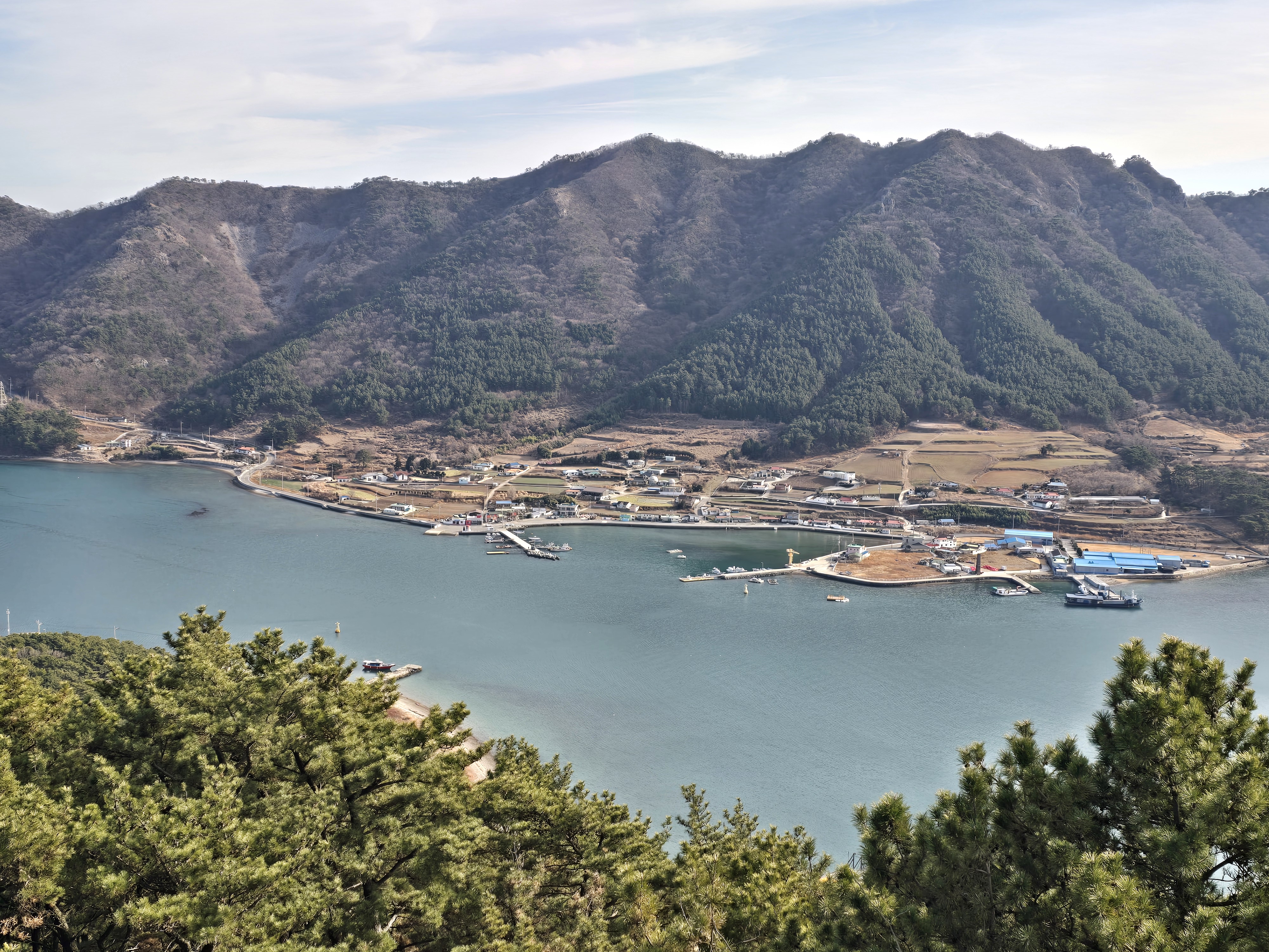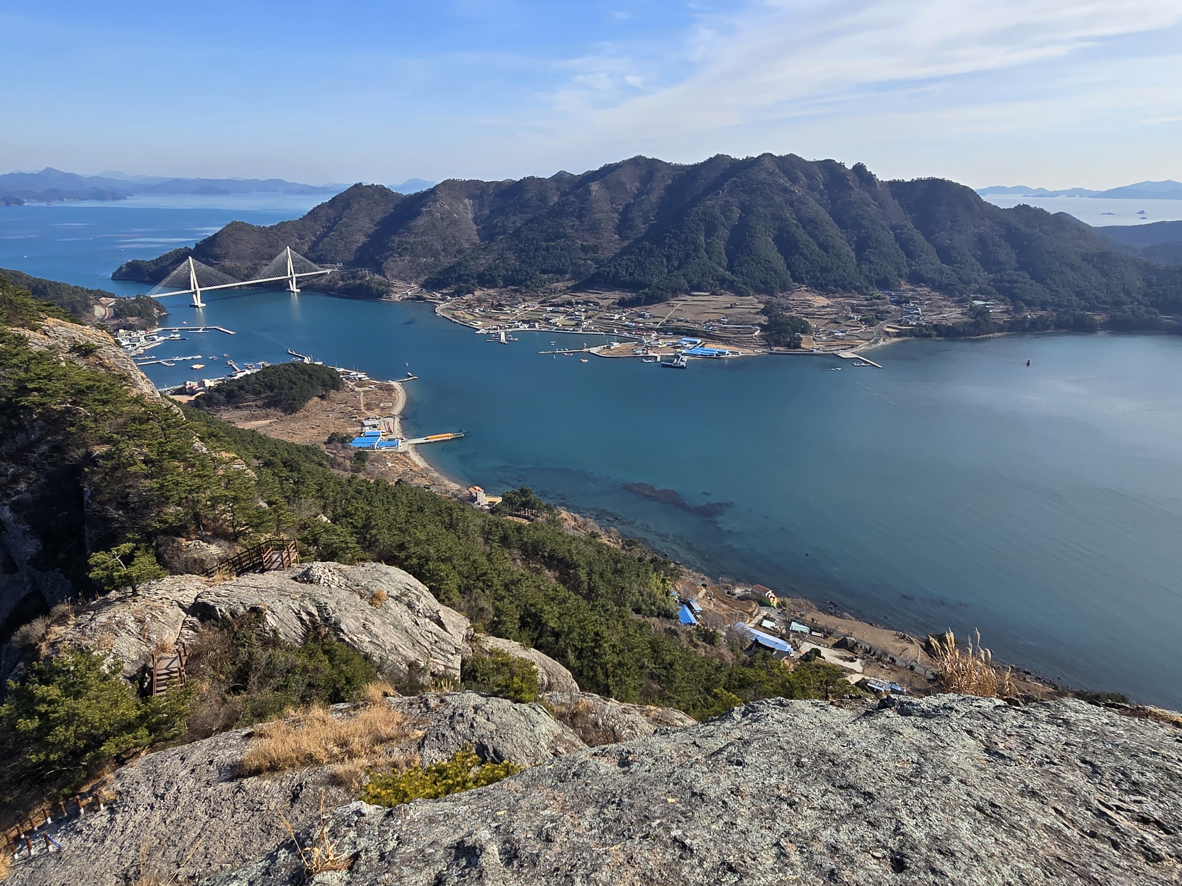 오른쪽 발아래 해안선이 U자로 쑥 들어간 포구와 이를 감싼 돈지마을이 보인다.