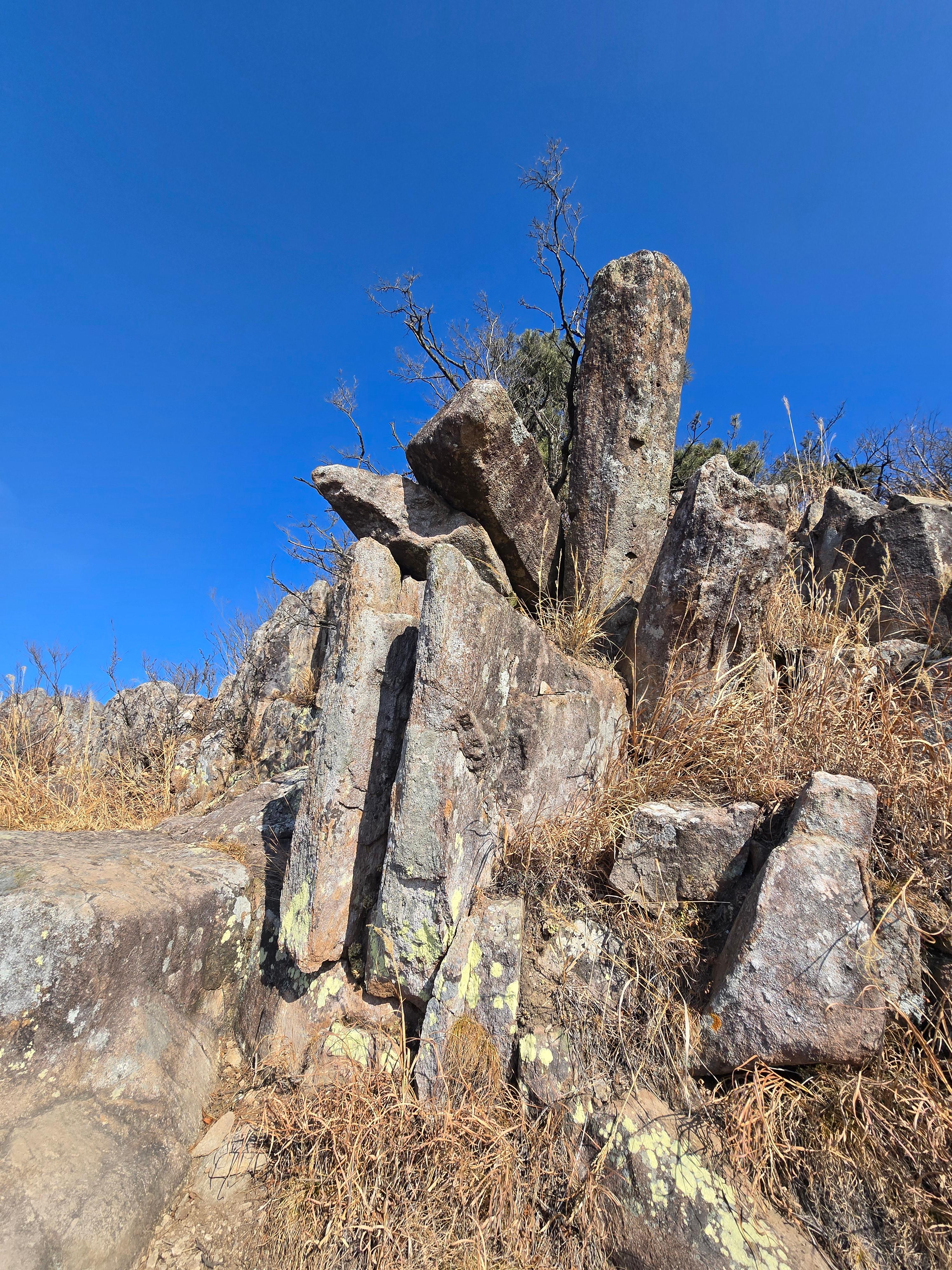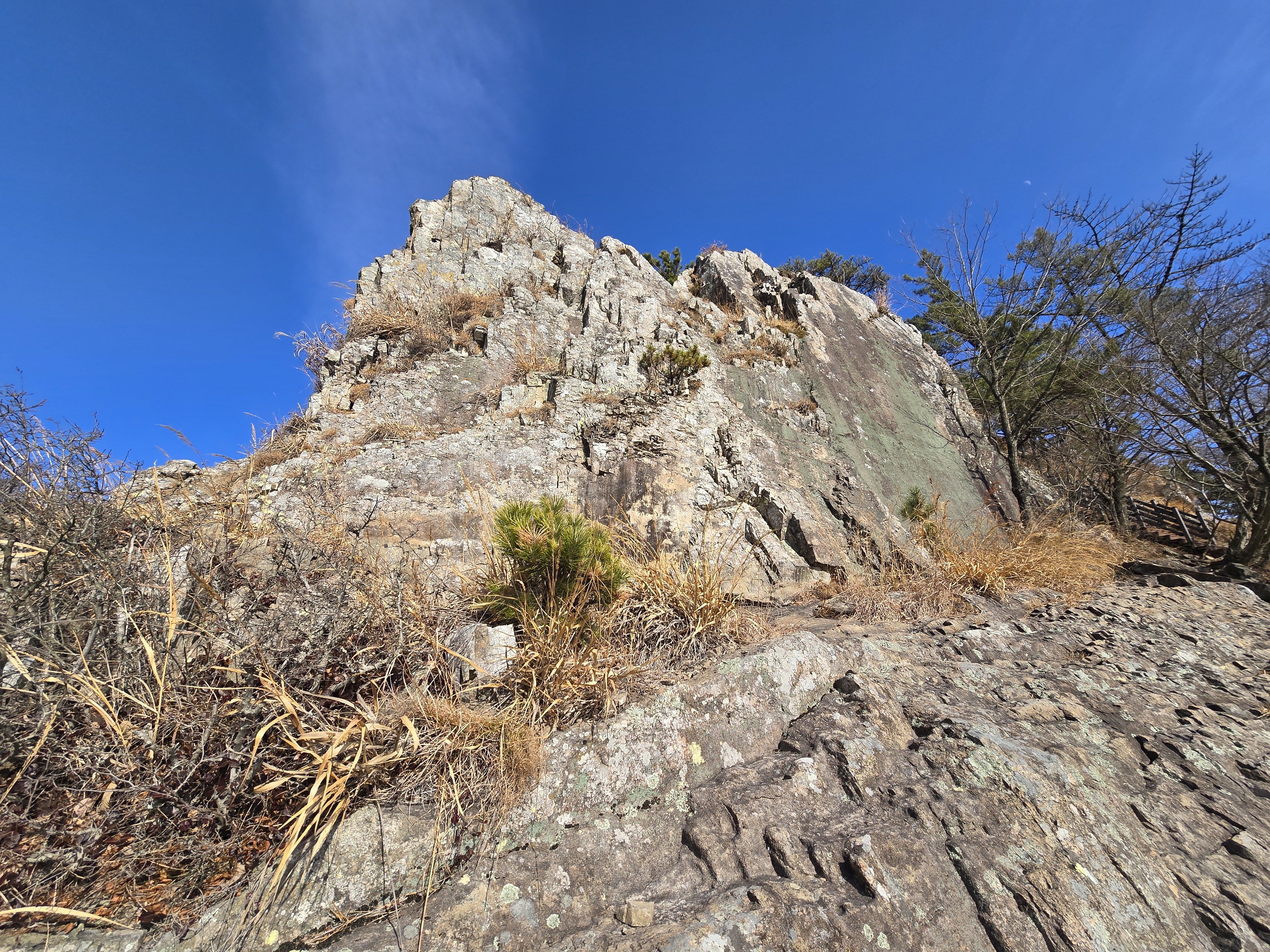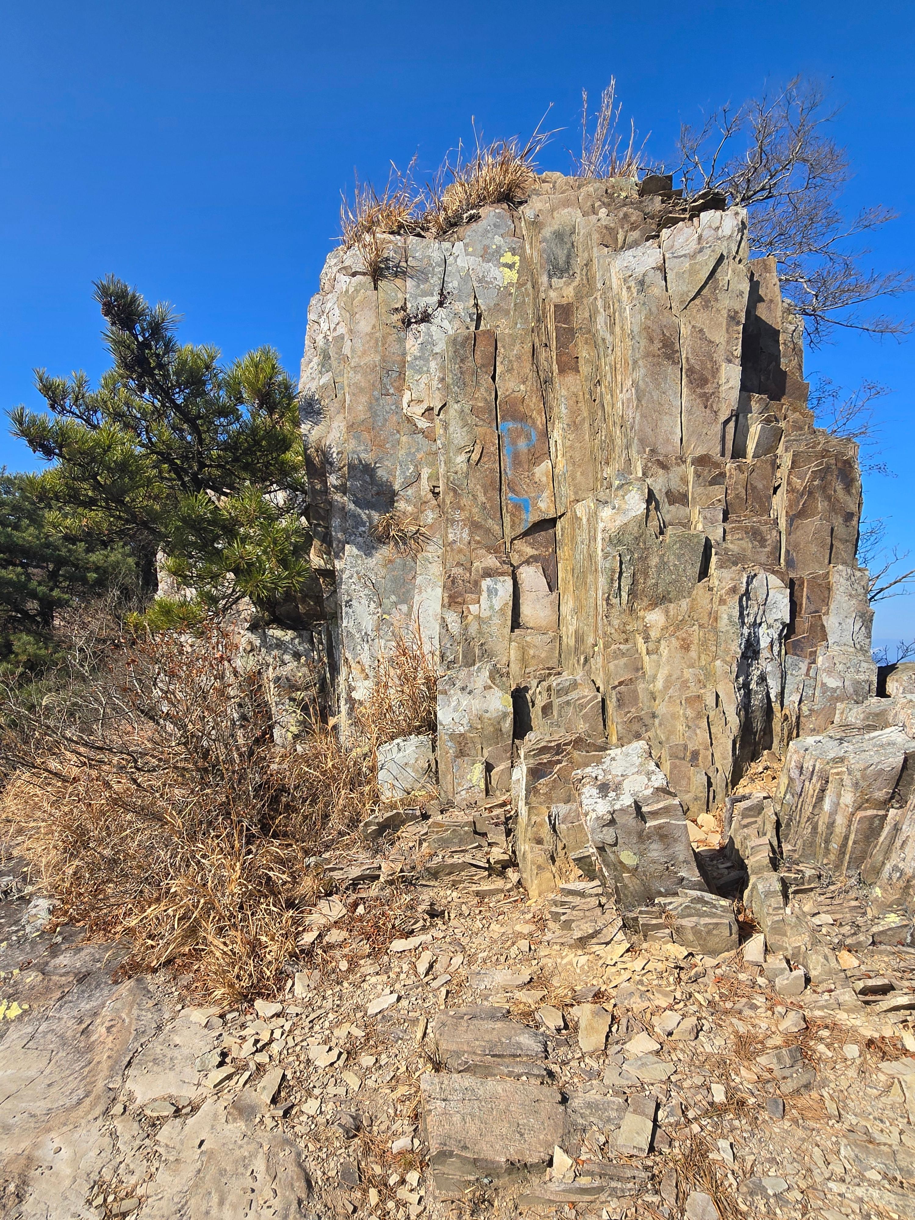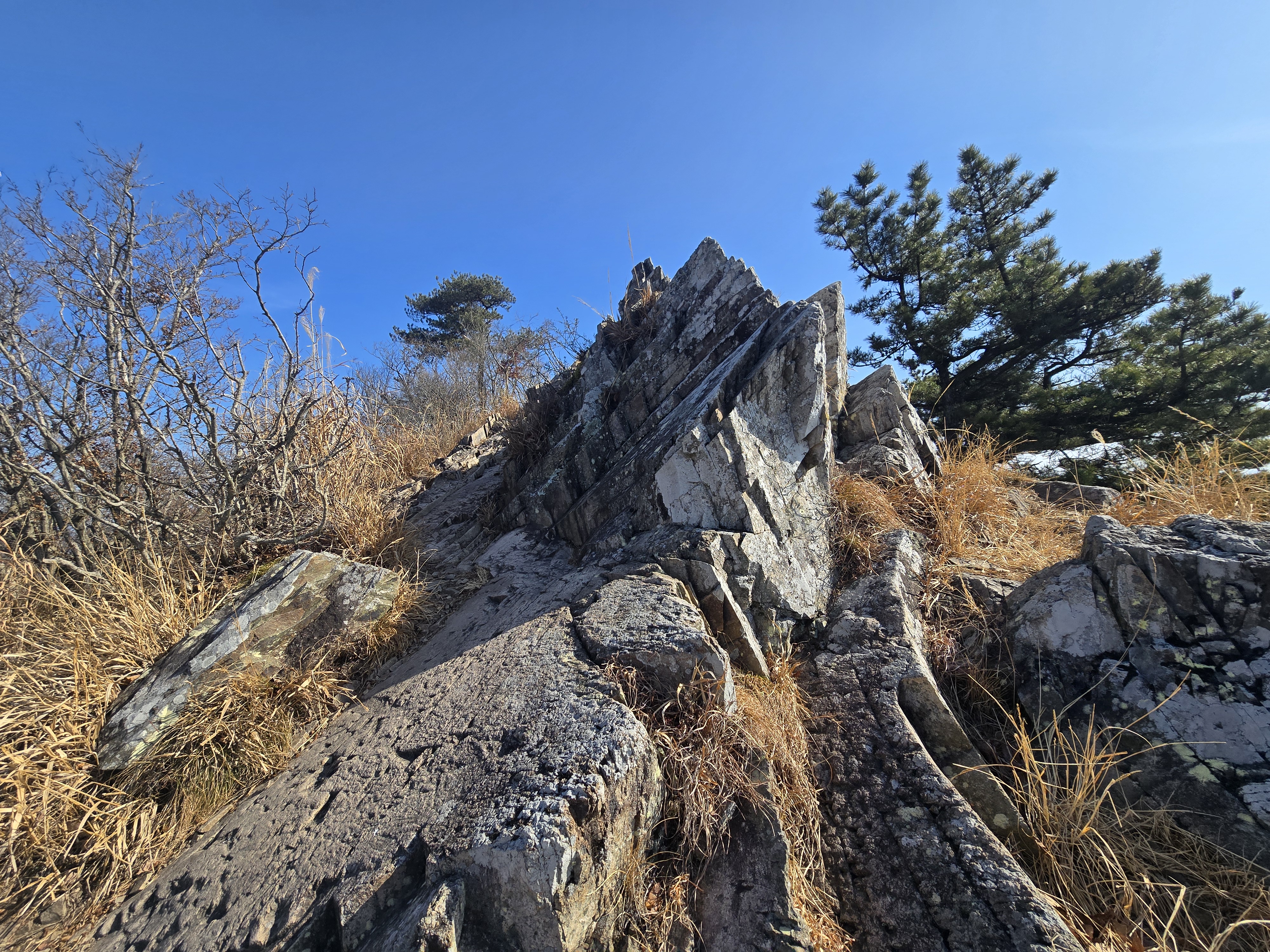 능선을 뒤덮은 바위는 수직절리도 있으며,