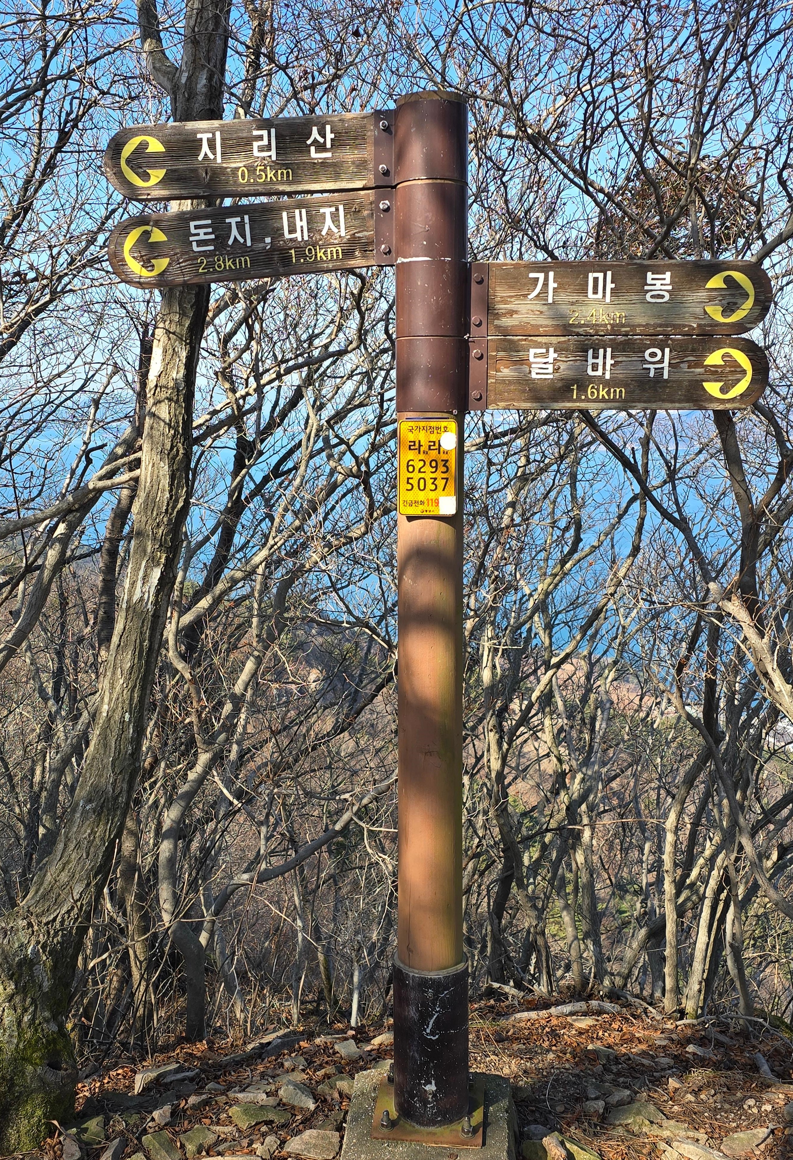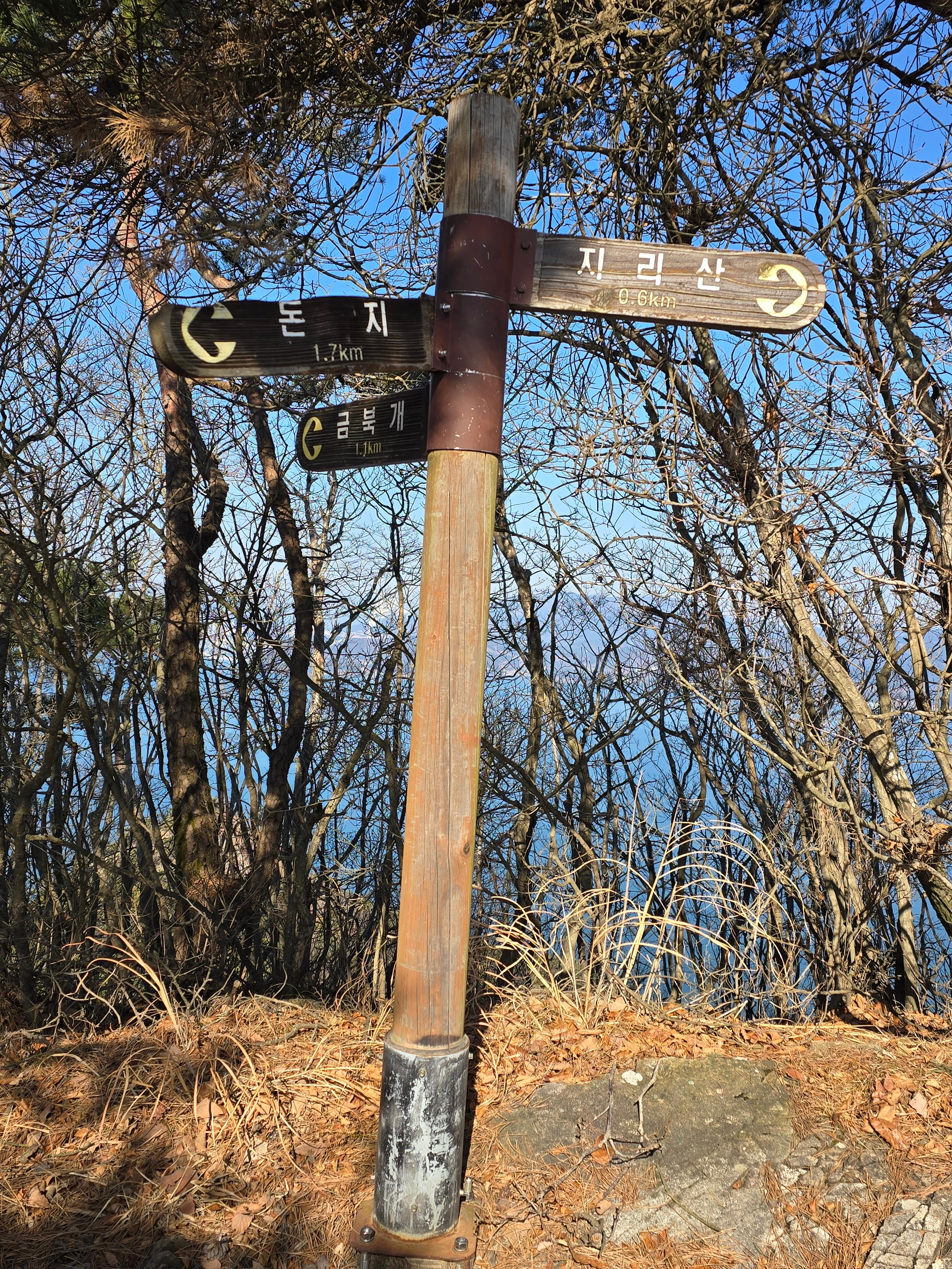 오른쪽 지리산(0.6㎞)으로 간다. 왼쪽은 금북개에서 올라오는 길이다.