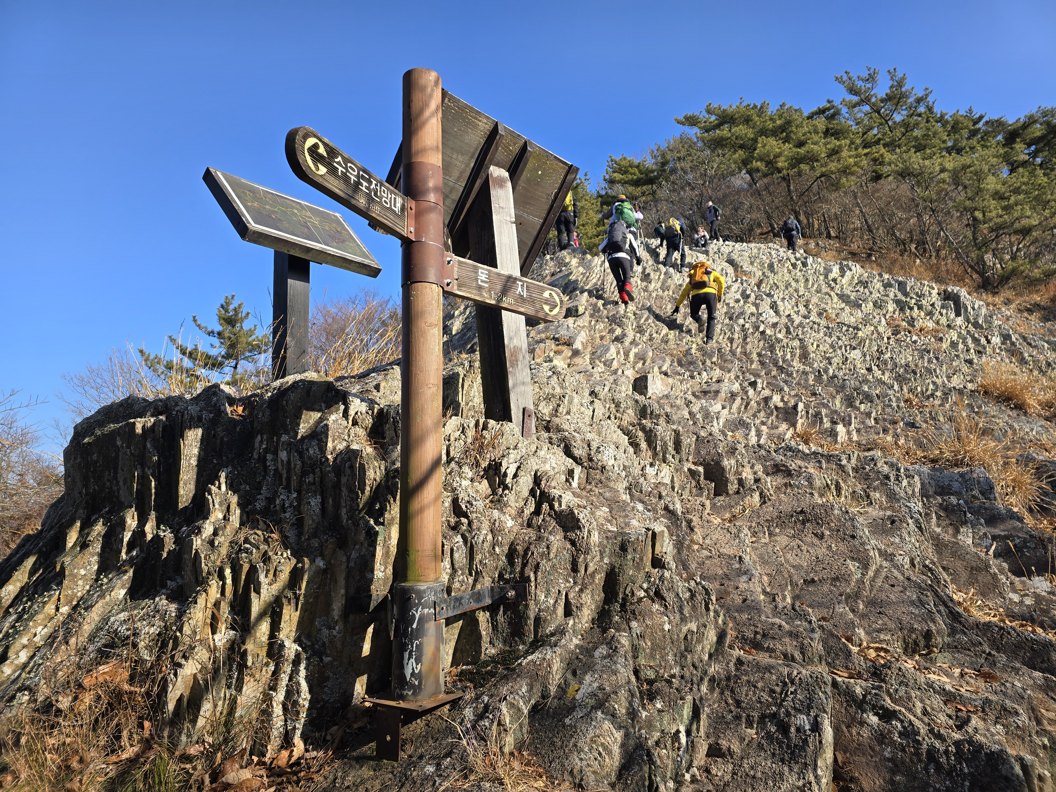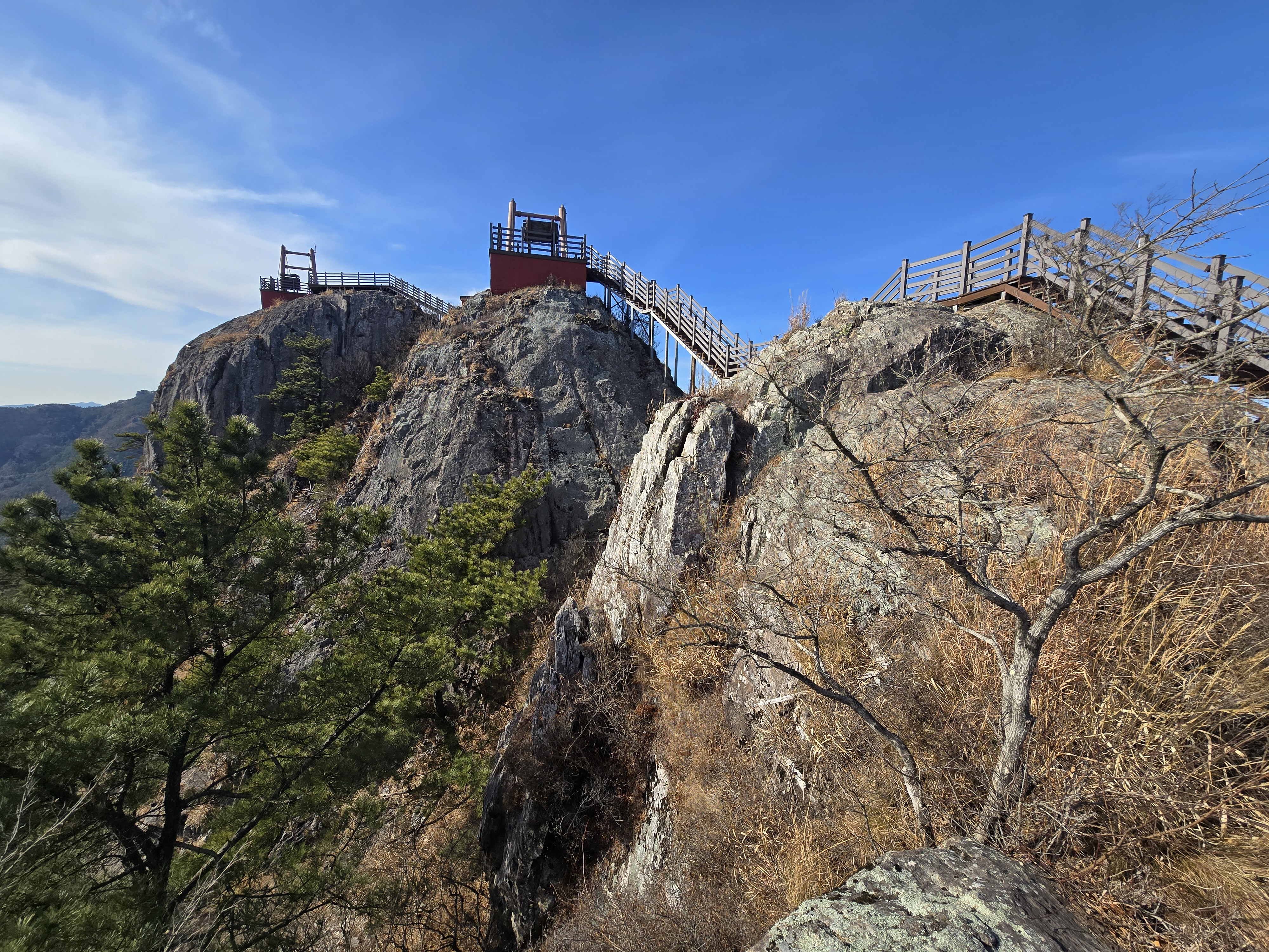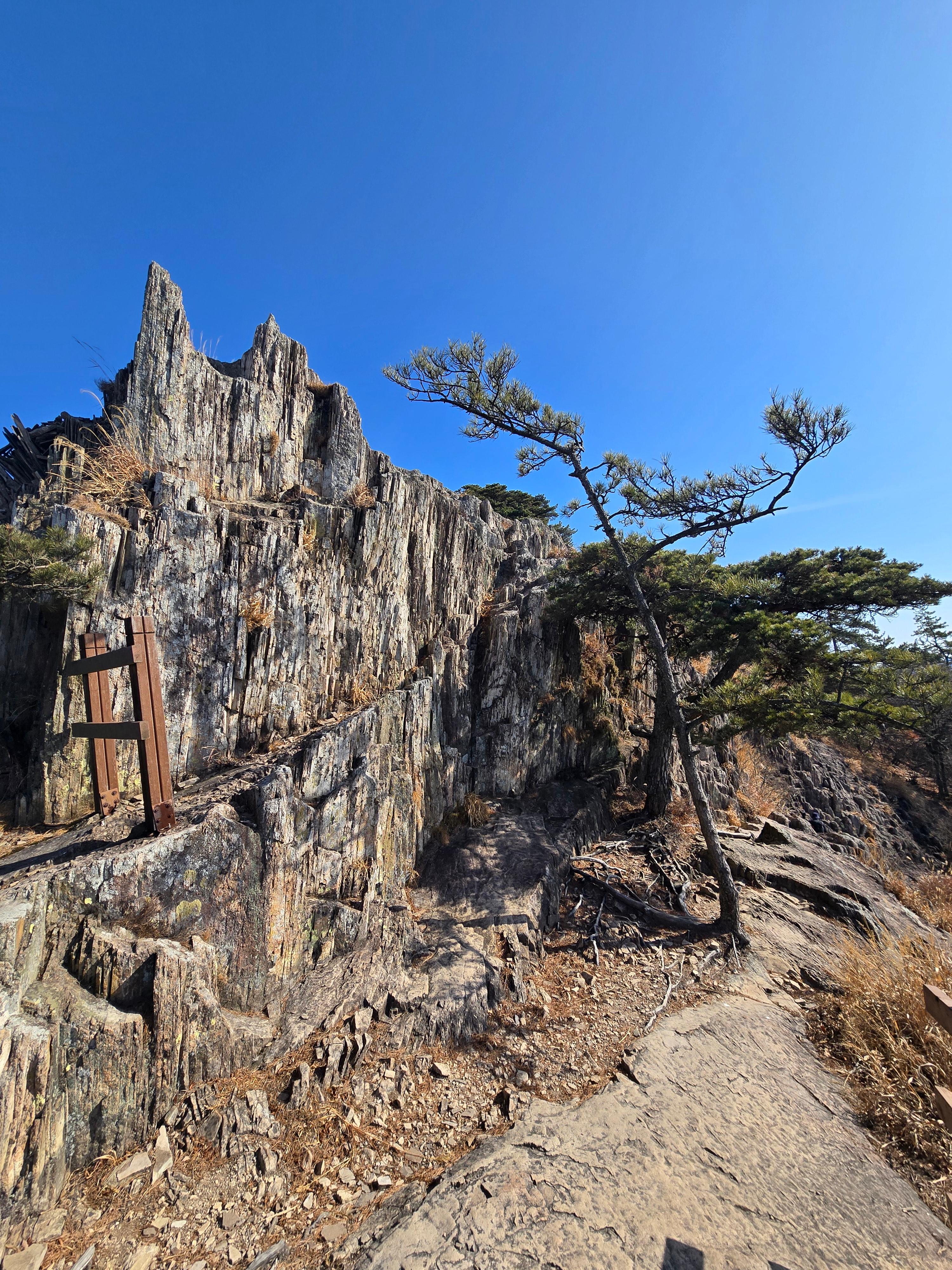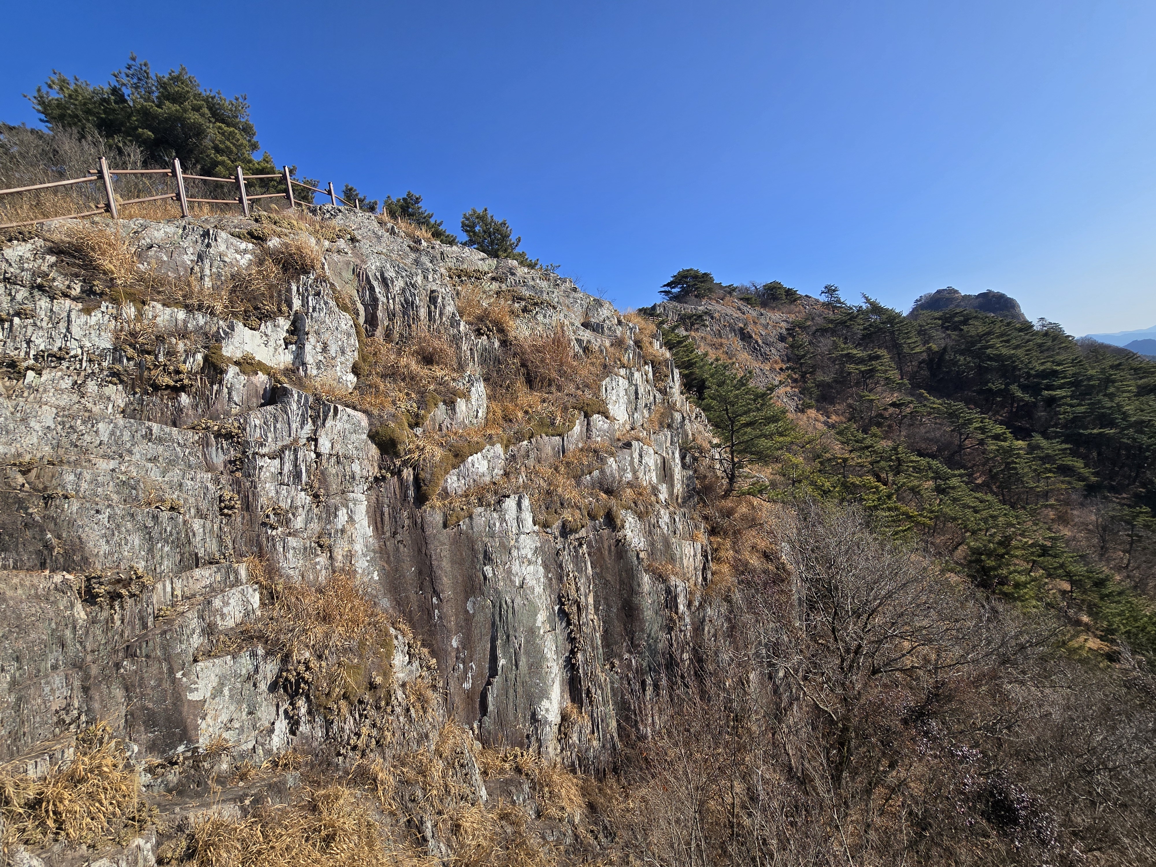 성벽을 연상시키는 바위 벼랑의 안전 목책을 따라 15분이면 이정표 갈림길이 나온다.