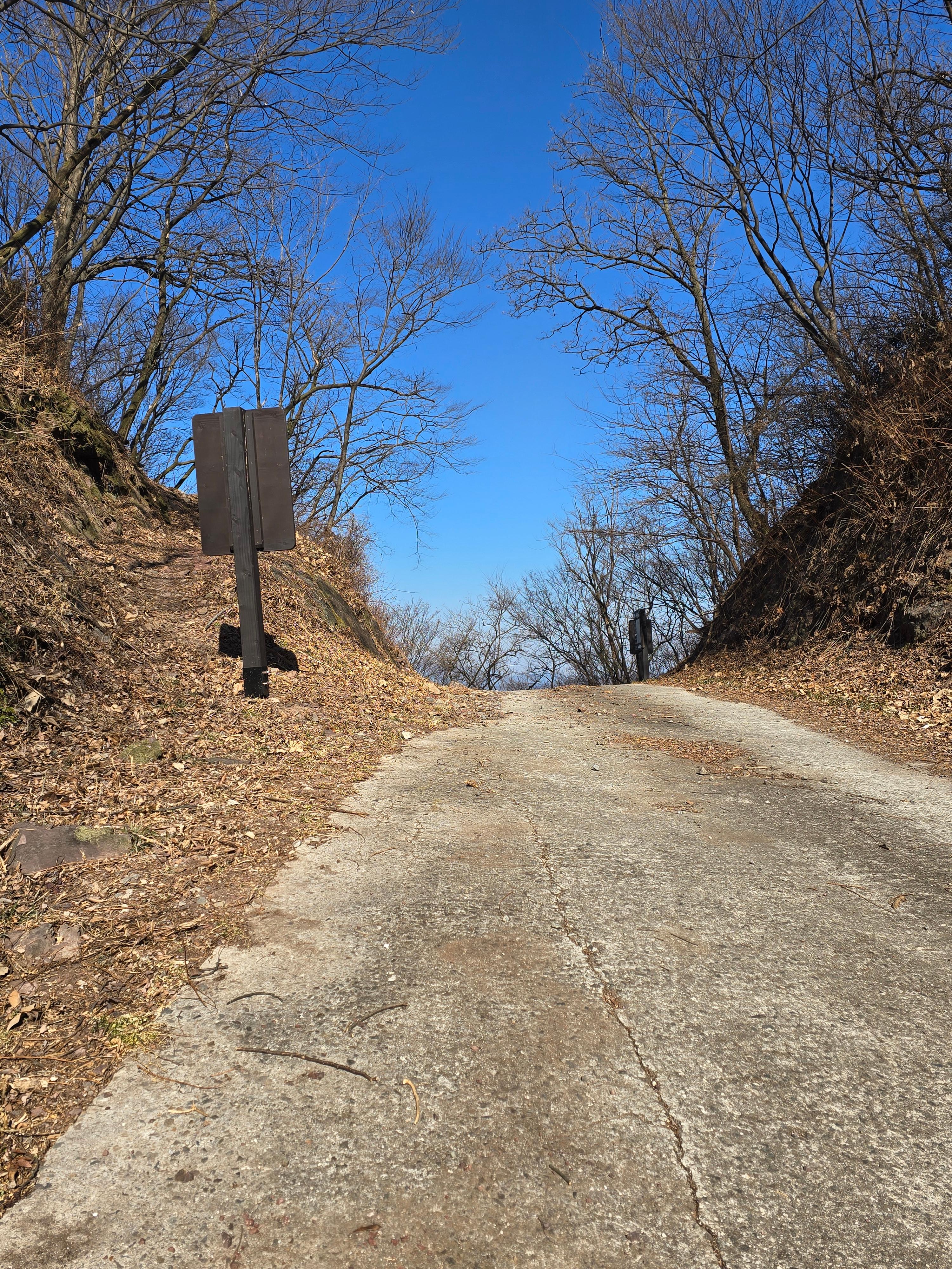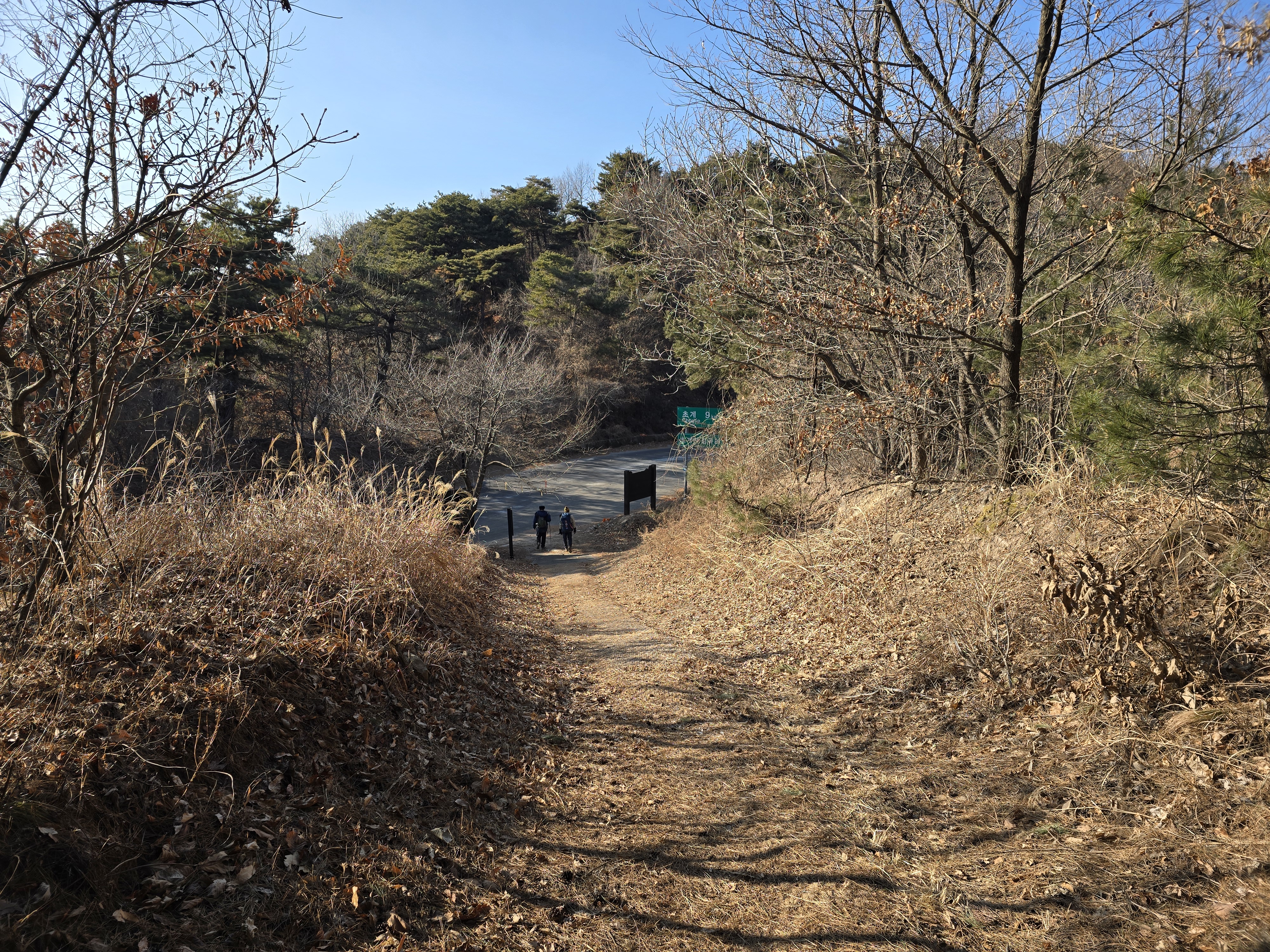 완만한 능선은 돌계단을 거쳐 약 25분이면 포장임도가 지나가는 홀로재에 내려선다.
