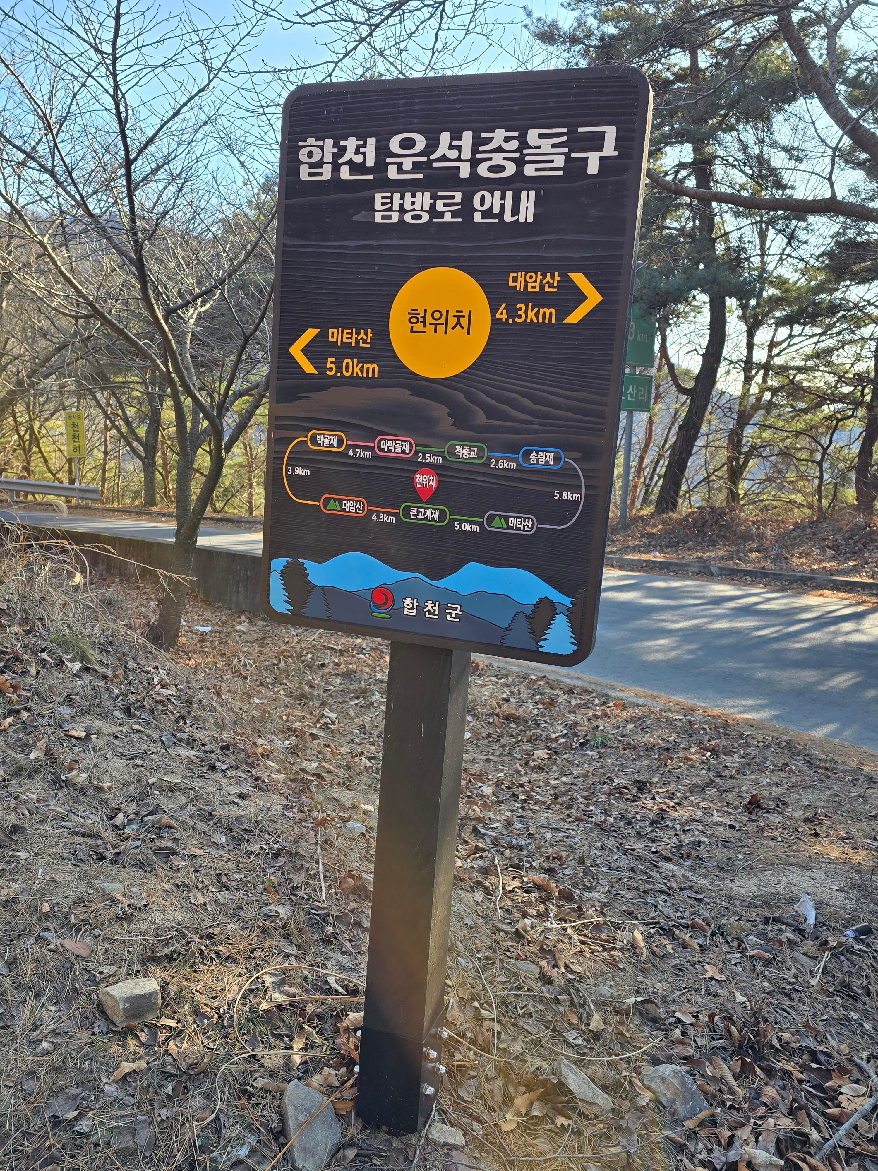 청덕면 방향 고갯마루 오른쪽에 합천운석충돌구 탐방로 안내도와