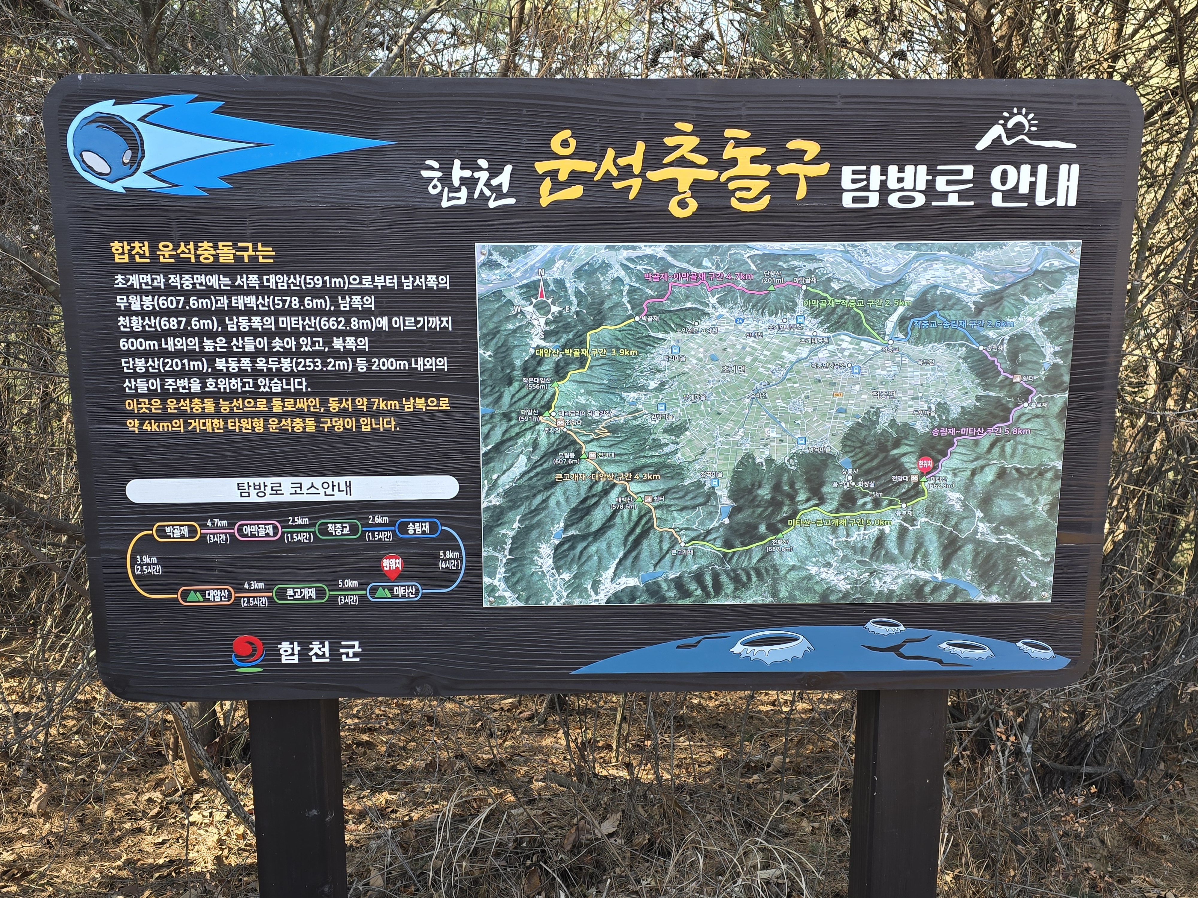 대암산 쪽에 서 있는 합천운석충돌구 탐방로 안내도