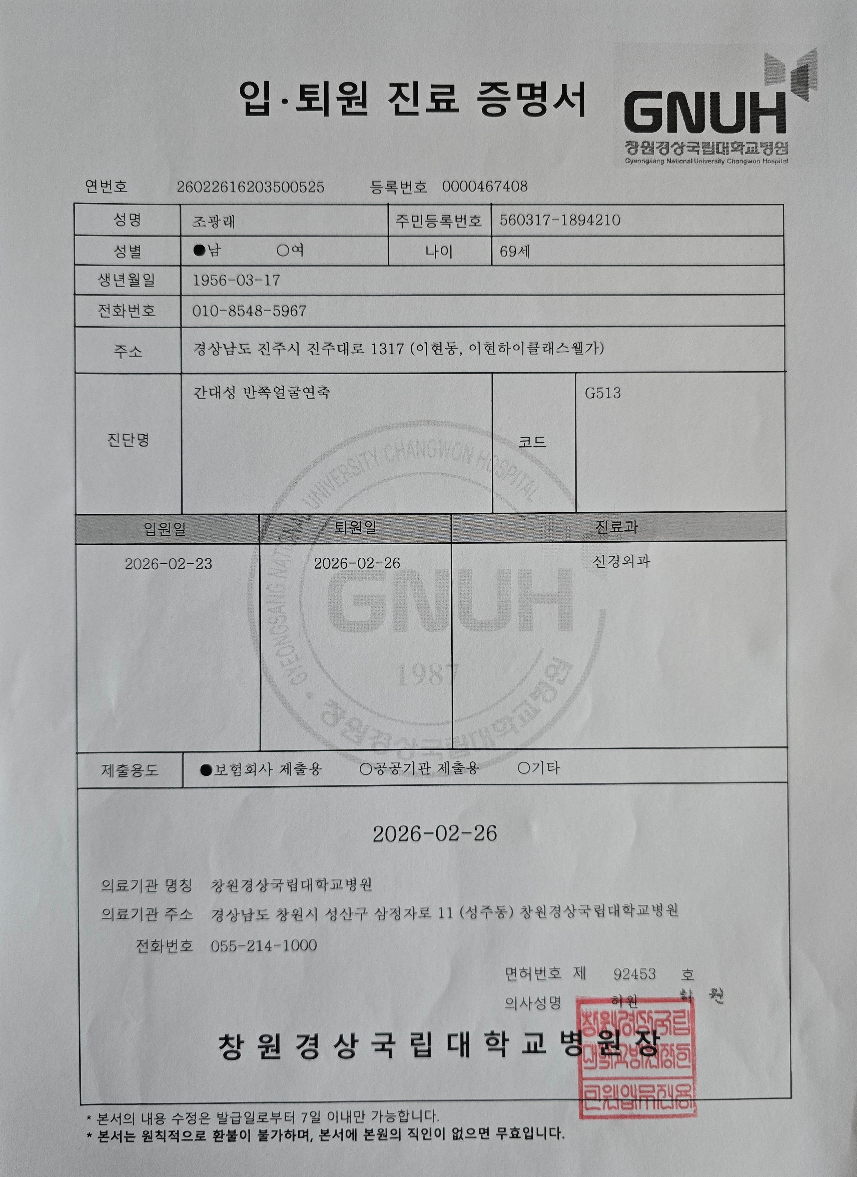 * 2026년 2월 23일(월요일) 창원경상국립대학교병원 입원