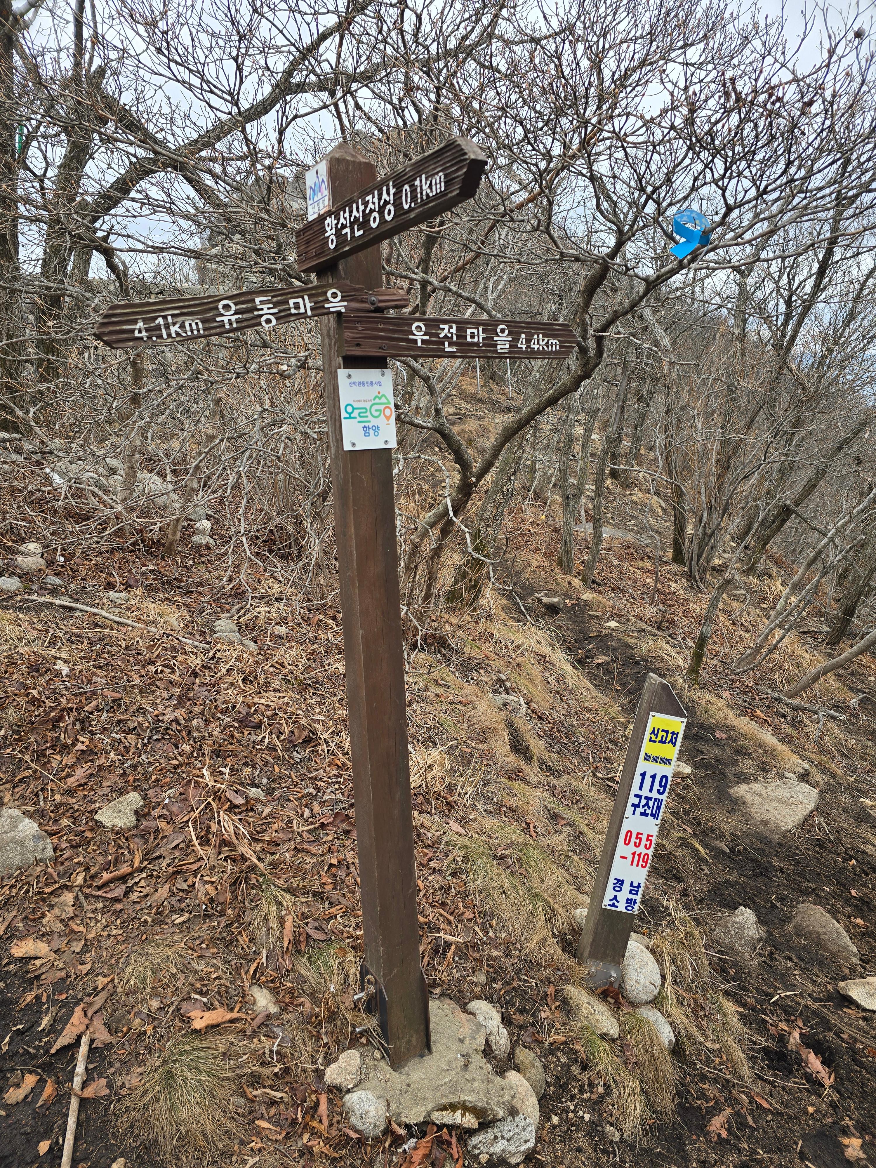 10:46 유동마을 갈림길(유동마을 3.4km · 황석산정상 0.6km ·