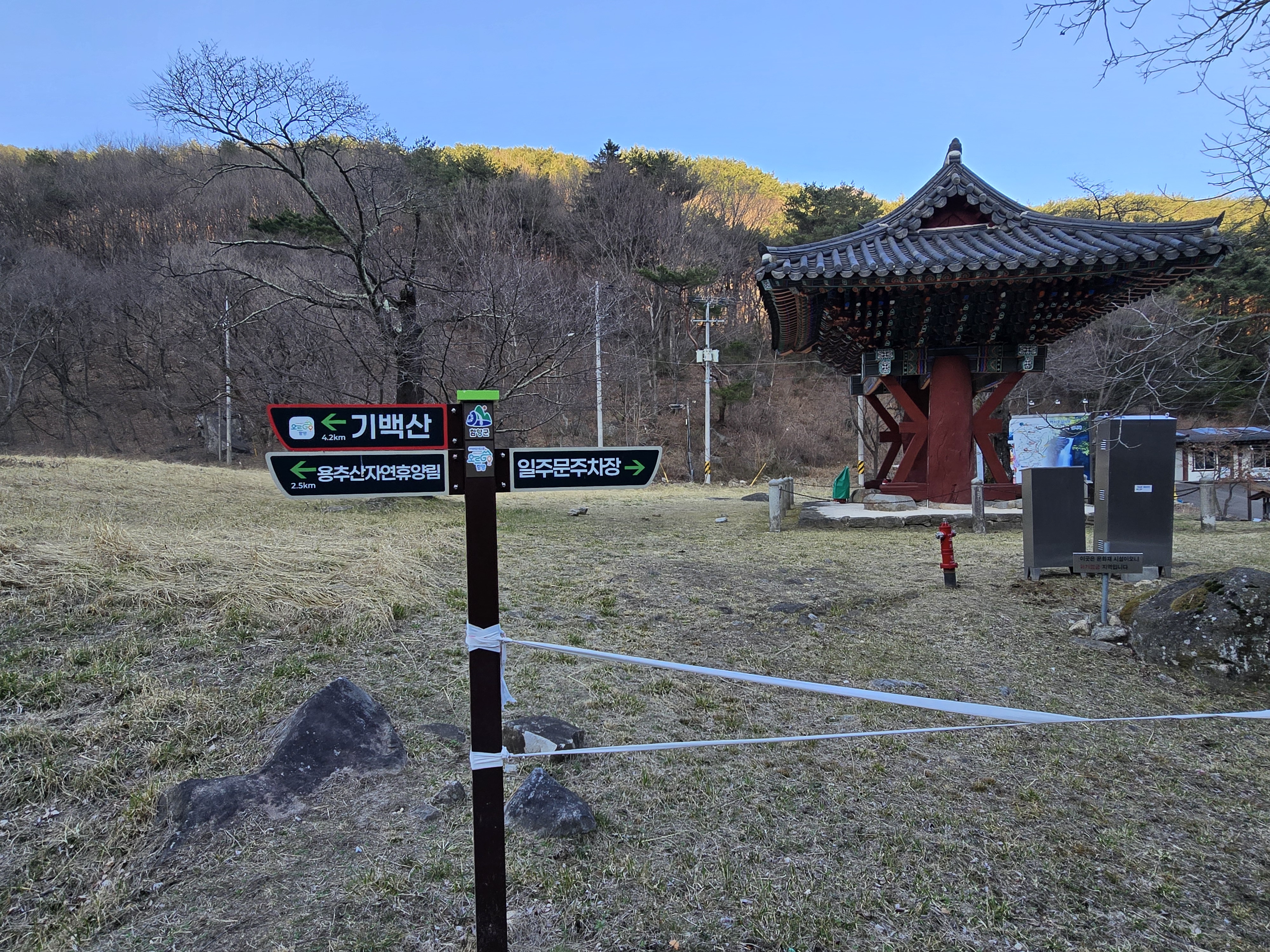 아니나다를까 황색 이정표는 기백산 4.0km · 일주문 0.2km를 가리키는 걸.