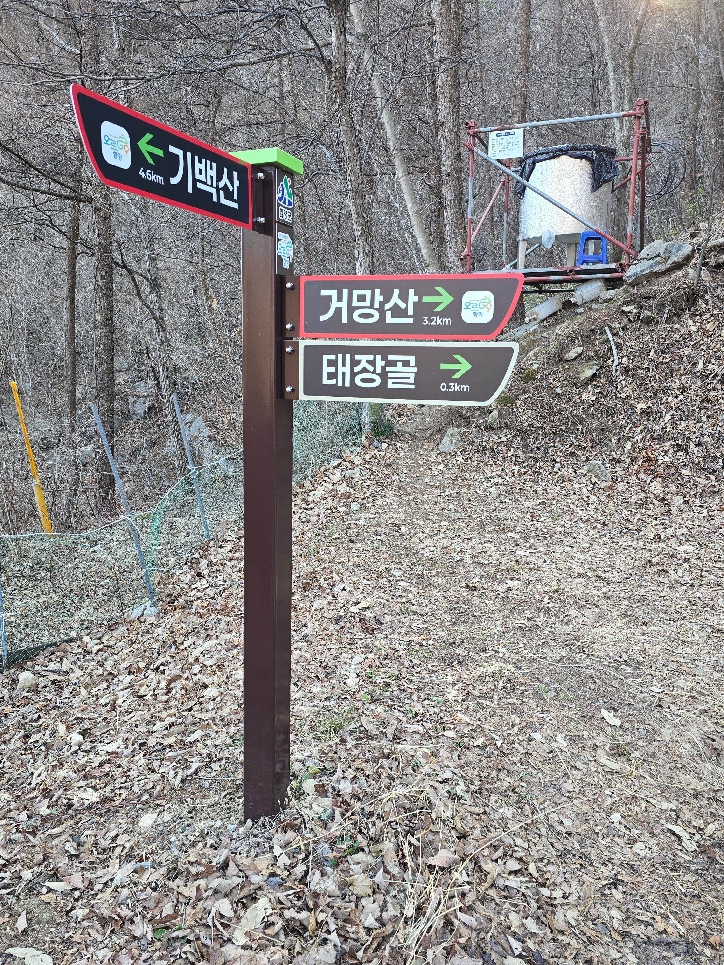 기백산 4.6km · 거망산 3.2km · 태장골 0.3km를 가리키는데,