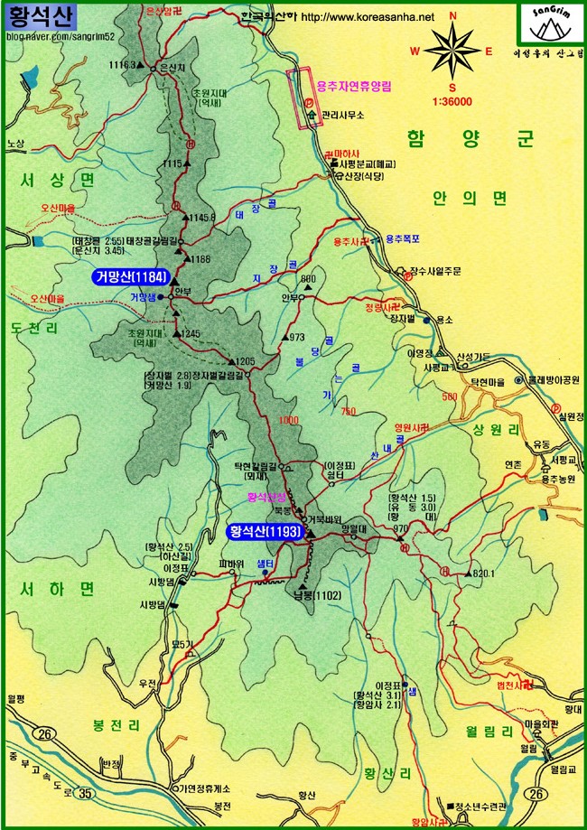 황석산 1-6지점: 큰골 2.2km · 황석산 2.5km · 거망산 1.8km)