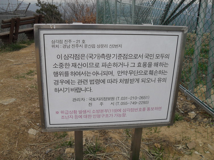 자그마한 정상석과 삼각점(진주 21)이 있으며, 방송중계탑 등 많은 시설물이 정상을 차지하고