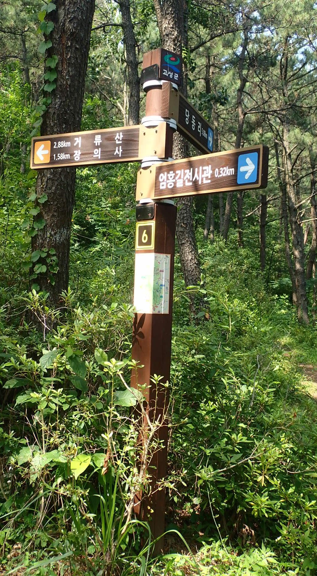 황사정 1.75km·당동리 4.95km·엄홍길전시관 0.55km)로 이어지는 갈림길이고