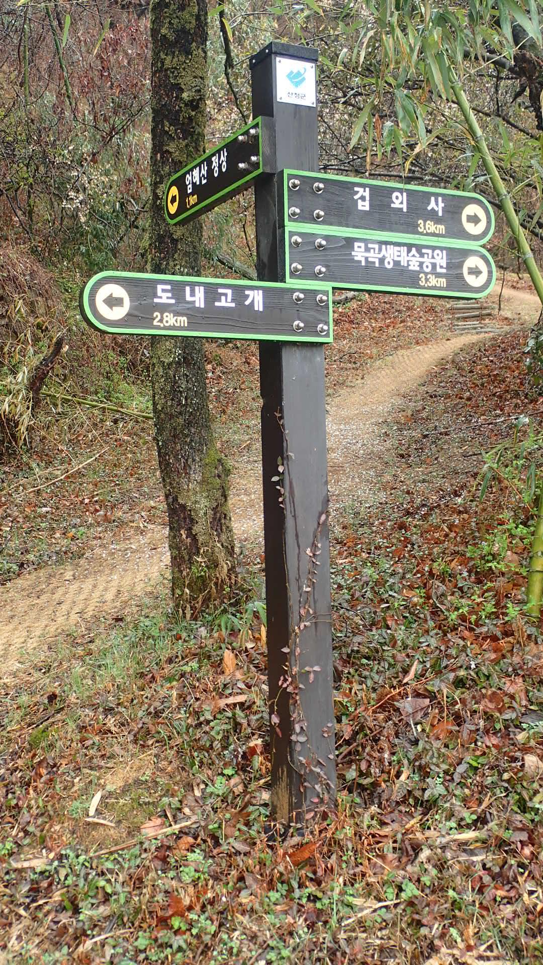 엄혜산 정상 1.1km · 도내고개 2.8km · 겁외사 3.6km · 묵곡생태숲공원 3.3km라는데,