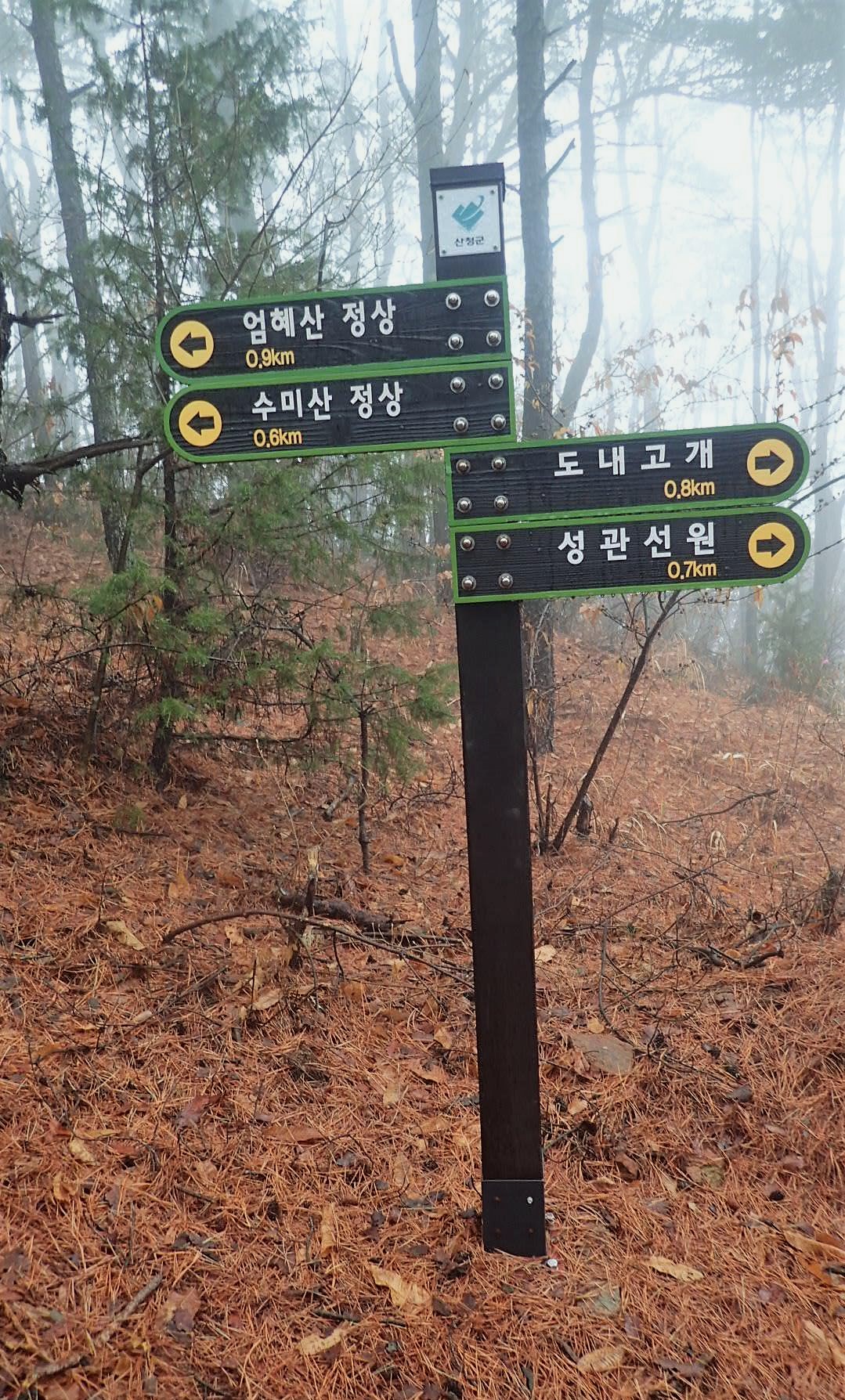 엄혜산 정상 0.9km·수미산 정상 0.6km·도내고개 0.8km·성관선원 0.7km라니까,