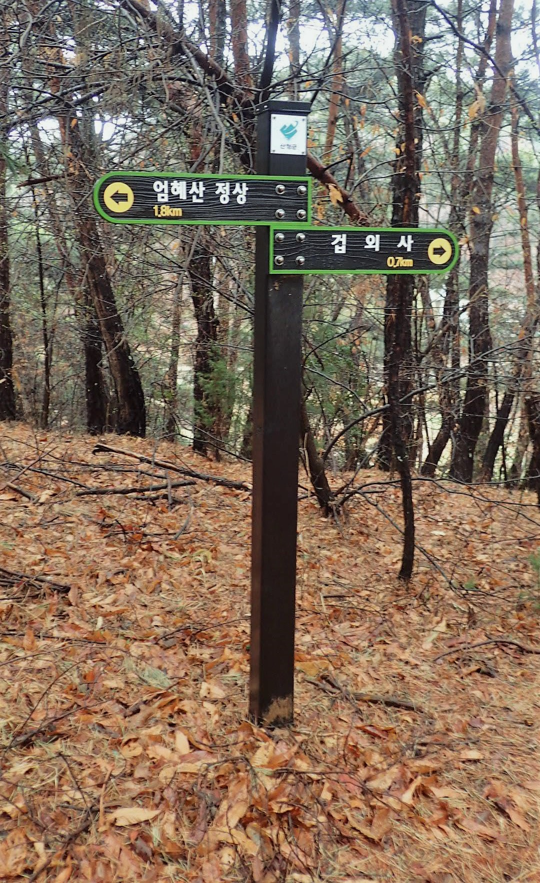 엄혜산 정상 1.8km · 겁외사 0.7km를 가리키고